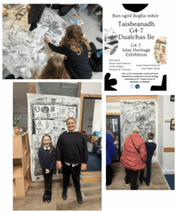 Tha sinn air a bhith ag ionnsachadh mu Dhualchas Ìle còmhla ri Tobar an Dualchais. Thàinig Floraidh is Raonaid dhan sgoil gus ar cuideachadh gus mapa cultair a dhèanamh. Dh’ionnsaich sinn mu Chalum Cille agus na Gille-brìghde, agus chleachd sinn gual-fhiodha gus ar n-ionnsachadh mu Ìle a chur air a’ mhapa. Chòrd e rinn a bhith ag ionnsachadh mu na sgeulachdan agus na h-àiteachan cudromach anns a’ choimhearsnachd againn.Chaidh an obair againn a thaisbeanadh aig an Ionad Ghàidhlig Ìle mar phàirt de Sheachdain na Gàidhlig, agus bha sinn moiteil ar n-ealain agus ar n-ionnsachadh a cho-roinn leis a’ choimhearsnachd.We have been learning about Islay’s heritage in partnership with Tobar an Dualchais. Floraidh and Raonaid came to the school to help us create a cultural map. We learned about St Columba and the Oyster Catchers, and we used charcoal to show our learning about Islay on our cultural map. We enjoyed learning about the stories and important places in our community.Our work is being displayed at the Islay Gaelic Centre as part of Seachdain na Gàidhlig, and we are proud to share our art and learning with the community. -