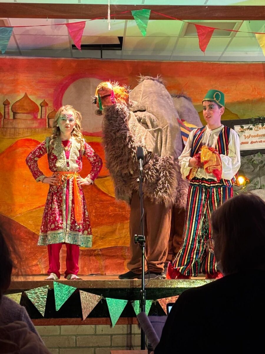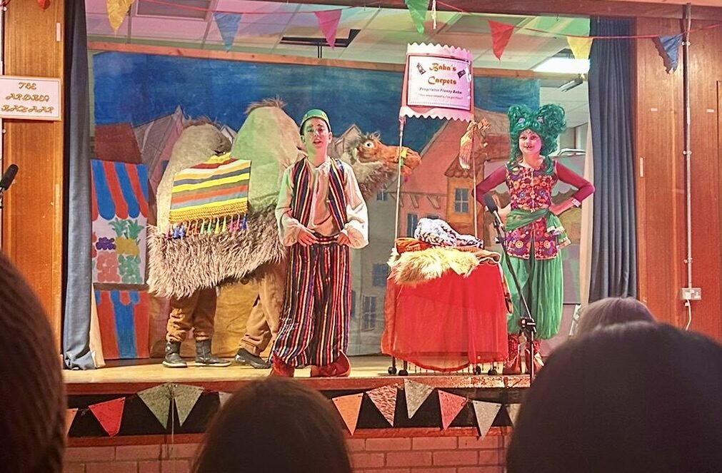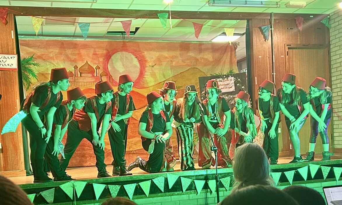 One of the greatest things about this panto was the costumes and props for this panto were stunning and made each character stand out and add to the personality, atmosphere and overall vibe of the panto, though some props were not as sturdy and a bit flexible, like the spears used by the guards the props still looked amazing! The backstage staff had amazing teamwork and were able to swap out different sets concomitantly! And managed to help all the cast members walk (or run,) on stage at the right time this was amazing and helped the cast make less mistakes! All the cast/pupils were amazing and sounded so confident while delivering their lines this helped the audience understand better, when the pupils are confident, they are louder, bolder and clearer, which is much better for the audience than mumbling or stuttered lines which I heard none of throughout this panto everyone seemed so confident and amazing!