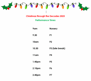 Christmas Cheer is an opportunity for each year group to perform on stage to an audience. As it is our 50th year what a better way to celebrate than singing songs from the decades. We warmly invite parents and family members to come along on the morning of Friday 19th December, 5-10 minutes, before the allocated time slot of your child’s performance e.g. P1 and watch them perform. Here is the running order of the day: