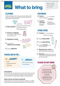 This needs to be packed in one suitcase/holdall as the children MUST be able to carry their bag from the bus to the accommodation. All items of clothing should be clearly named.
