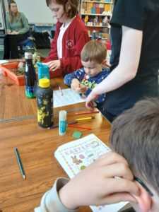 The Pine Martens and Mountain Hares were joint winners of the Challenge and Mountain Hares overall winners for this term. This afternoon they chose to have a cartoon, snacks and draw along  for their House Treat.