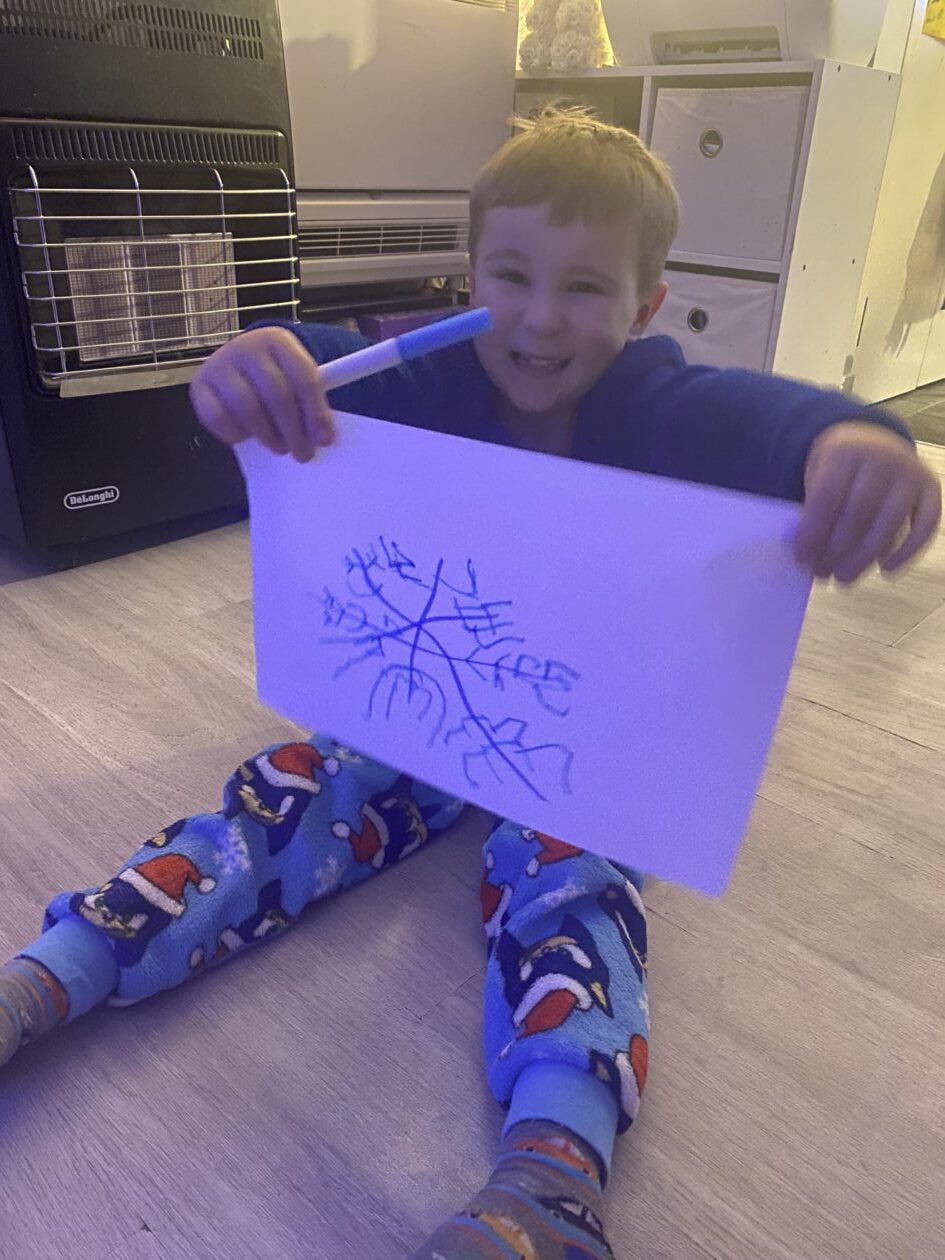 Look closely at the snow outside- ask a parent to help you zoom in on a camera app on a phone or tablet. What can you see?  Can you draw a snowflake?