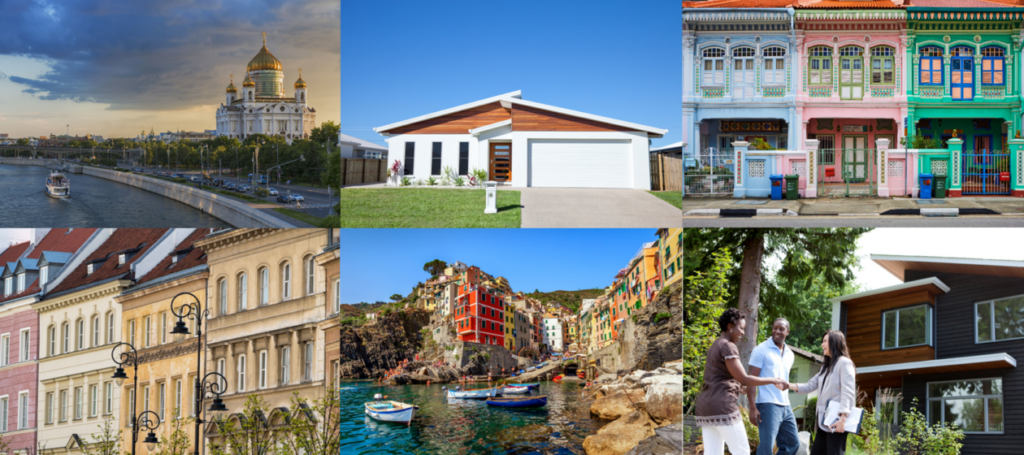 Display pictures of different homes, architecture, families, food, animals, countryside etc from around the world.