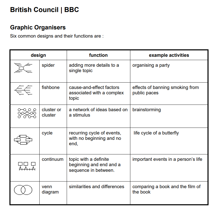 Pupils complete information in a diagram, chart, table etc to provide a visual overview of the relationship between information. Graphic organisers are also helpful in supporting understanding and as a tool to scaffold ideas and writing.