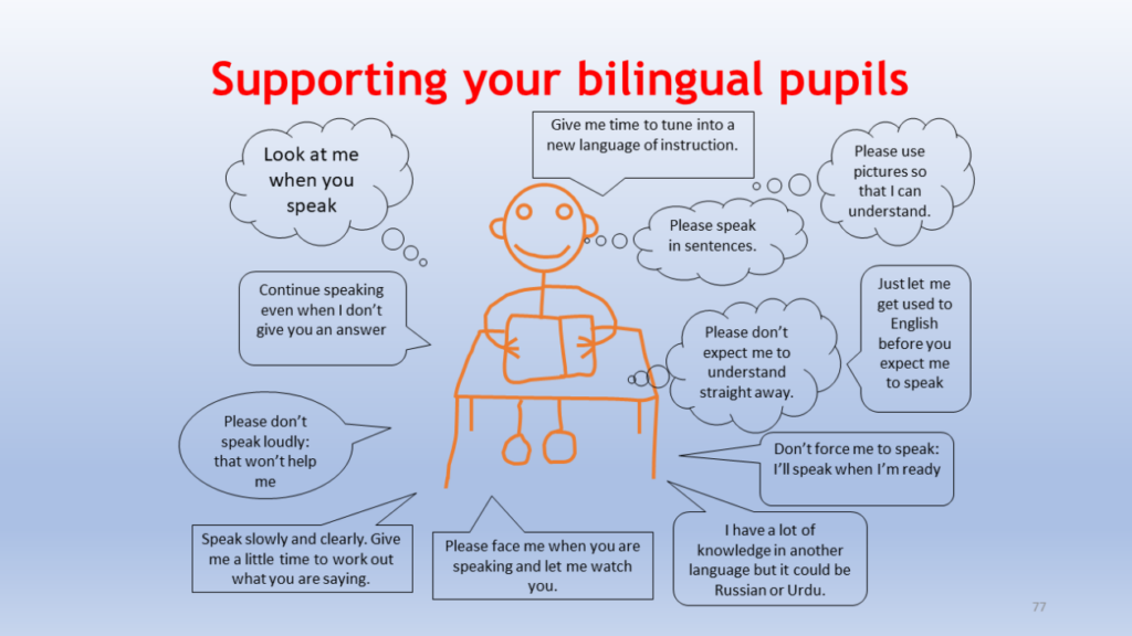 Include the pupil in a group with peers who are a good model of language and behaviour. Provide context for new vocabulary through demonstration, visuals etc. using target vocabulary in spoken and written form alongside practical examples for context.