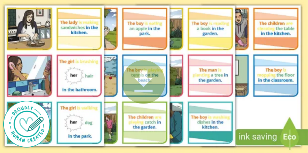 This can be supported by having a picture of each character with the associated pronouns that refer to them. Visual guides to prepositions of place are also helpful.