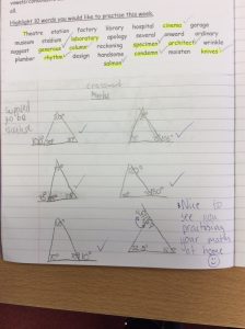 Primary 7 were learning about the angles in triangles and in supplementary angles. This child decided to draw their own triangles and calculate missing angles.