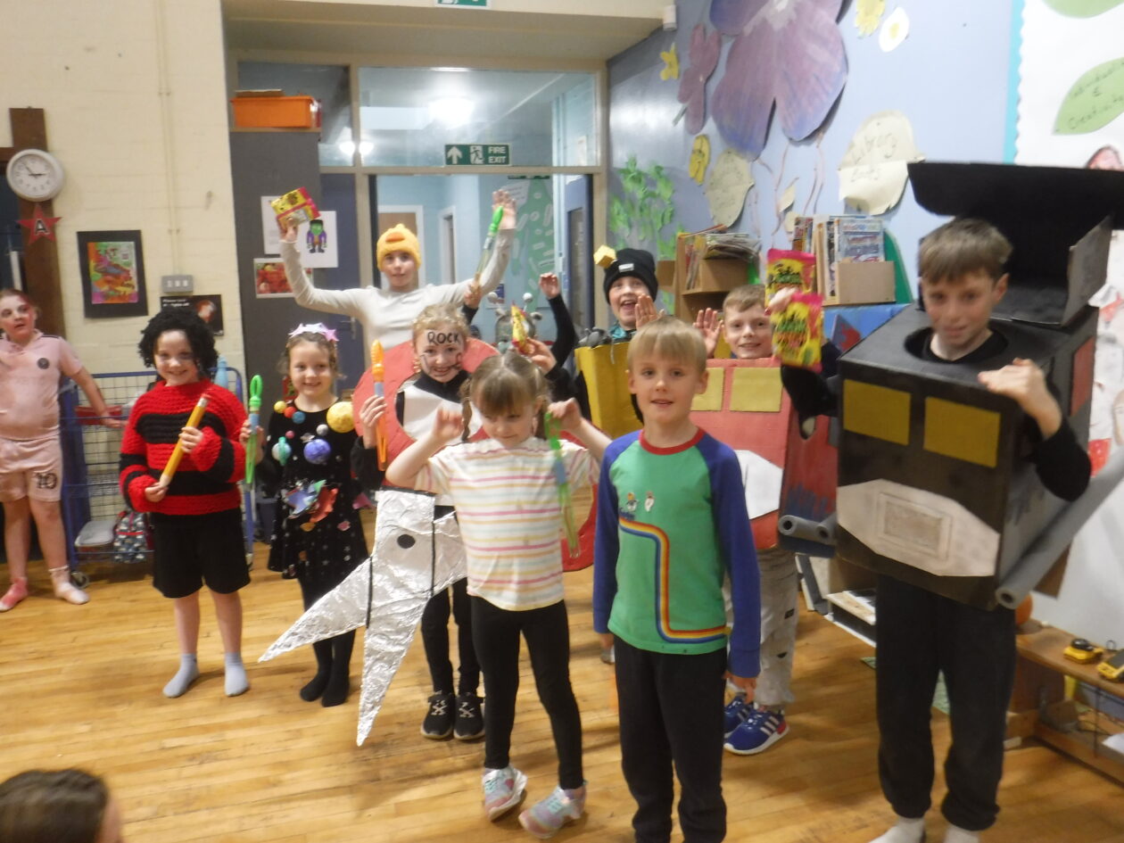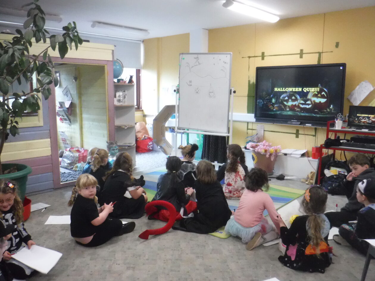 On Friday we had a Halloween day. We carved pumpkins, had a disco, had a costume parade, played games, did a quiz and made potions. Aubray- My favourite thing was the disco. Isla W- I liked doing the pumpkin carving, I made mine into a face. Amy- I really loved the quiz, I got 13 out of 15. Some of the costumes people dressed up in were- devils, witches, zombies, a plant pot, a spider, an alien and Dennis the Menace.