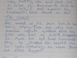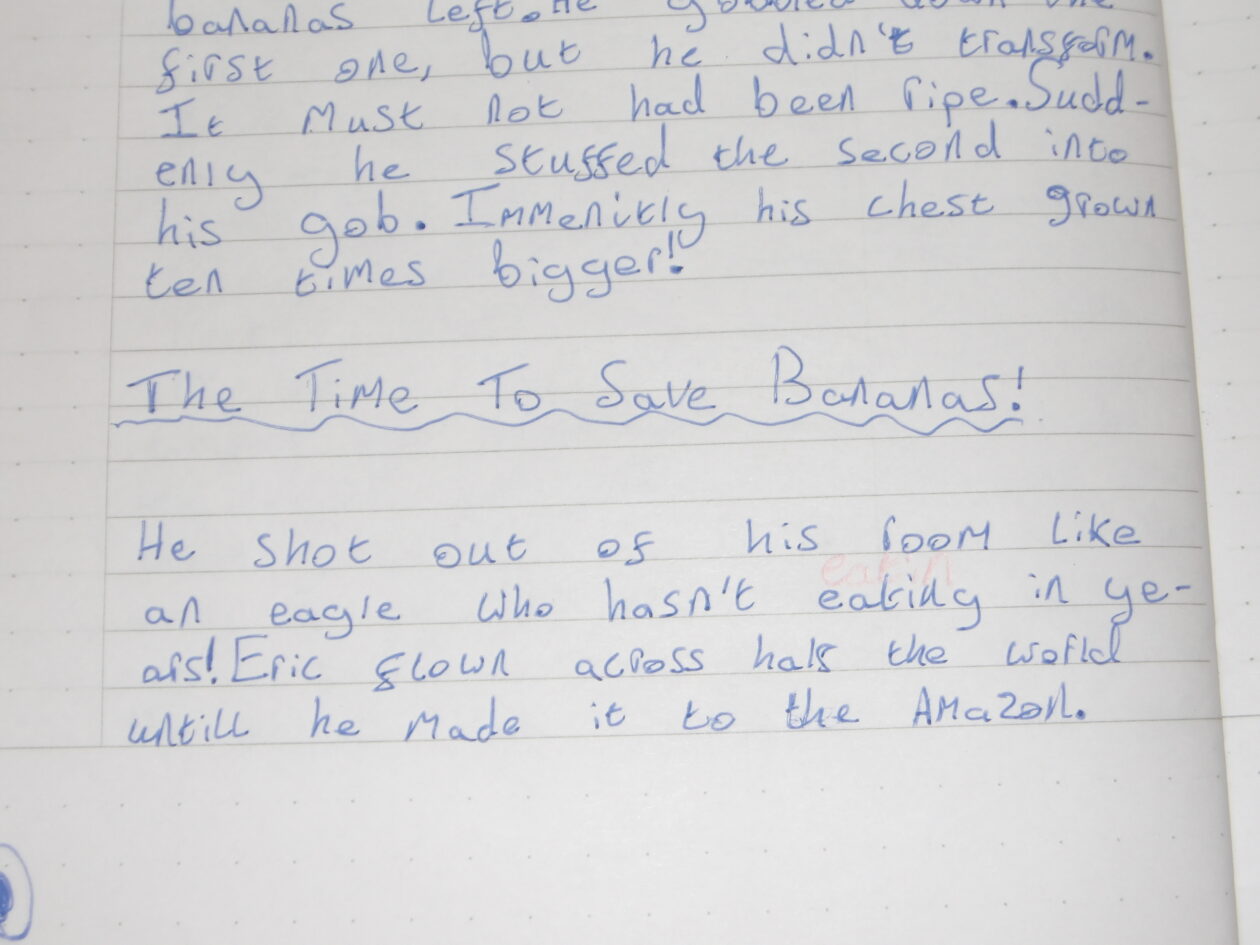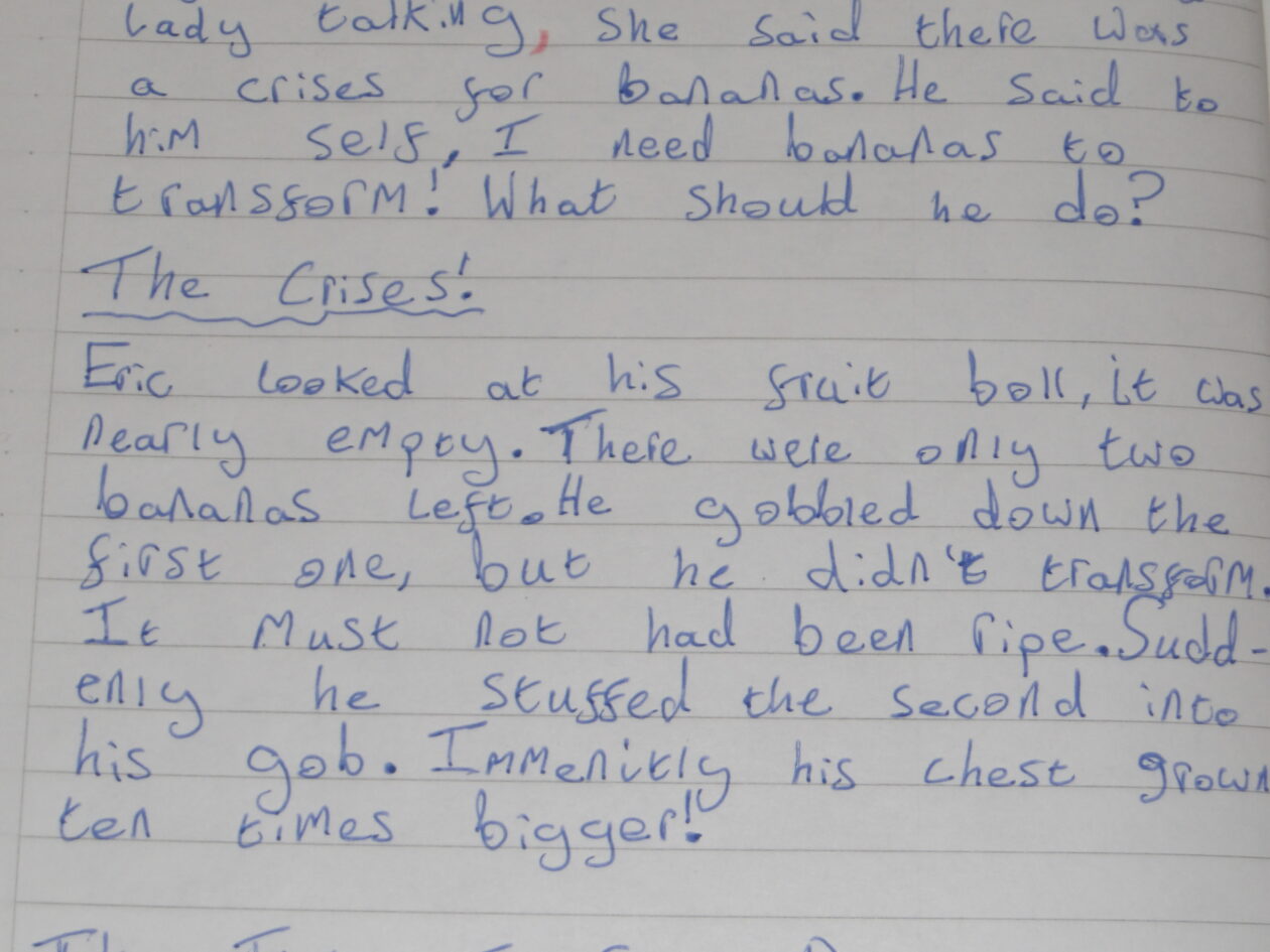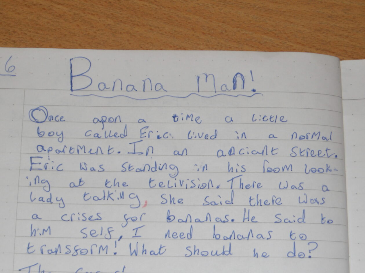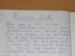 Whassup Olly!, It’s Daniel. I’m going to tell you right now what Iv’e done in literacy without you. Today in literacy we wrote about Banana man. Below is what I writ this morning, it isn’t finished yet but it will be soon. It goes from Banana Man, to The Crises then to The Time To Save Bananas!