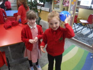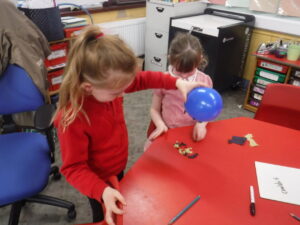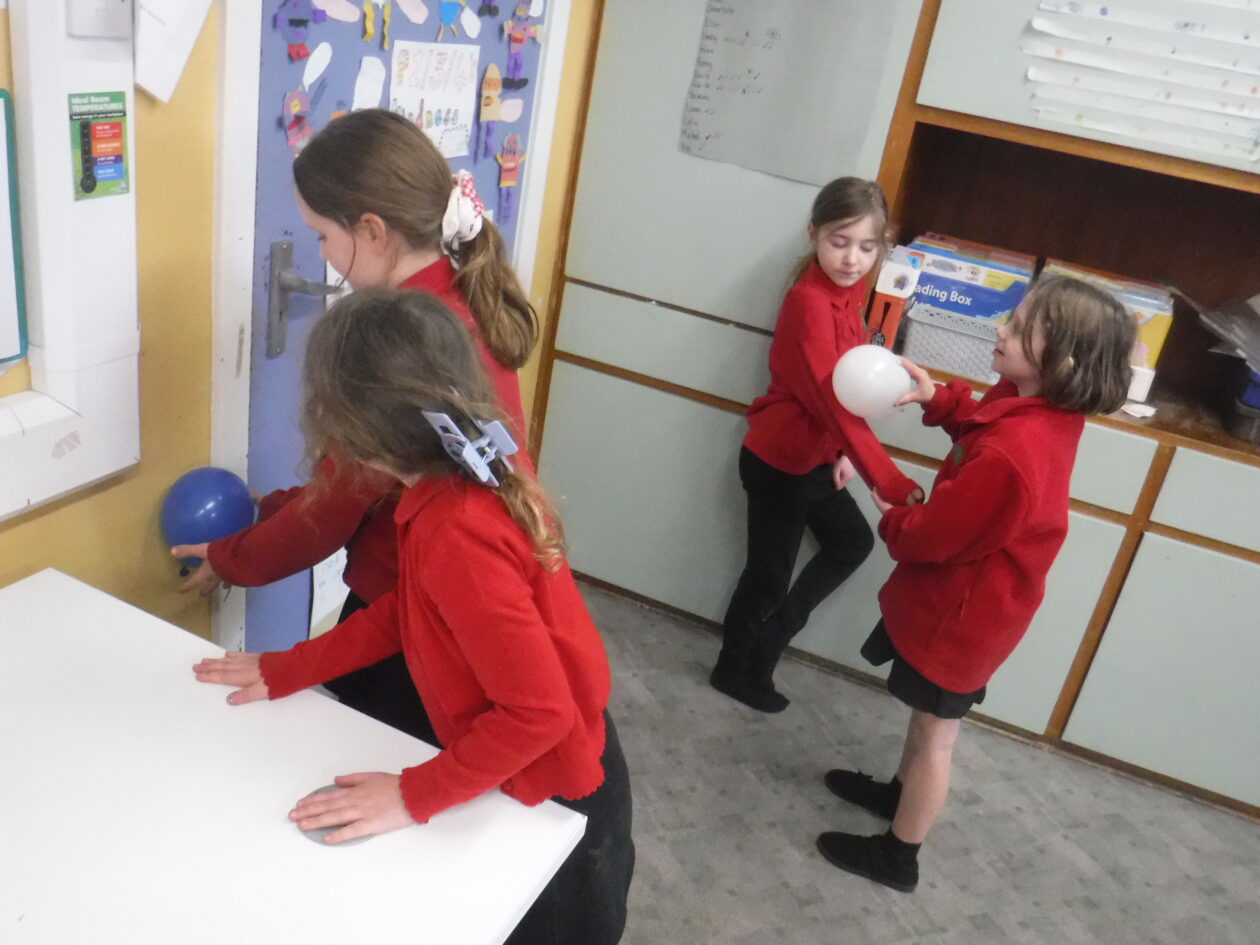 We rubbed balloons on our hair and clothes and stuck them to the wall.