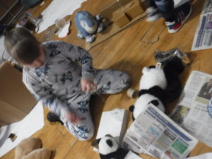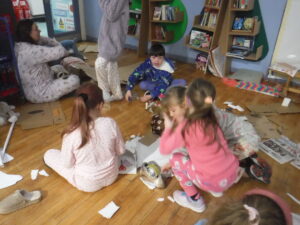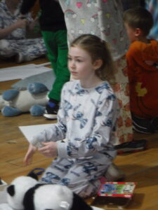 When we were making our pyjamas we were in a team or with a partner. After we had to tidy up the paper we read a book. Then we had a pillow fight. we had 2 benches out then we had 2 people got on the bench with their pillow. After they get up on the bench they wait until someone says, ” GO!” Then they start to hit each other with the pillows.