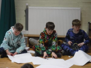 Then we did mace a pyjama  out of your self you were in a partner so they could draw a round you. Then ad patterns. I did mountains and a TV and among us. And fortnight on a TV and black and write on the mountains. And I added my name as well.