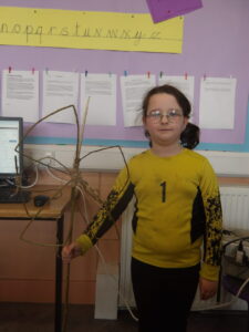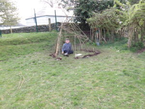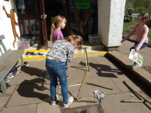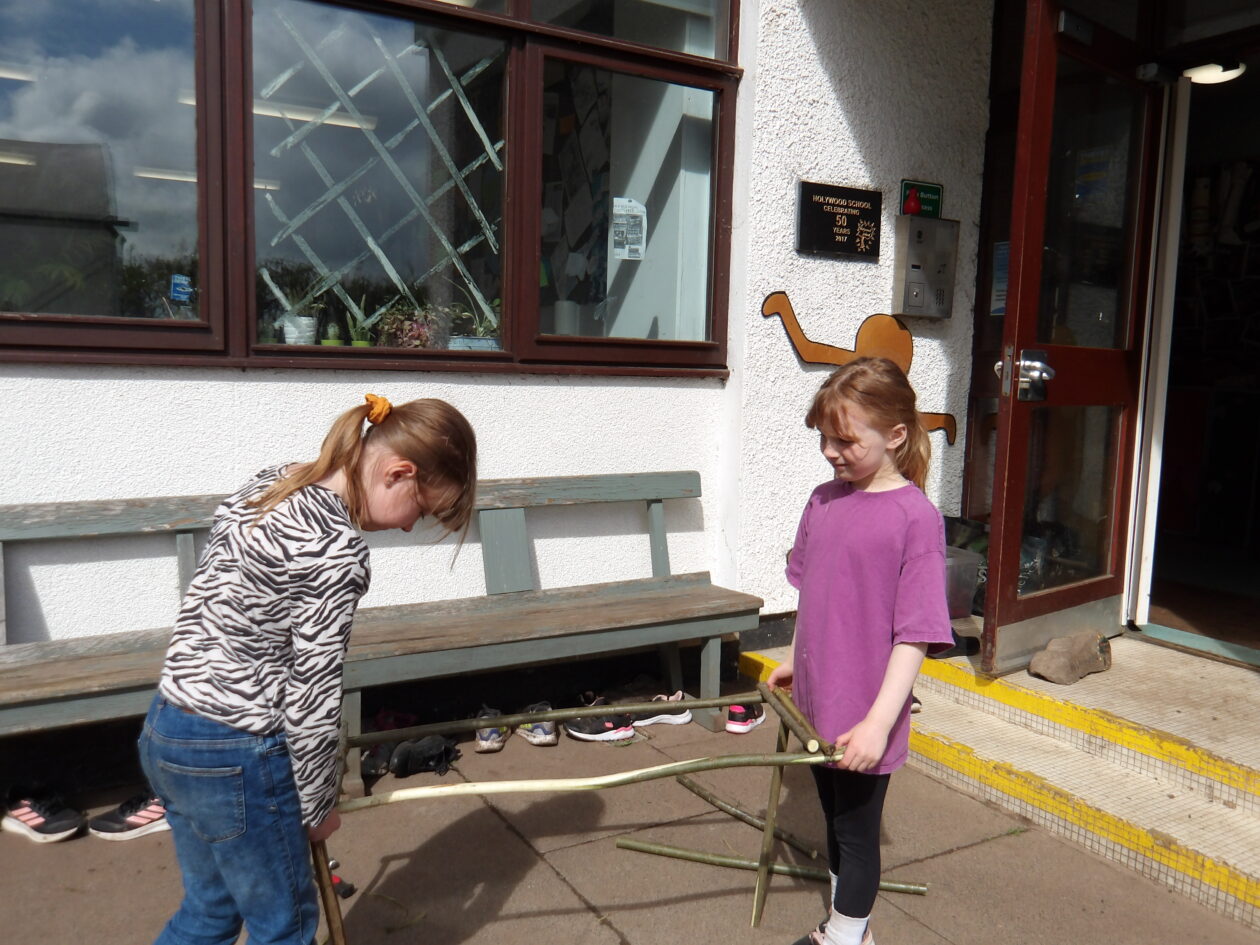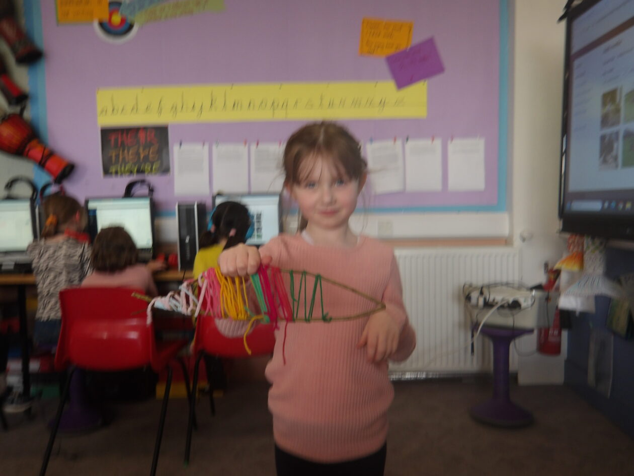 he play ground we made willow fish or a willow chair. we maid a fish.in First t we got a bit of willow and bent it in to a fish shape. Then we rapt it all around with wool. it was so fun. by Lola and Isla w