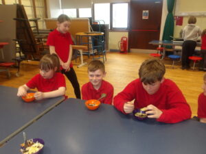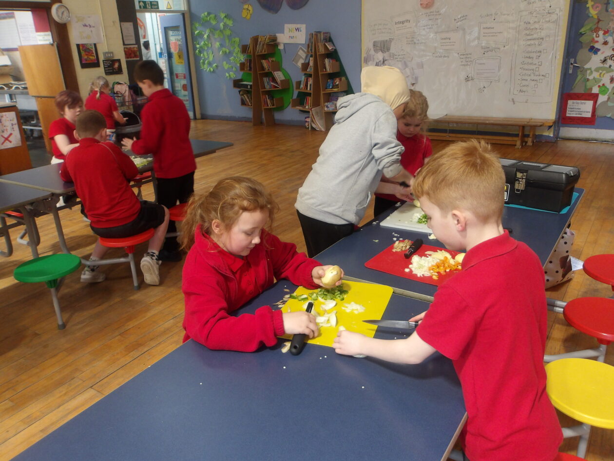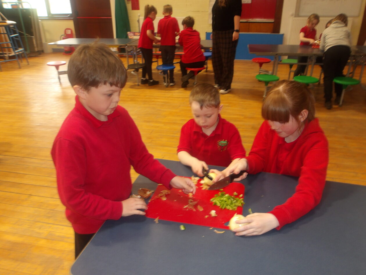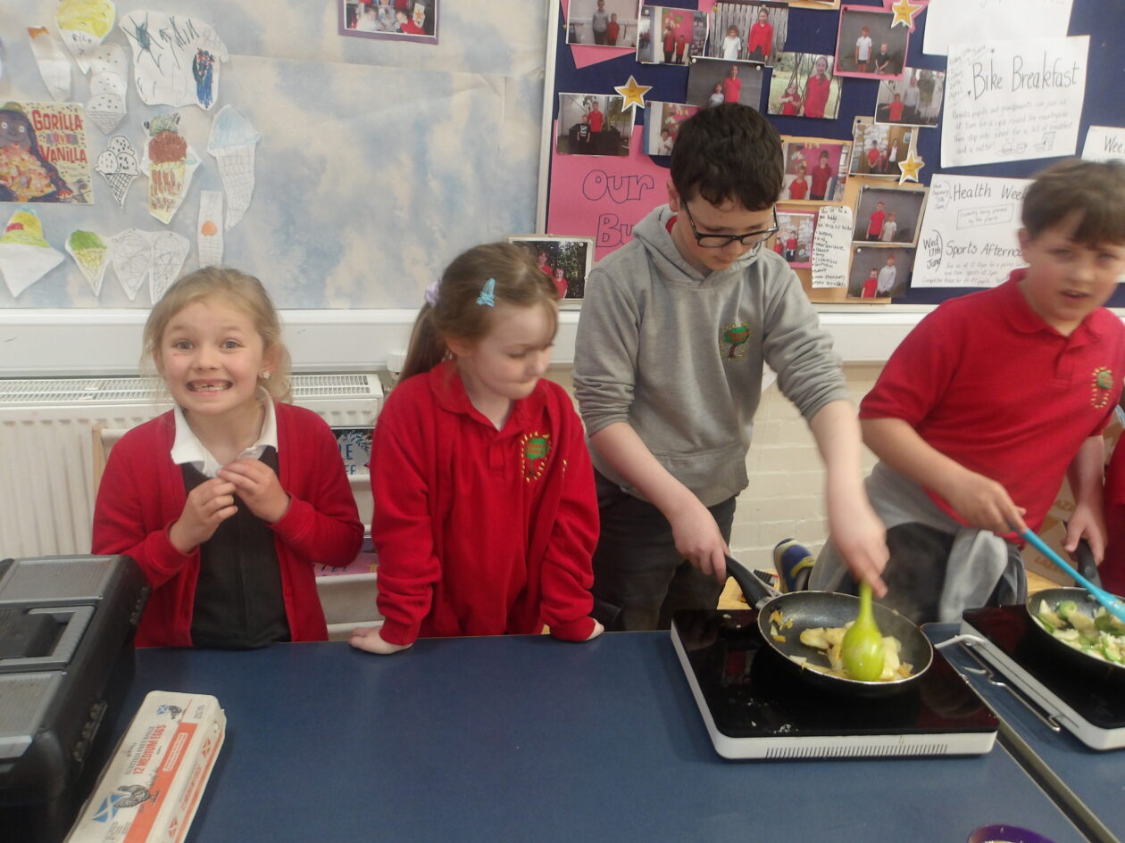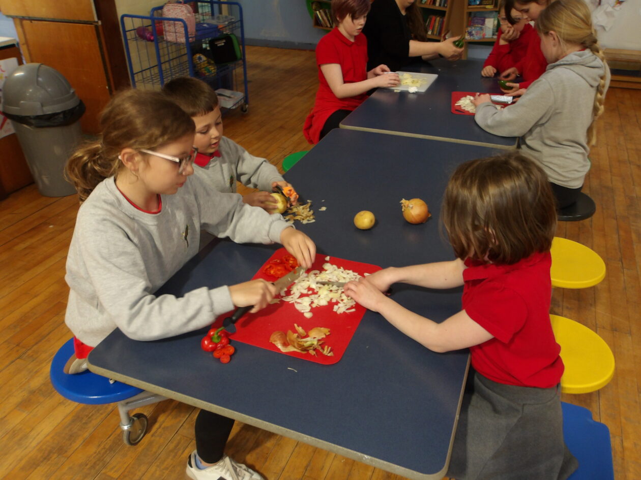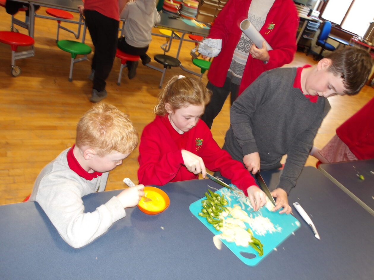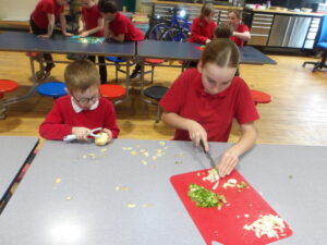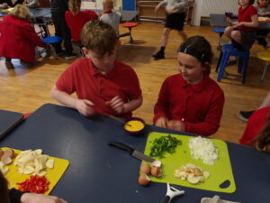 We were making spanish omelettes. We used potatoes, onions and peppers. We were in groups of three in a mix of year groups with a p 1 a p 2- 4 and a p 5 6 7. We had to chop all the veg and put them all in a pan. It turned out like scrambled eggs.
