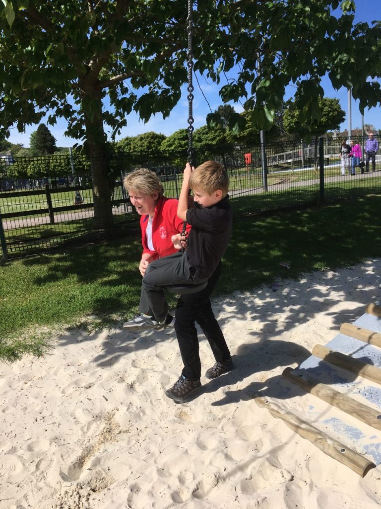 Mrs Smith using her muscles to pull Kaiden
