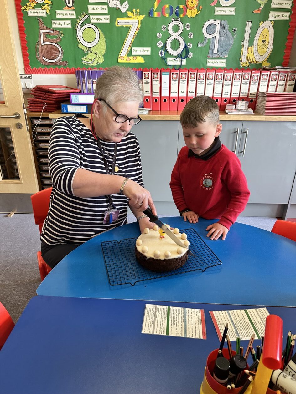 Gregor supervised Mrs Kyle as she cut the cake
