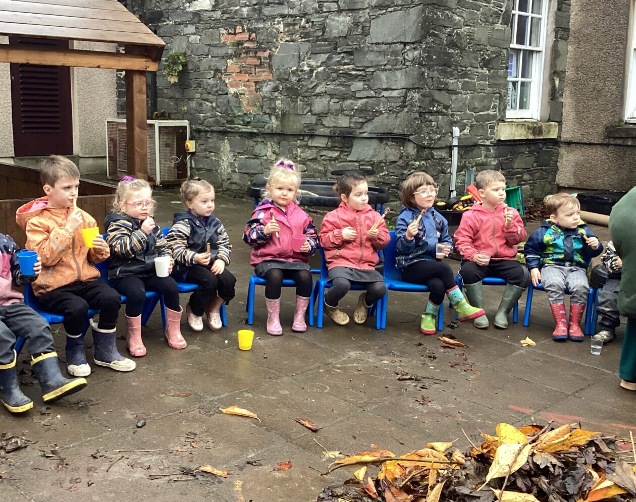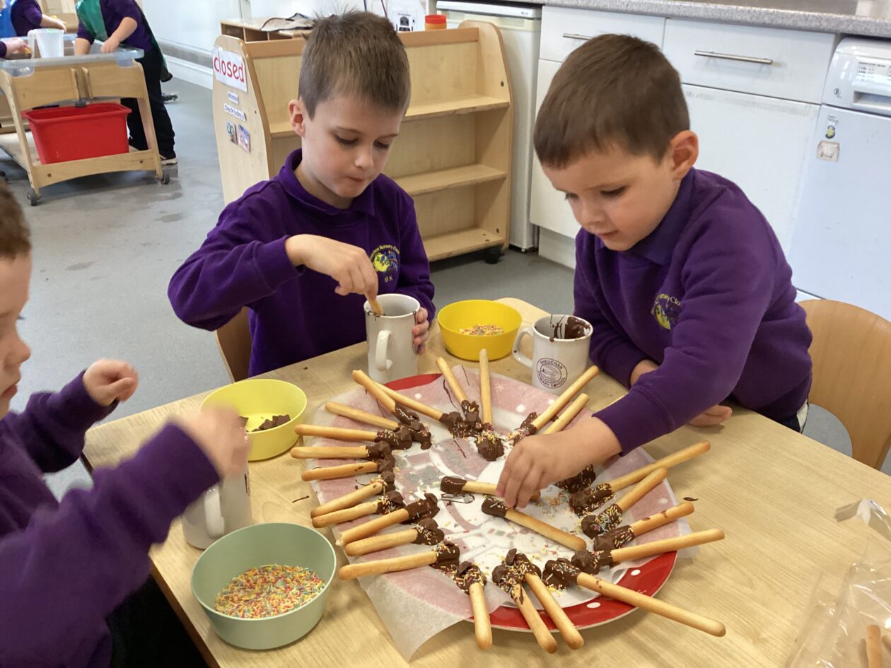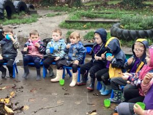 After the children shared stories from their weekend and a discussion around the celebrations held on the 5th of November we decided to create our own bonfire in the Nursery Garden. The children gathered leaves to create their bonfire shape before making a large circle around it with chairs. They then enjoyed hot chocolate and chocolate sparklers that they had previously made that morning from bread sticks for snack.