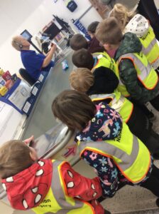 On our walk we threw stones in the lake creating bubbles on the water, visited the boat yard where we noticed all the boats had names and numbers on them and then headed up the pier to see the boats on the water. On the way back to the park we were very kindly invited into the coastguard shed where the children were shown the equipment used to help someone in trouble at sea or around the coast. The children asked a lot of fantastic questions in the shed and we even noticed that the coastguard also wore High Vis to keep them safe and seen.