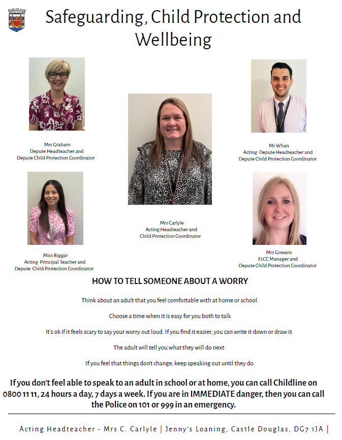 Please make immediate contact with Mrs C Carlyle (Acting Head Teacher) who acts as our Child Protection Coordinator. In her absence, contact can be made with Mrs A. Graham (Depute Headteacher), Mr A. Whan (Acting Depute Head Teacher), Miss E. Biggar (Acting Principal Teacher) or Mrs R. Gowans (ELCC Manager) who act as our Depute Child Protection Coordinators.