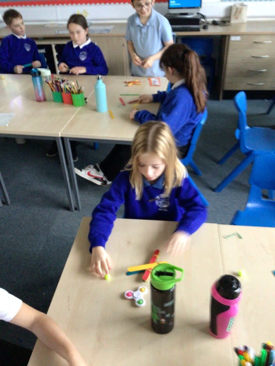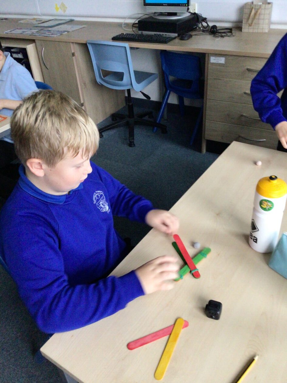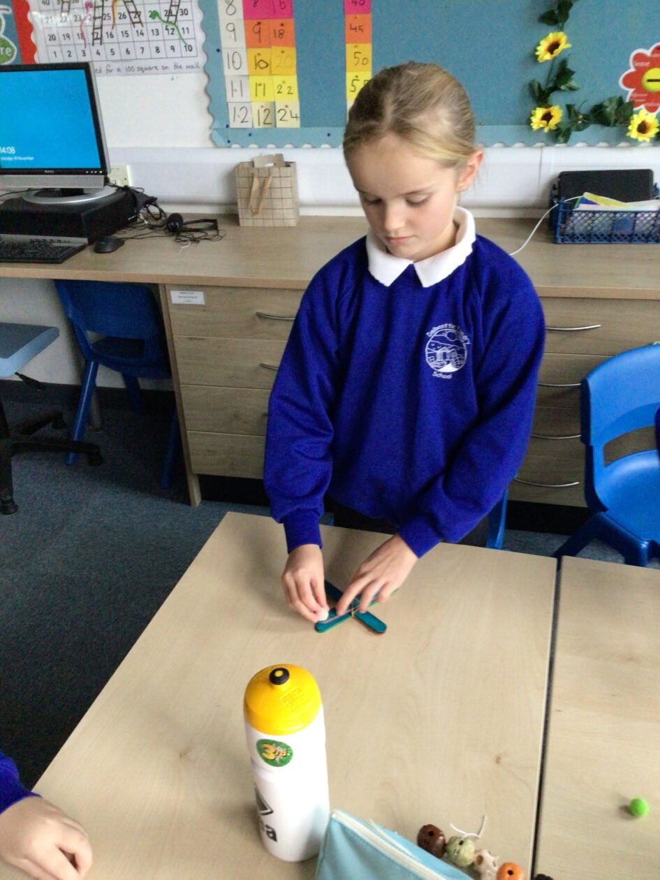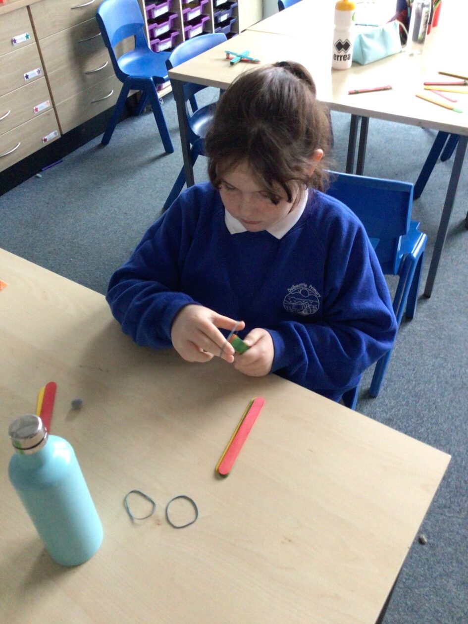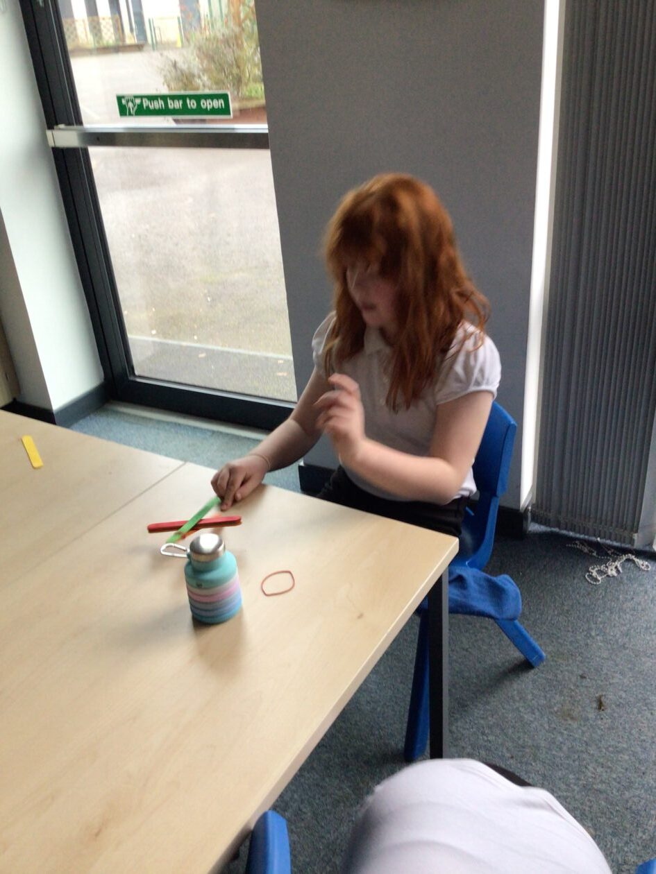 We investigated potential and kinetic energy in our final experiment this week. The class used their Meta-skill of curiosity to play with lolly sticks and elastic bands until they created a catapult to send a pompom flying. They found that if they increased the height of their pompom before it was pulled back to fire, the potential energy that the elastic bands held for the pompom increased too. This transferred to a larger kinetic energy, and you could hit your forehead or even the teacher! Take a look…