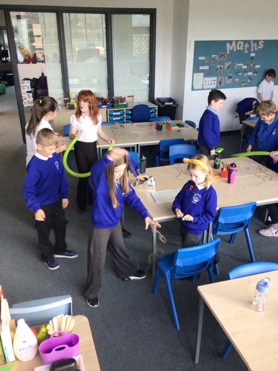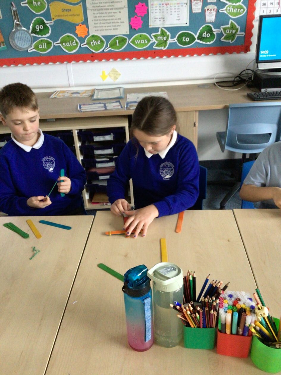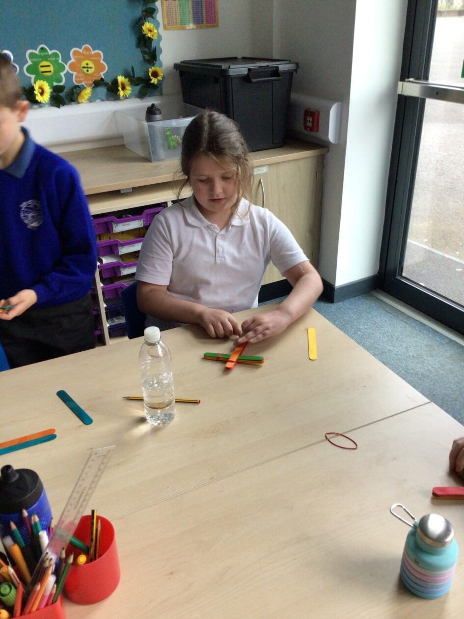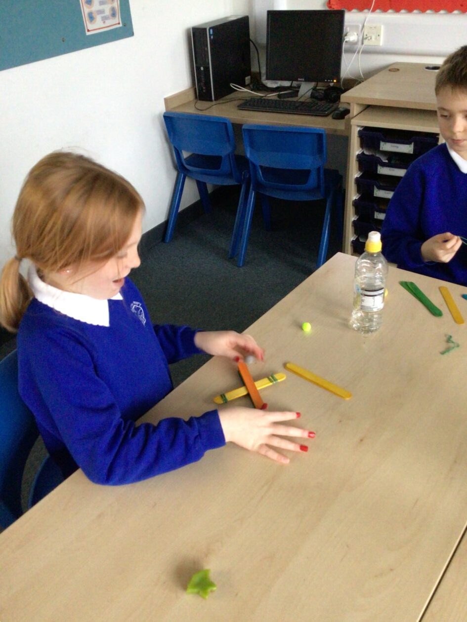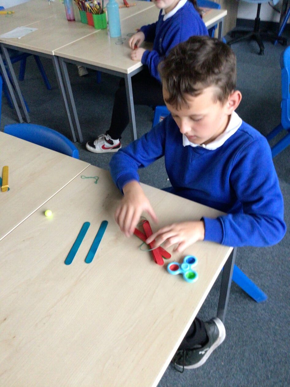 We investigated potential and kinetic energy in our final experiment this week. The class used their Meta-skill of curiosity to play with lolly sticks and elastic bands until they created a catapult to send a pompom flying. They found that if they increased the height of their pompom before it was pulled back to fire, the potential energy that the elastic bands held for the pompom increased too. This transferred to a larger kinetic energy, and you could hit your forehead or even the teacher! Take a look…