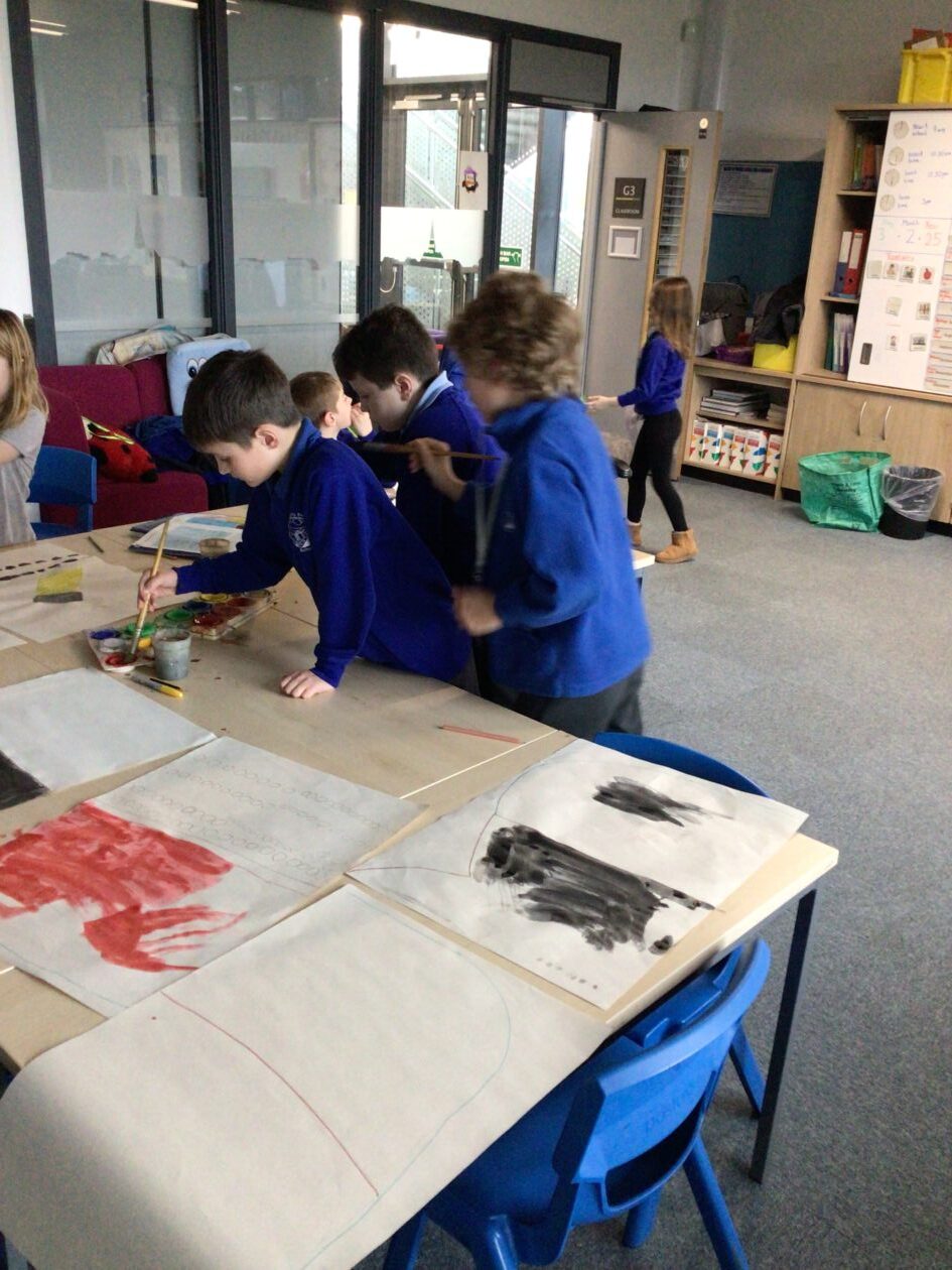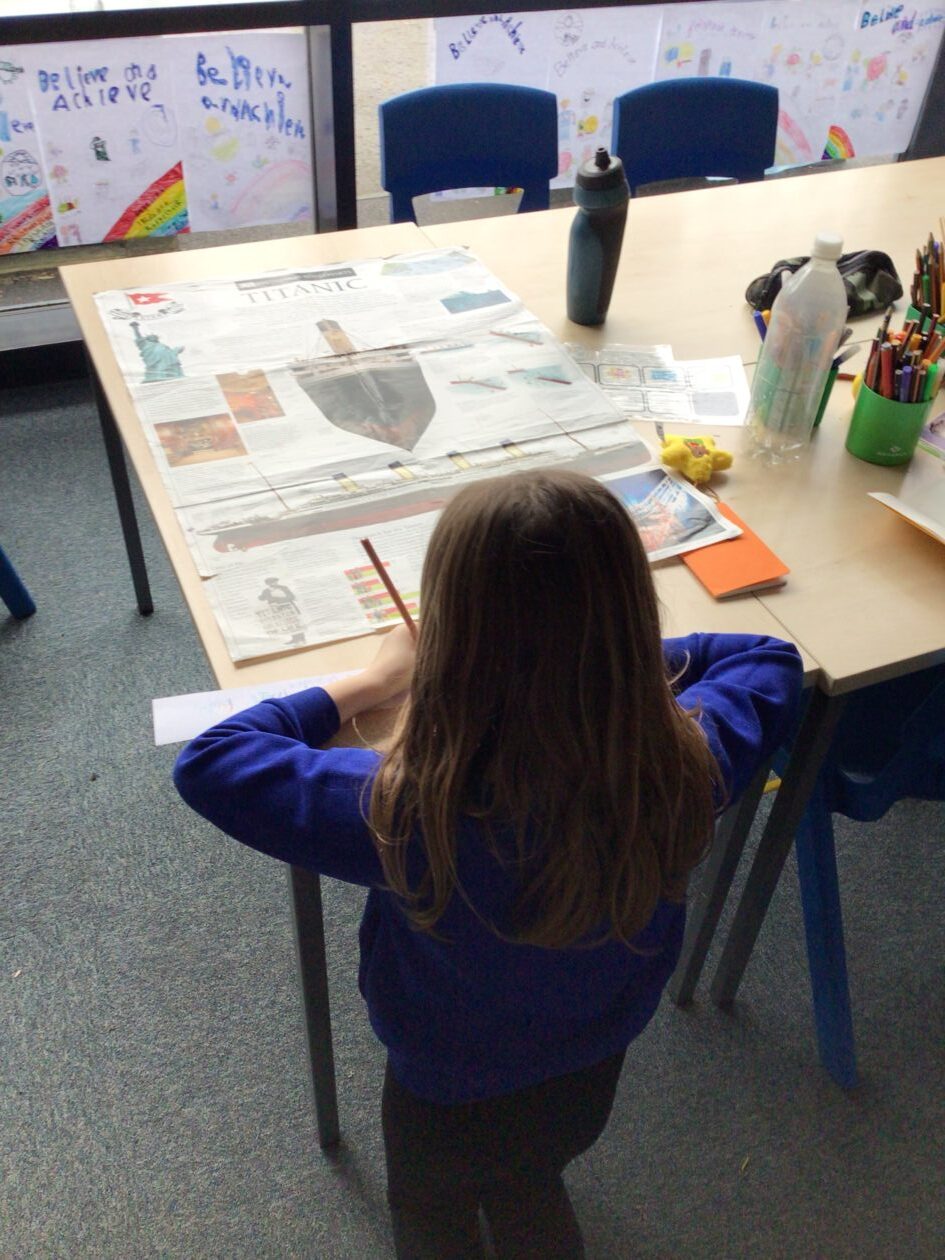 Our Titanic topic set sail this week. Pupils (secret agents) collaborated to draw and paint a big image of The Titanic for a display. We have begun to think about ways to find information about this subject.