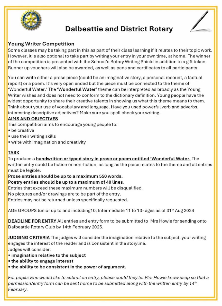 Mrs Howie has asked me to alert pupils to a writing competition that is run by the Rotary Club which they are free to take part in if they wish. We unfortunately will struggle to fit this in during class time but if anyone would like to take part at home and bring entries in, I am happy to make sure they get to the right people.