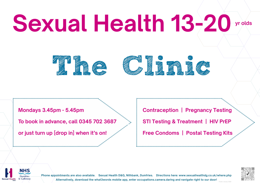 Phone appointments as well as in-person appointments in Dumfries and Stranraer are available (with pre-booking). Sexual Health D&G also run a drop in clinic on Mondays 3.45-5.45pm in Dumfries for 13 to 18 years olds.