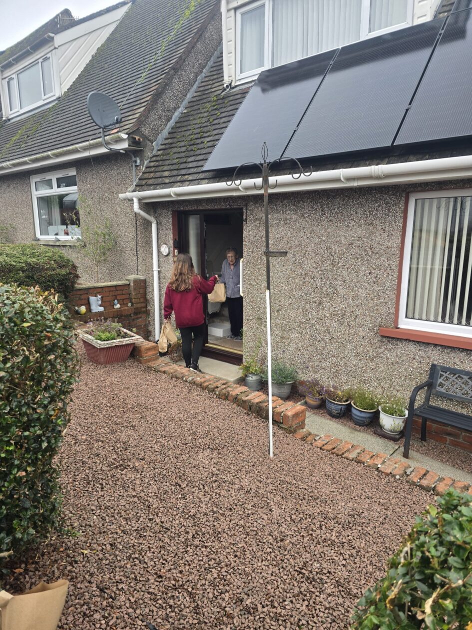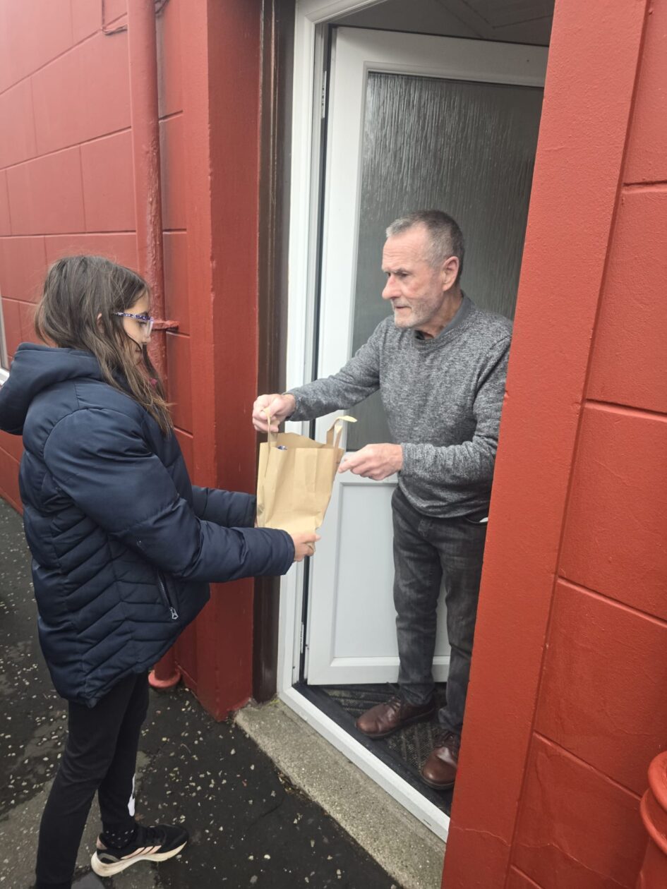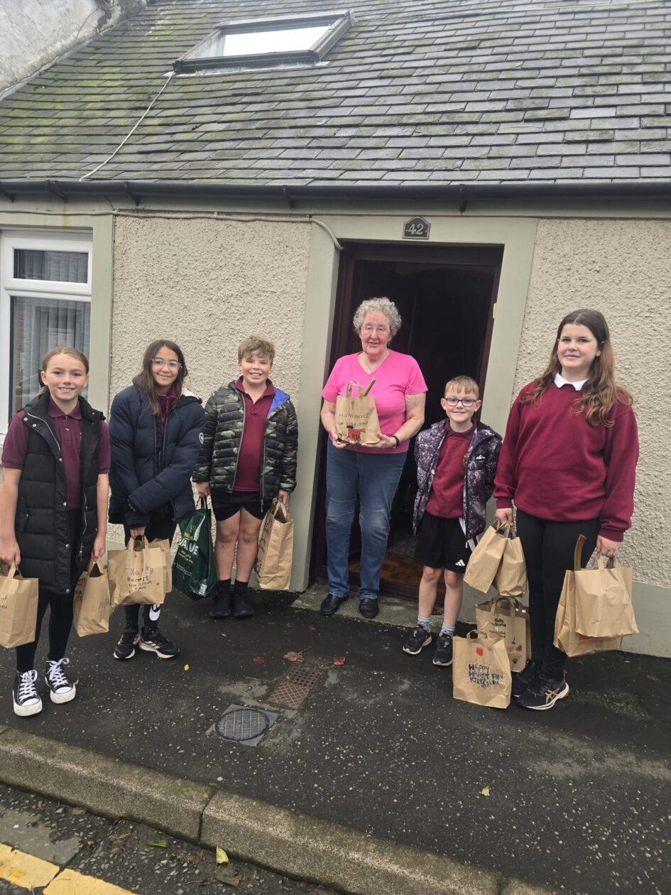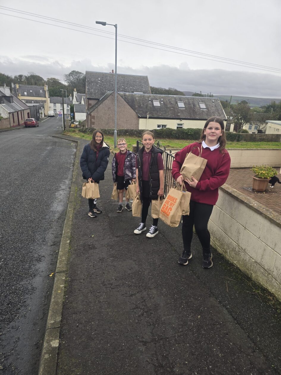Just before it got too wet and wild, this morning, Ms McGrory and soem of our P6s  P7s headed around the village to delivery some bags filled with our lovely harvest-y foods to Kirkcolm’s community member! We thoroughly enjoyed our door hopping! The perfect way to brighten up a wet and wild weekend with some wholesome foods 🙂🍲