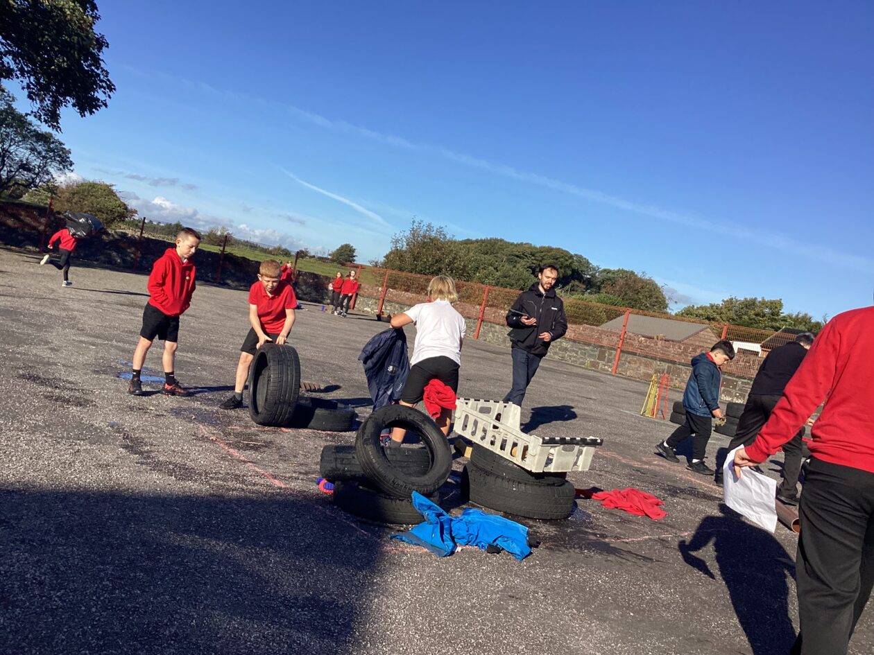 Recently we have been doing maths outside on lovely days we were doing chimney sums using object like tires and sticks.It was more fun than doing normal maths inside as we could run around and collect lots of different objects outside.
