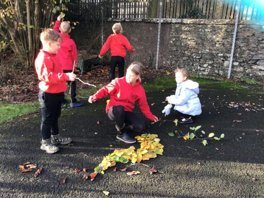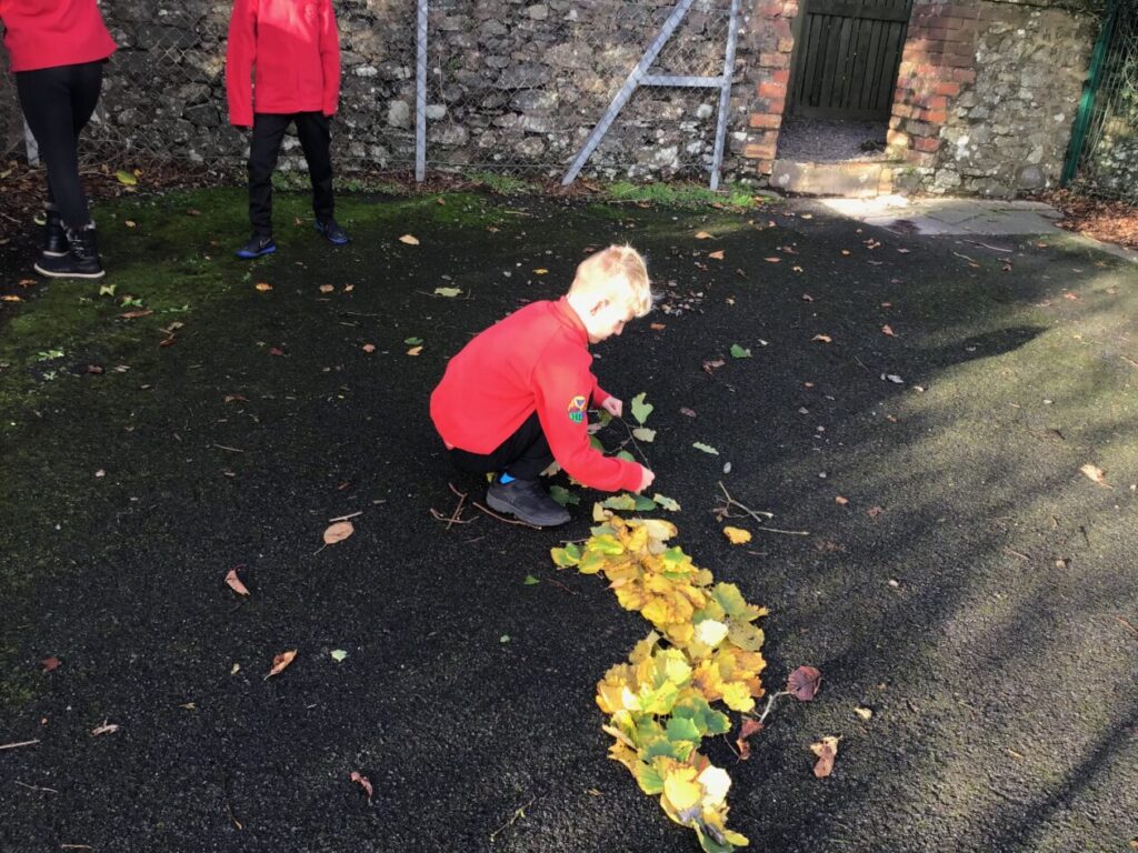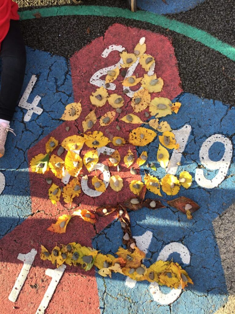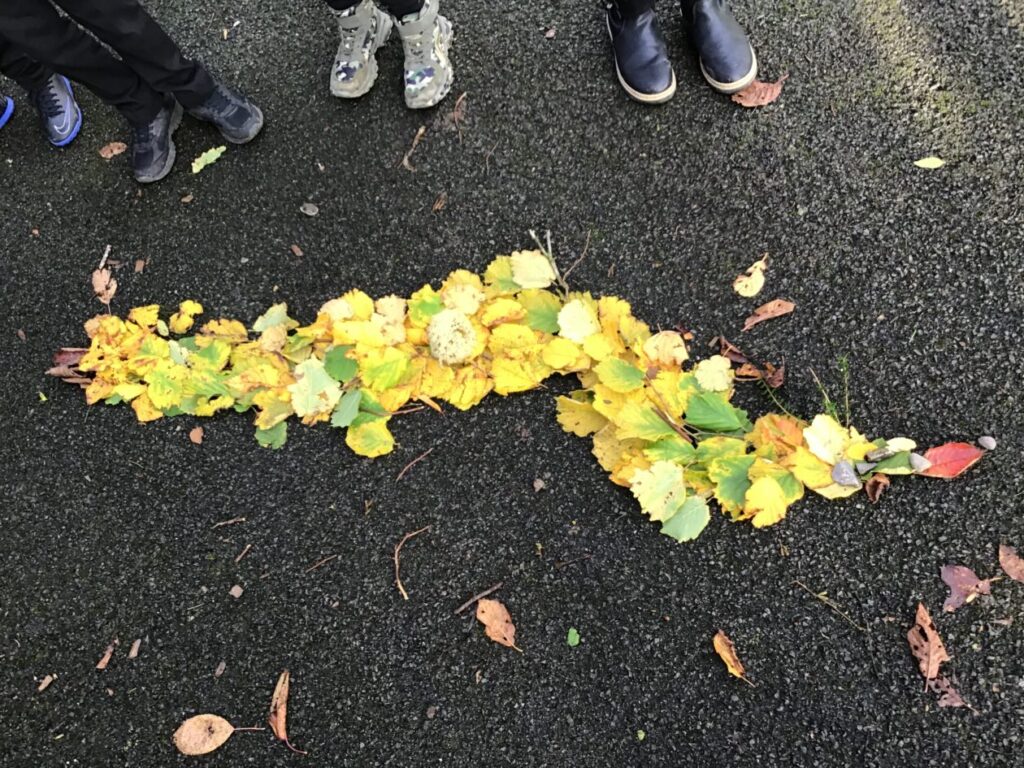 We were doing land art outside. We used different leaves for different shades and it had to go from darker to lighter. There were 2 groups, the leaders were Amelia and me for one group and Aria for the other. The other group made a snake and we made a Christmas Tree. We also used little rocks for the ornaments and the other group used sticks. – Indie