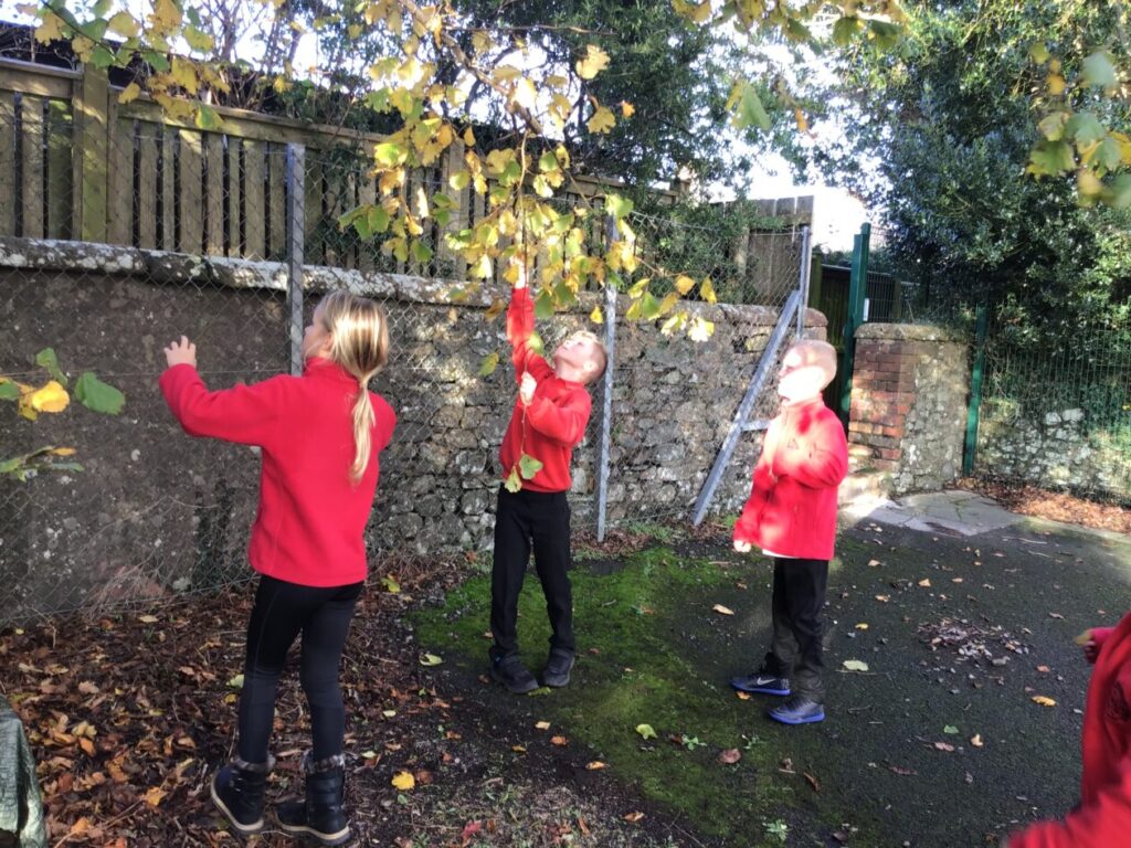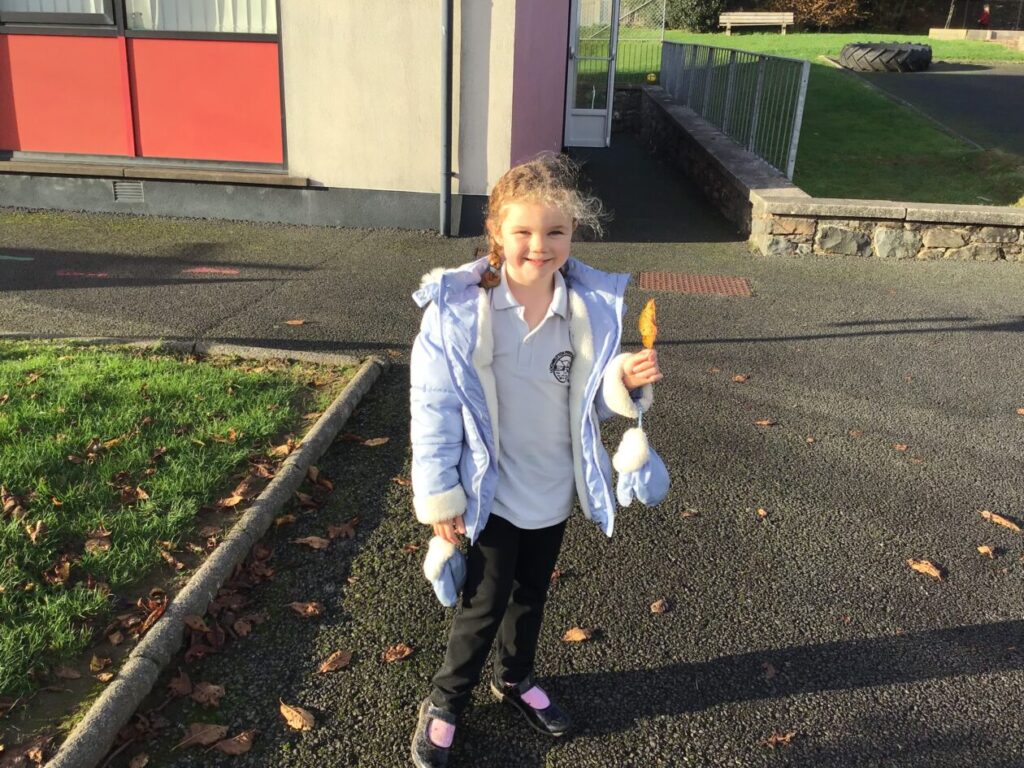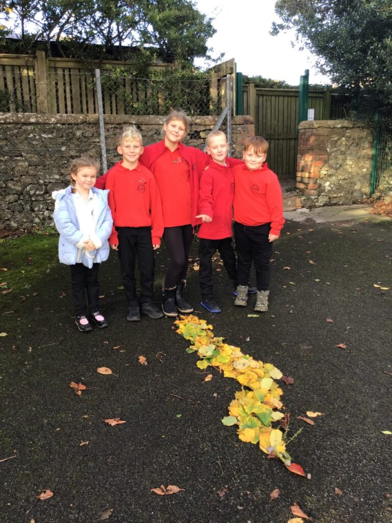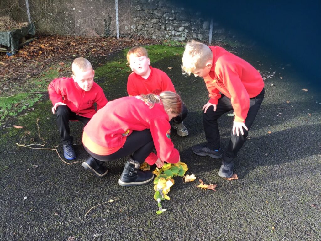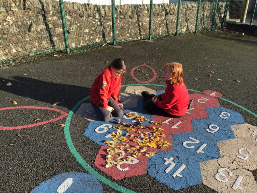 We were doing land art outside. We used different leaves for different shades and it had to go from darker to lighter. There were 2 groups, the leaders were Amelia and me for one group and Aria for the other. The other group made a snake and we made a Christmas Tree. We also used little rocks for the ornaments and the other group used sticks. – Indie