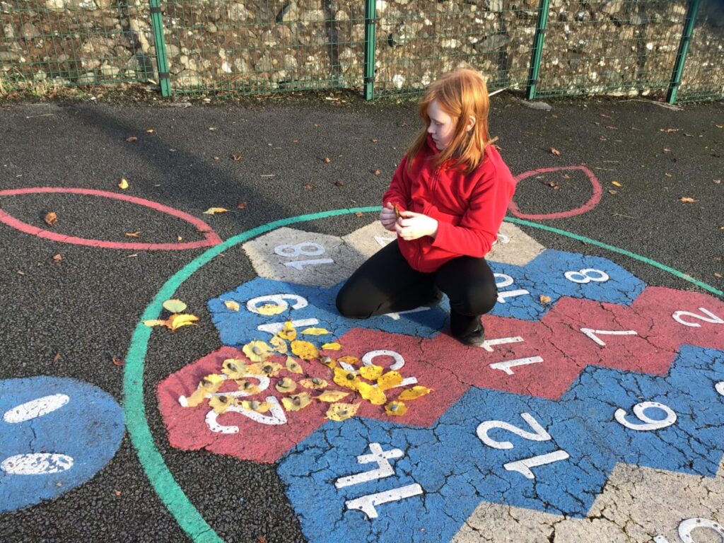We made patterns outside in groups using natural resources. My group made Nobby using a stump, leaves, mysterious glasses, conkers and lots of sticks. – Arleigh