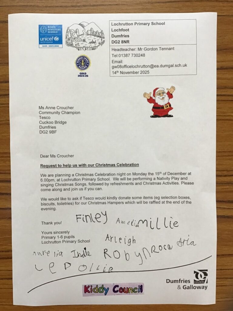 We wrote a letter to Tesco to see if they could donate anything for our Christmas Hampers and prizes. – Indie