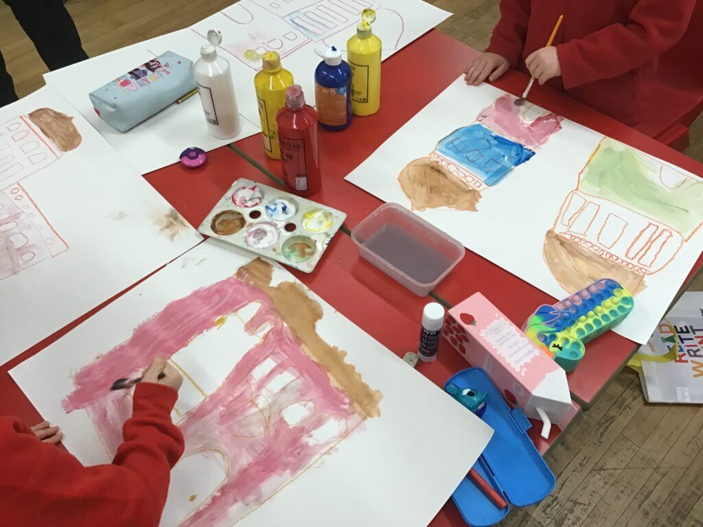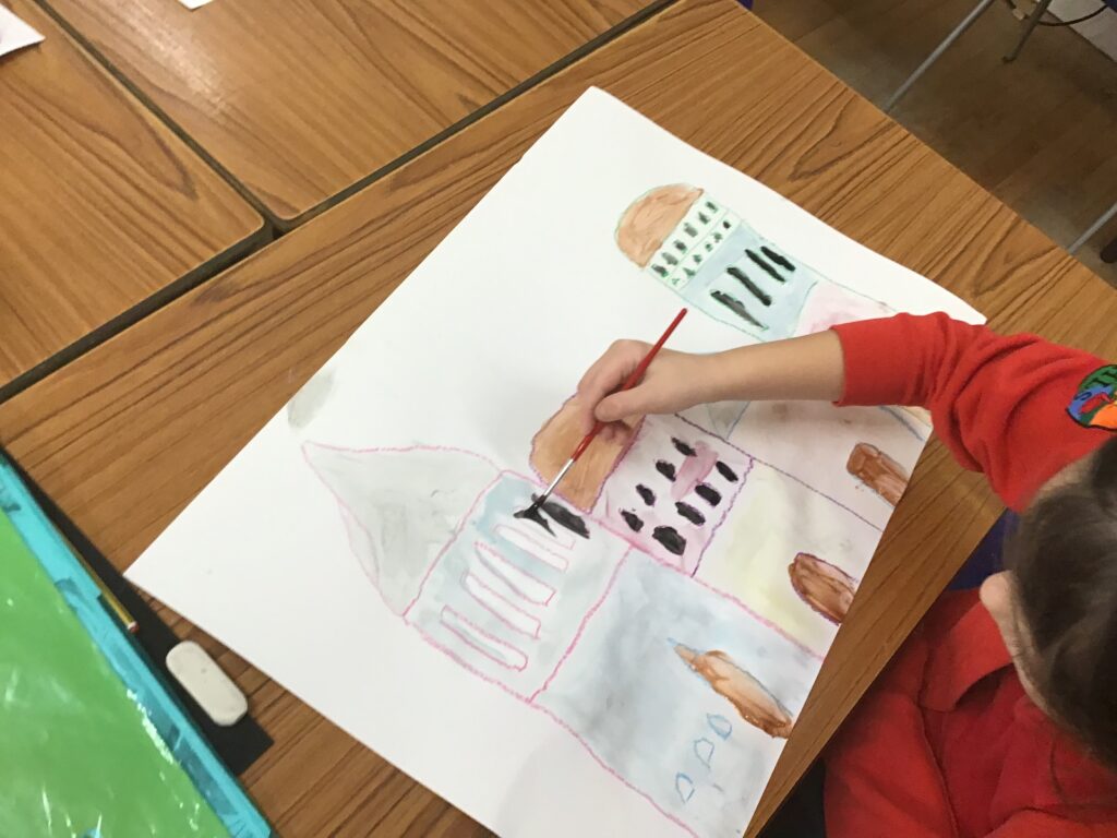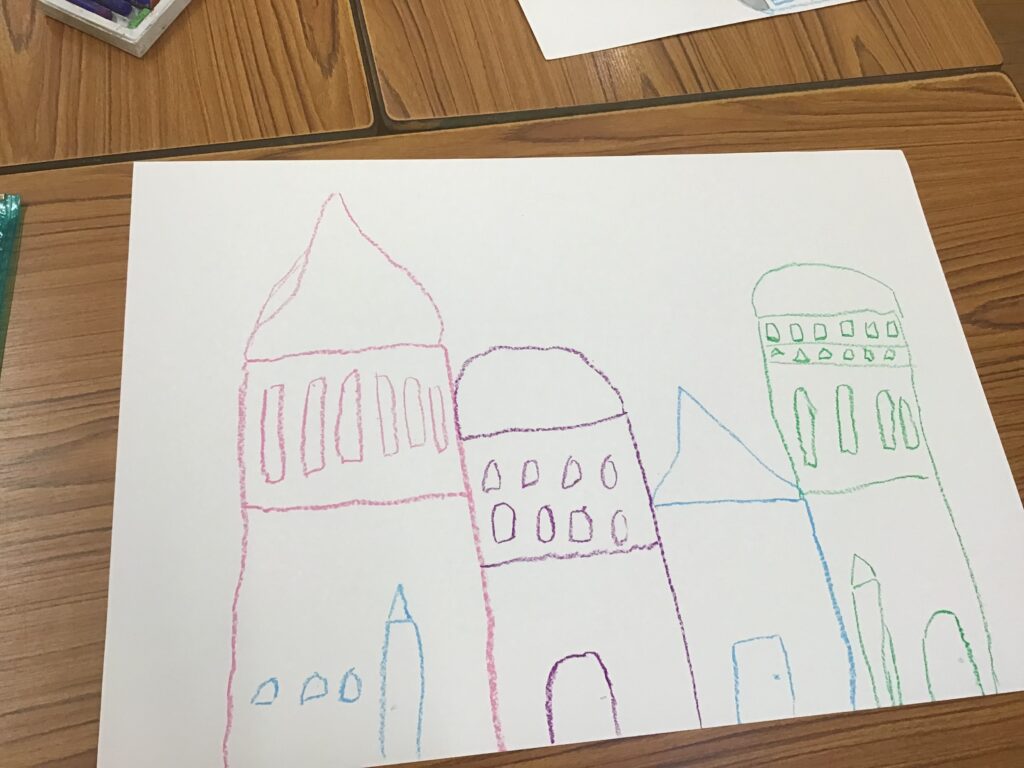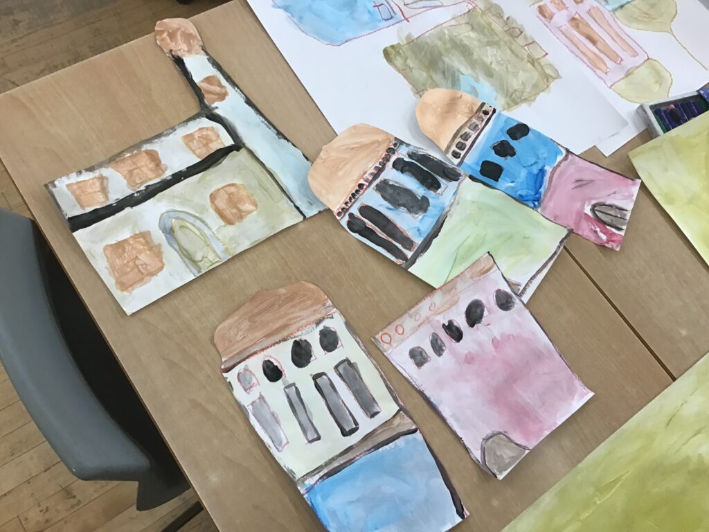 We were making houses in Bethlehem for the backdrop for our Christmas school play. We used oil pastels and paint to make them. – Aurelia