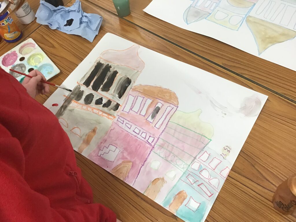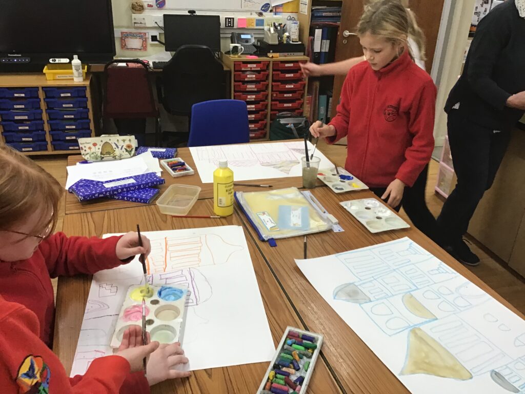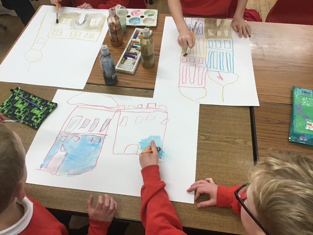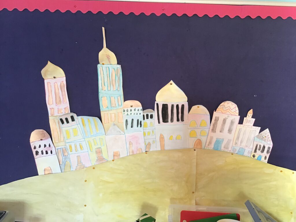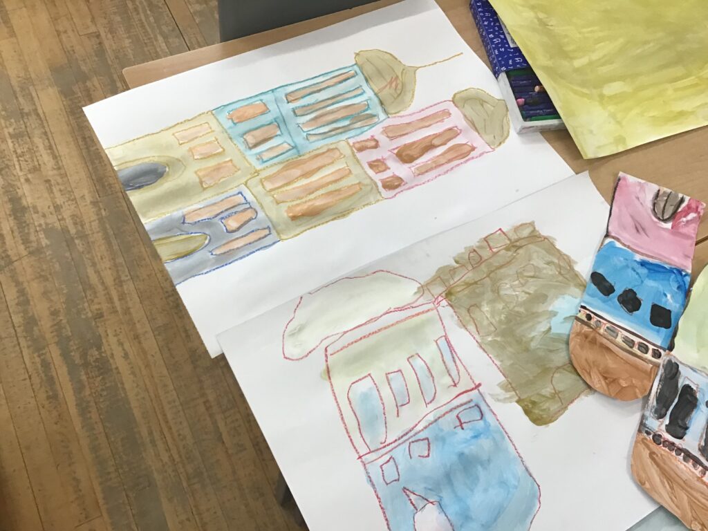 We were making houses in Bethlehem for the backdrop for our Christmas school play. We used oil pastels and paint to make them. – Aurelia