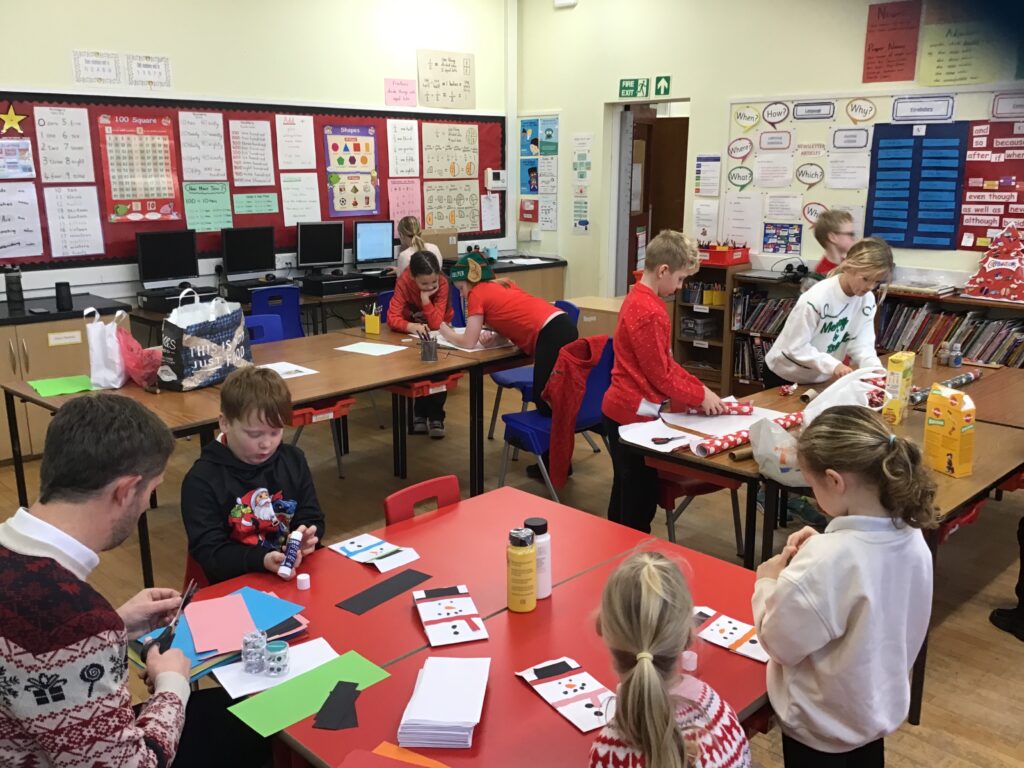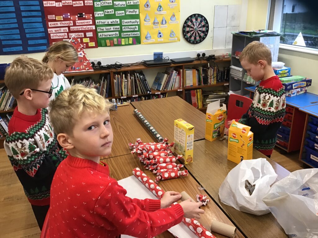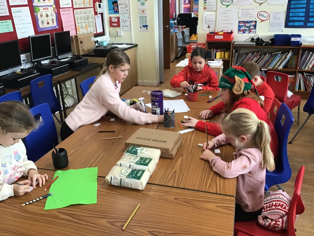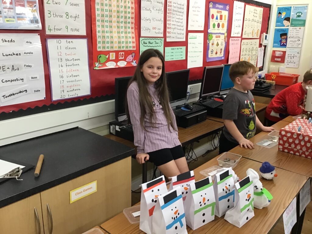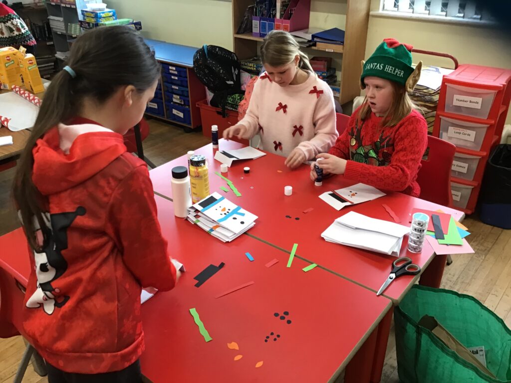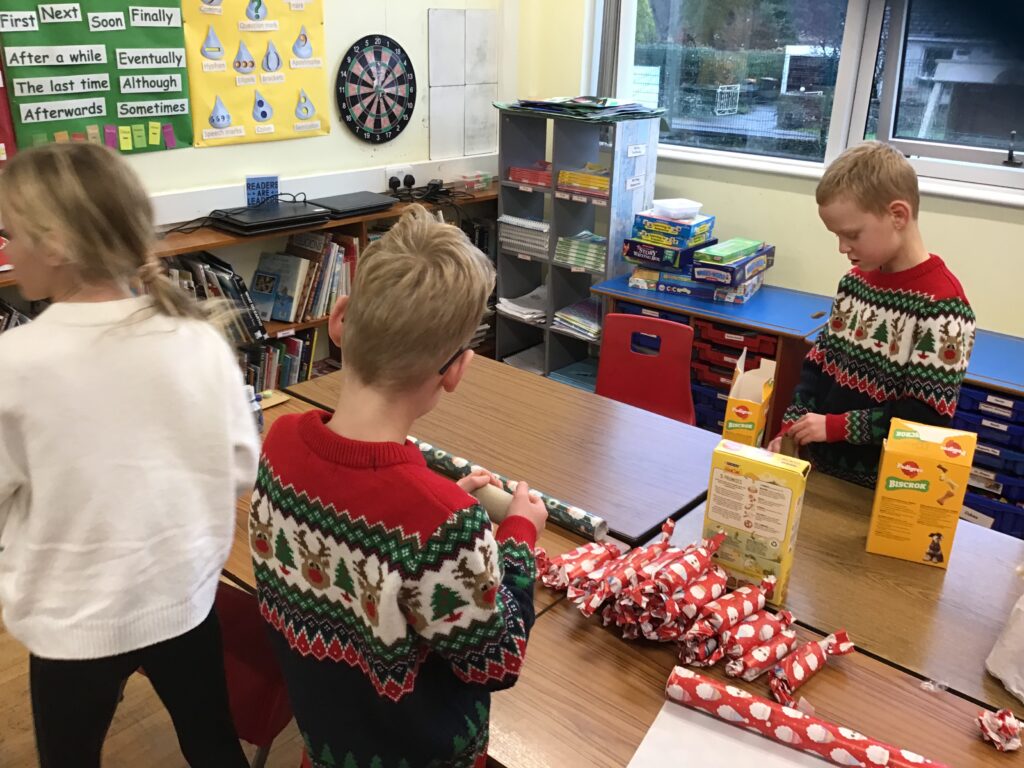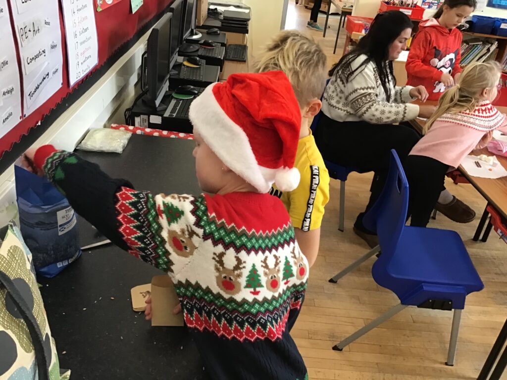 On Monday we had a crafts day for the Christmas play night. We dressed in Christmas jumpers and listened to Christmas music as we were the elves. We made reindeer hot chocolate, snowman bags, ‘do you want to build a snowman’ bags, Christmas wrapping paper, tree decorations and crackers for dogs and cats. We will be selling these on the night. – Indie