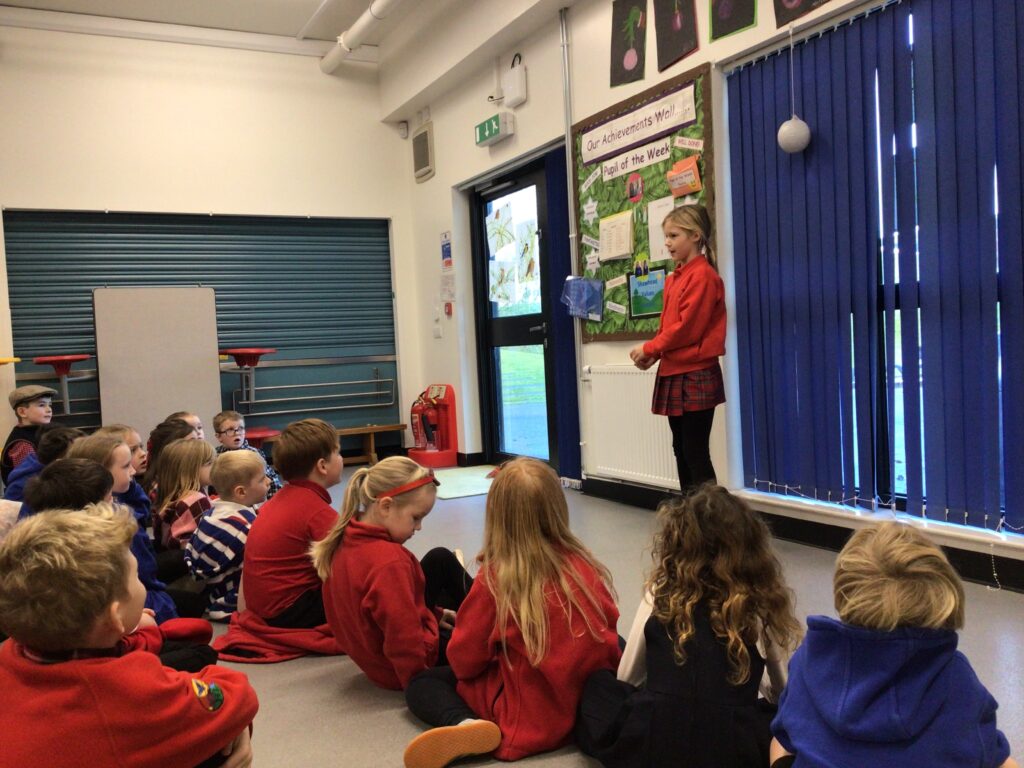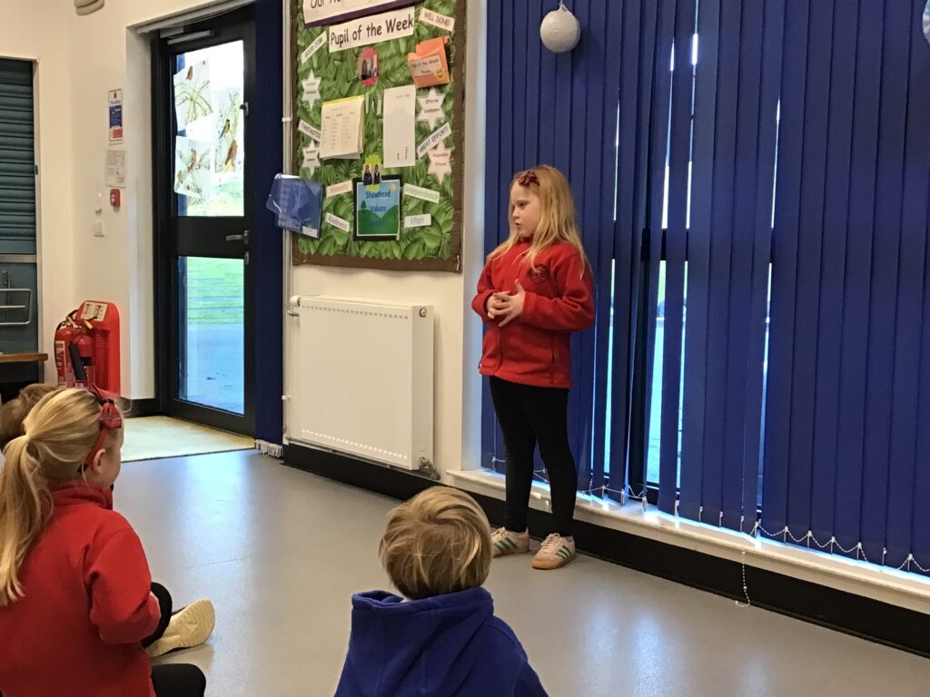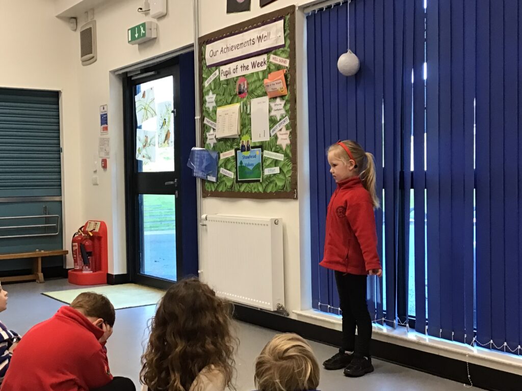 Shawhead Primary came over to do a Feis Rois gathering. We sang different songs to each other and also sang some together! We also played a game altogether with a ball. We all had a lot of fun seeing each other and listening to each others songs. – Aria