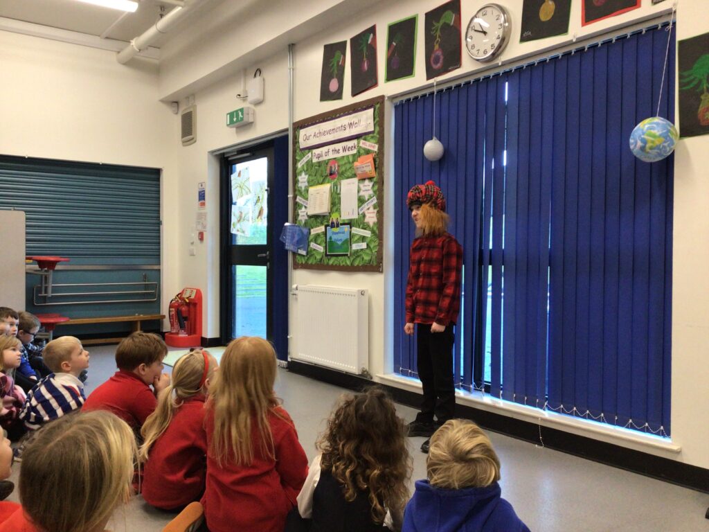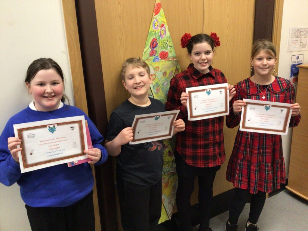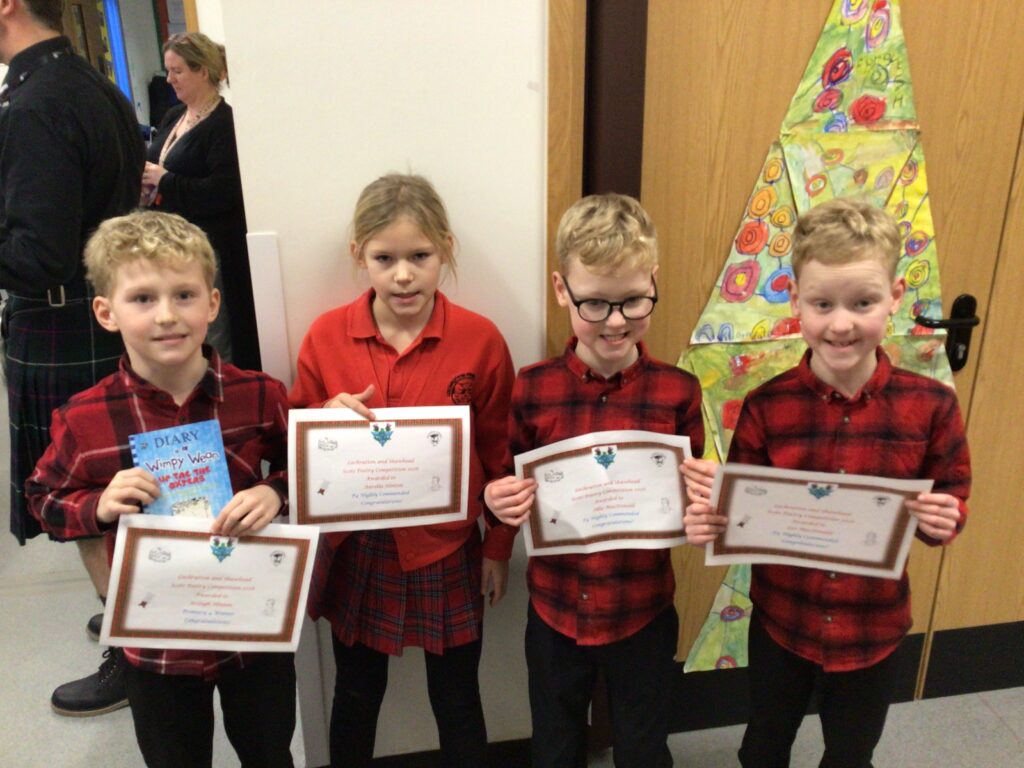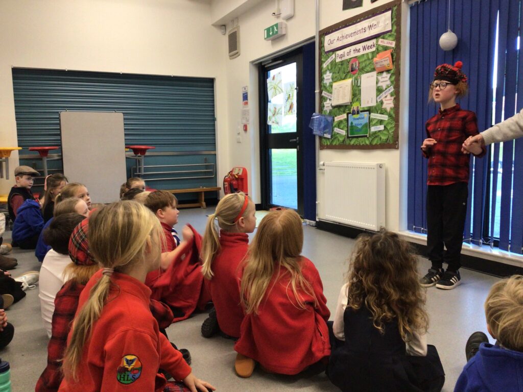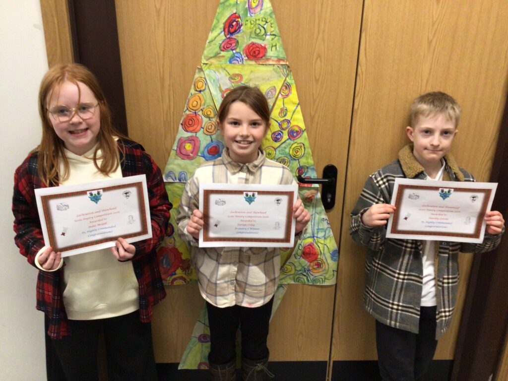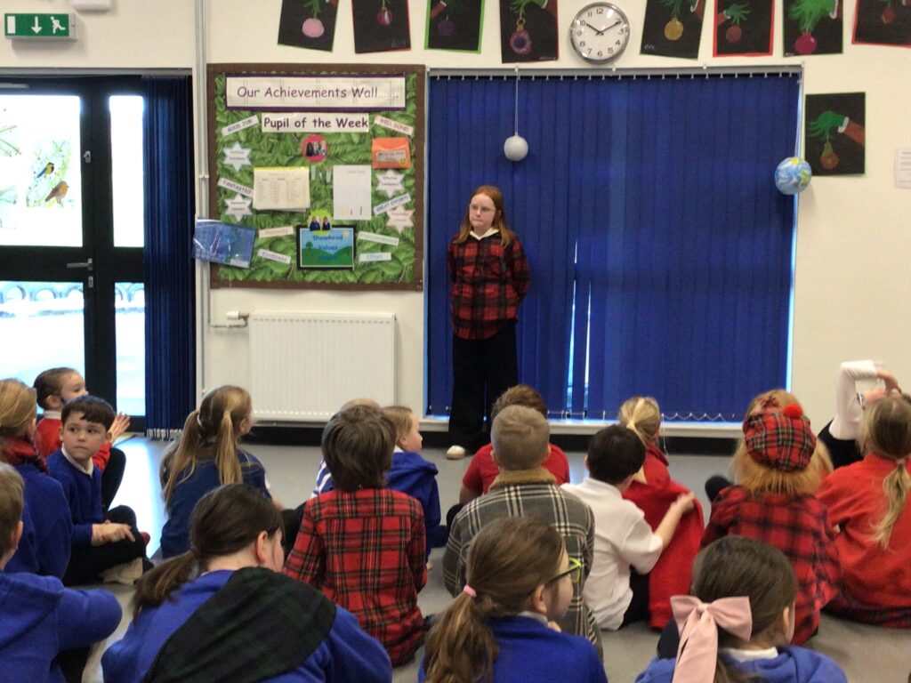 We had a partnership Burns day at Shawhead. First we had our Scots poetry competition where we stood up in front of the whole school and got marked out of 25 for how we done. Once we said our poem we went to the side and marked the next person. After break we performed some Scottish dancing to prepare for the Day of Dance on Friday. After lunch we drew a picture of our self with different emotions, we used oil pastels for these. For the background we made a tartan design. We then wrote the emotion in the Scots word for it. We both did ‘greetin’. At the end of the day we found out the winners to the poetry competition. P1 was Hallie, P2 Ruairi, P3 Arleigh, P4 Indie, P5 Asa, P6 Lola and P7 was Jackson. Since I won, I got a book called ‘The Sleekit Mr Tod’, it is in Scottish. – Amelia & Indie