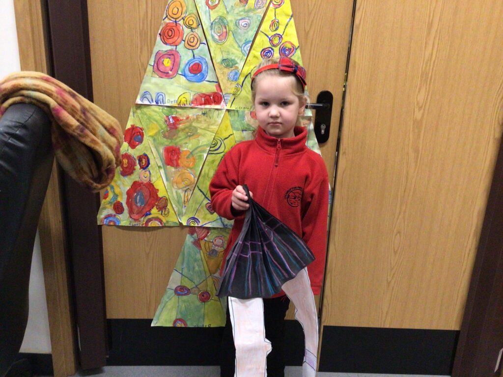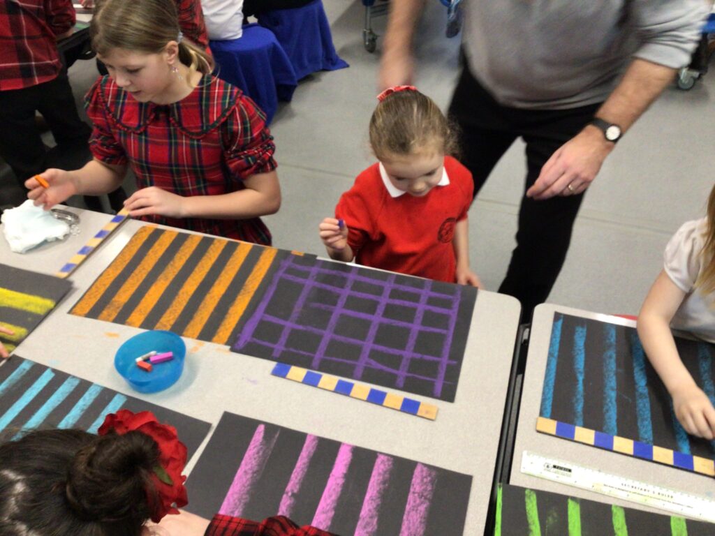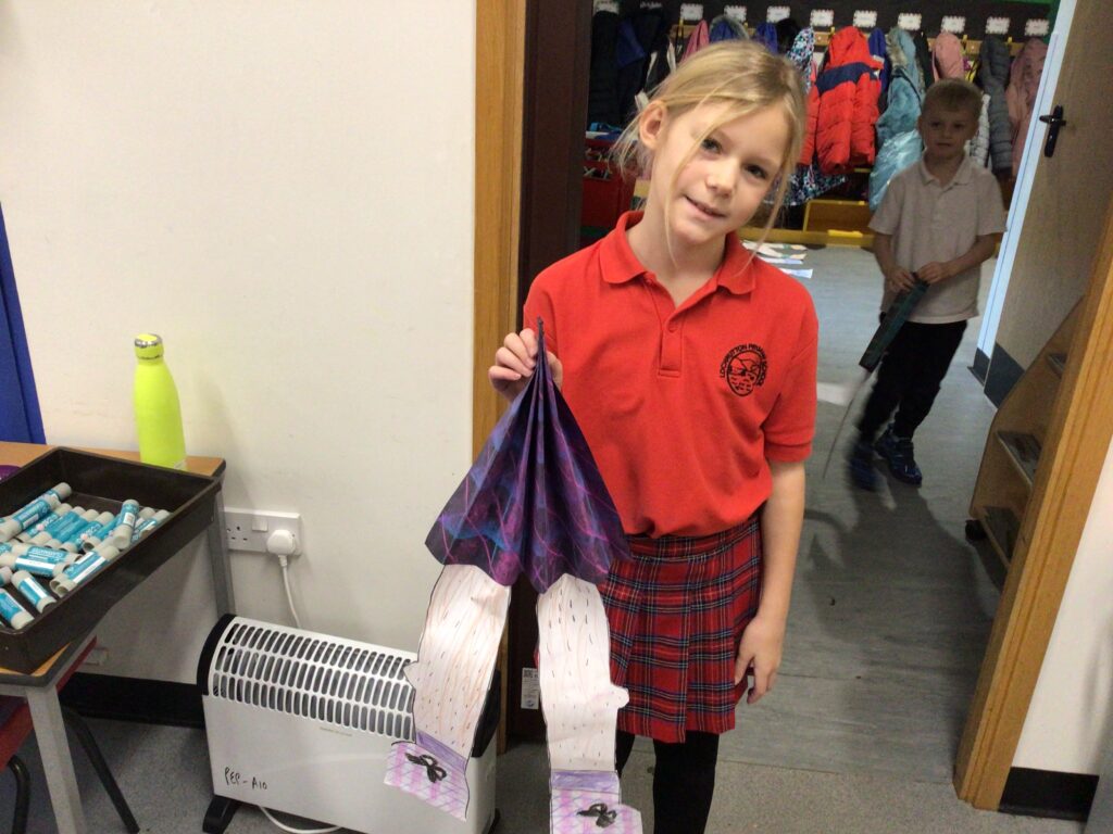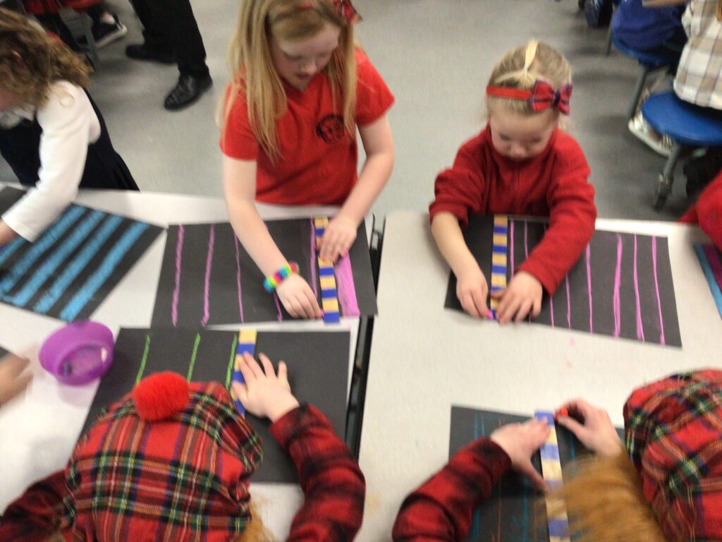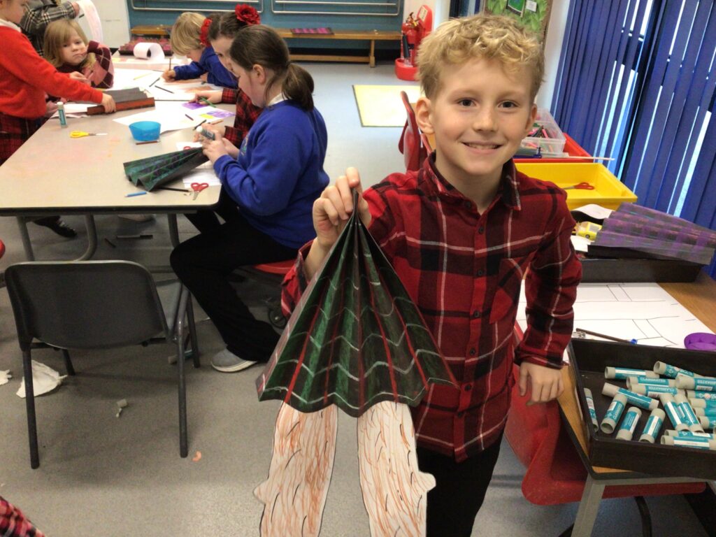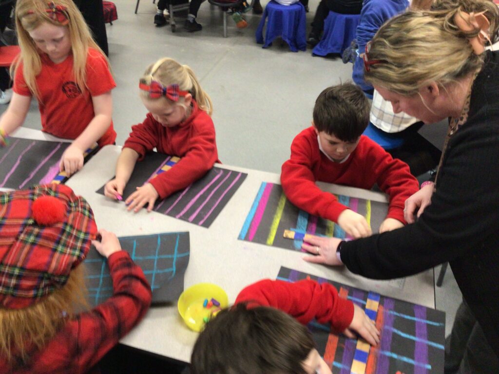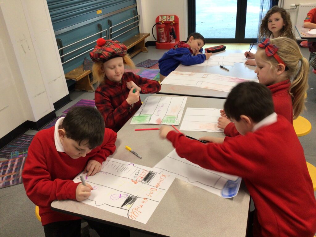 We had a partnership Burns day at Shawhead. First we said our Scots poems to everyone and the winners got prizes. After that we made kilts with legs sticking out using oil pastels and pencils. For lunch we had our toasts and the haggis piped out. To end the day we had a big Scots quiz. – Amelia