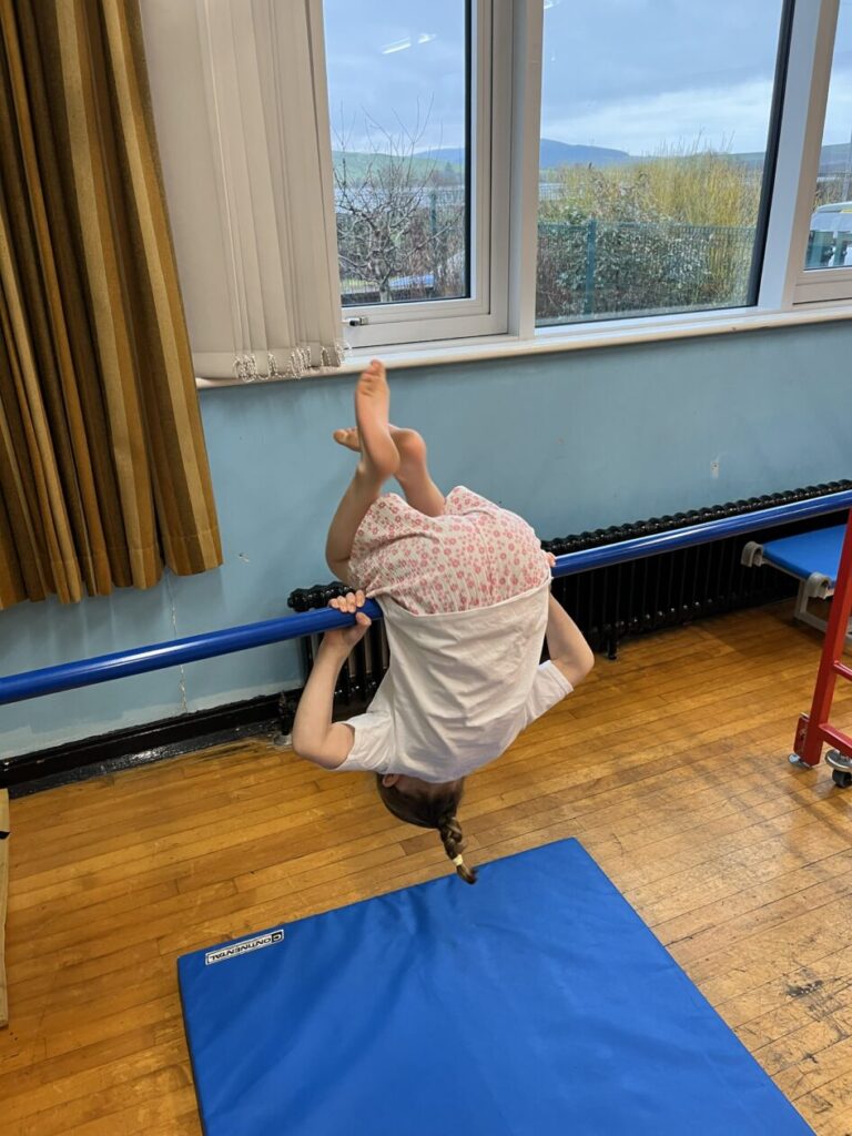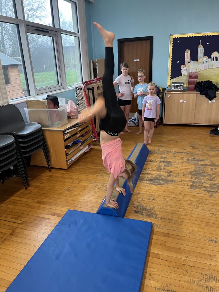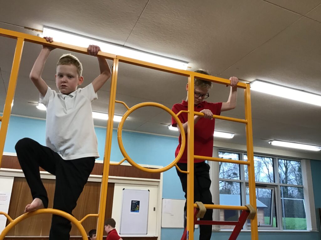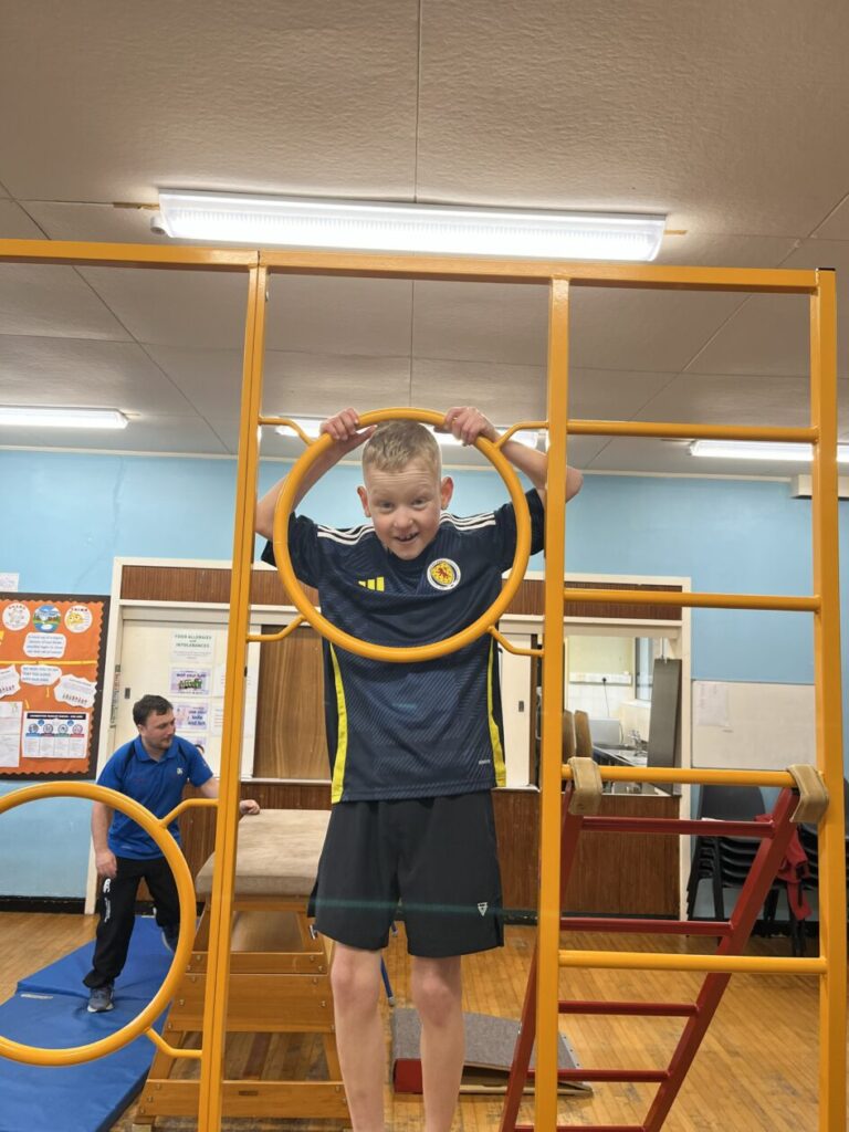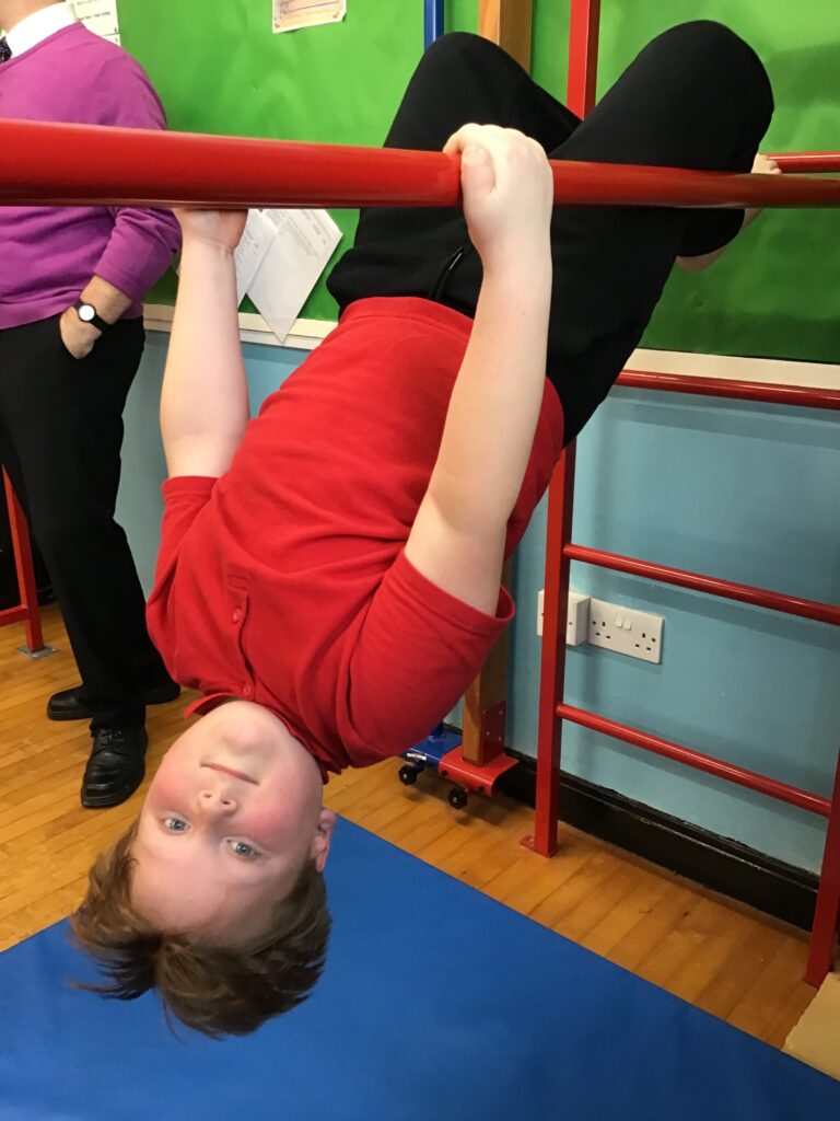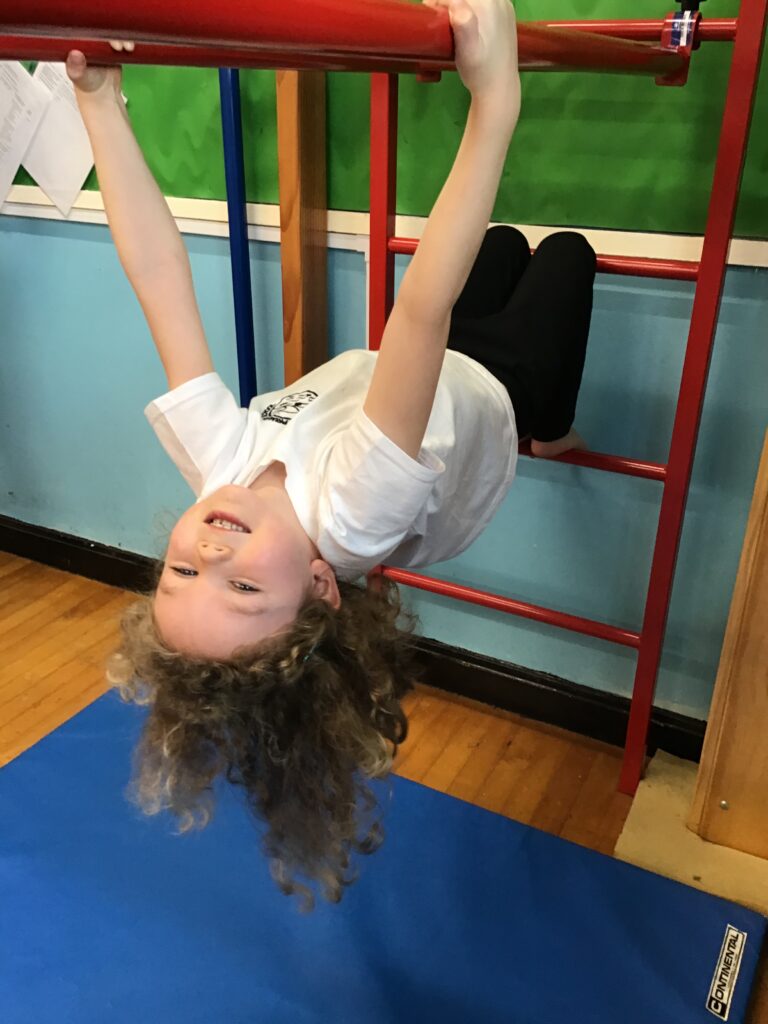 For our last gymnastics session with Ross we started with a stretching warm up, then we had the climbing frame out with a bar that you could swing over. We were also balancing and using the spring board. – Ollie