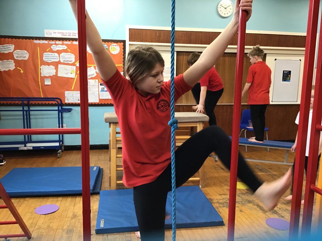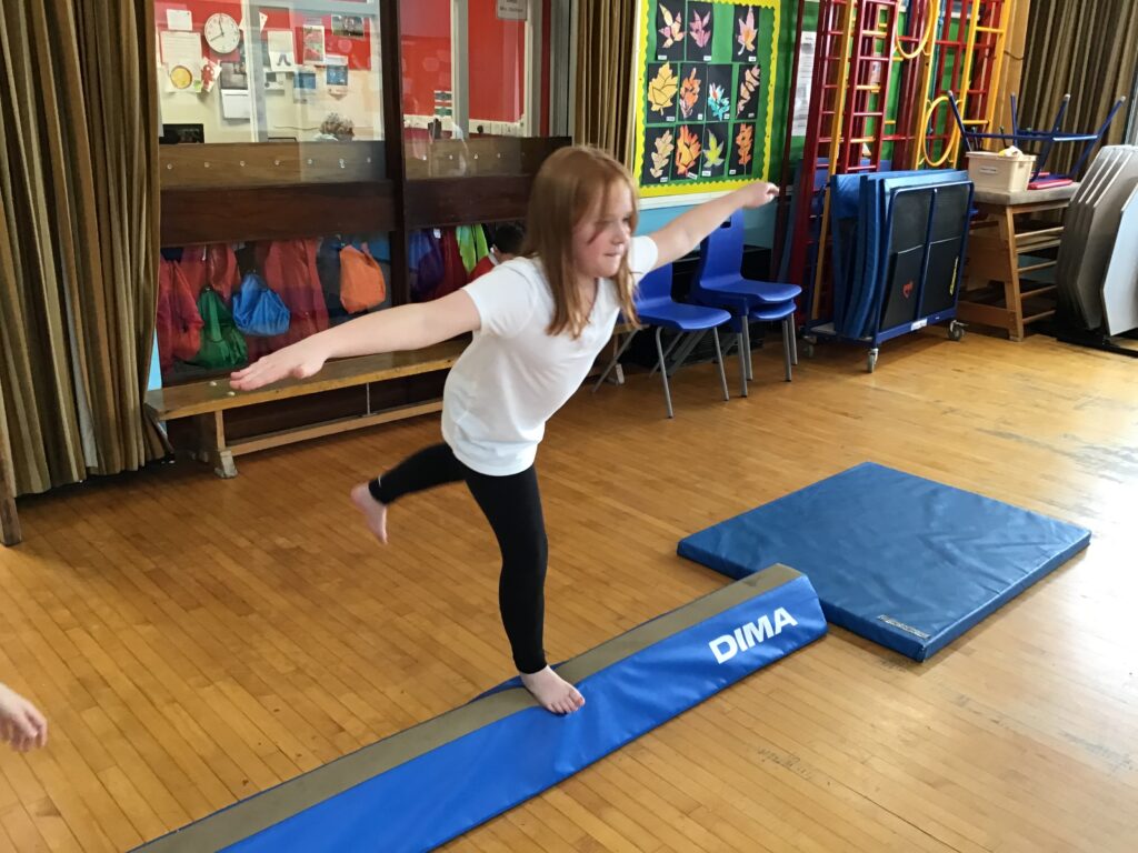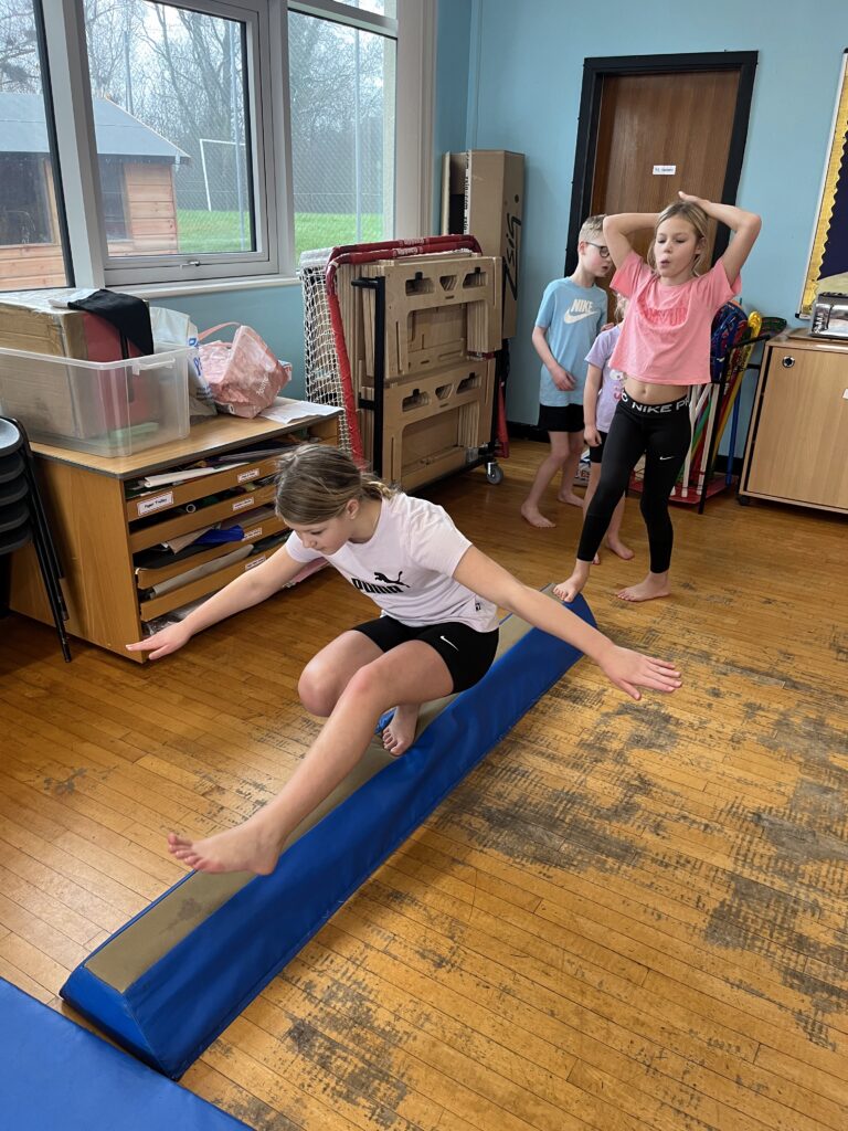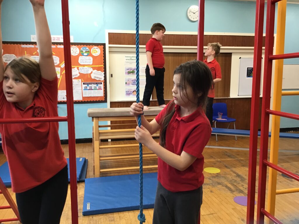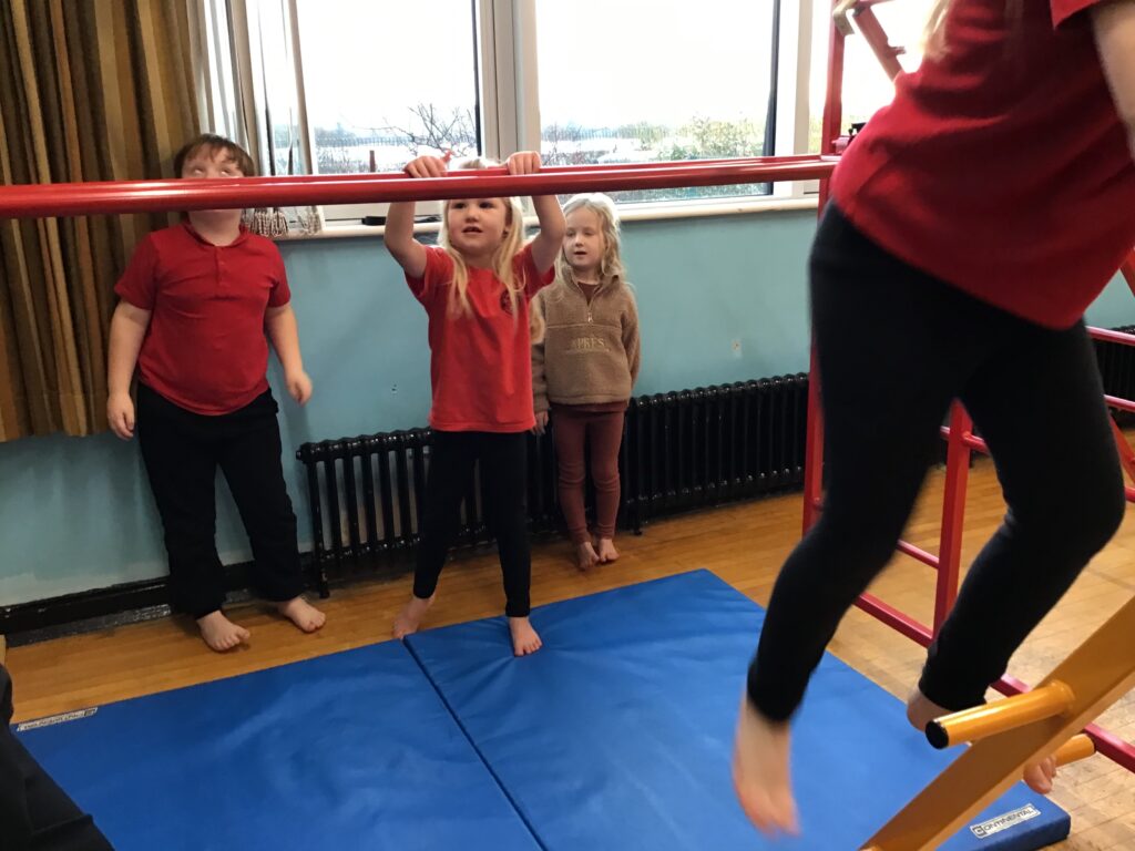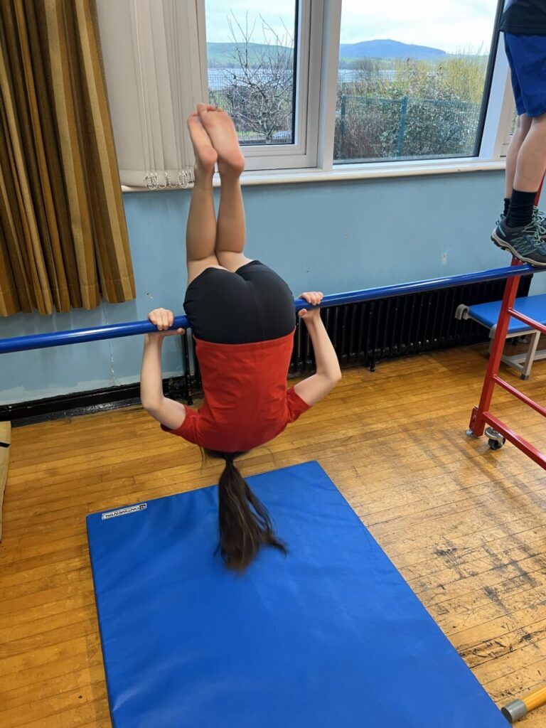 For our last gymnastics session with Ross we started with a stretching warm up, then we had the climbing frame out with a bar that you could swing over. We were also balancing and using the spring board. – Ollie