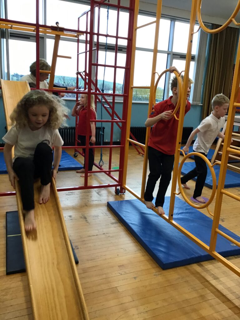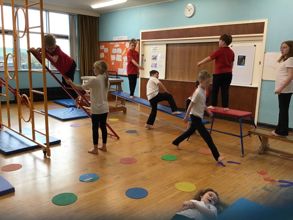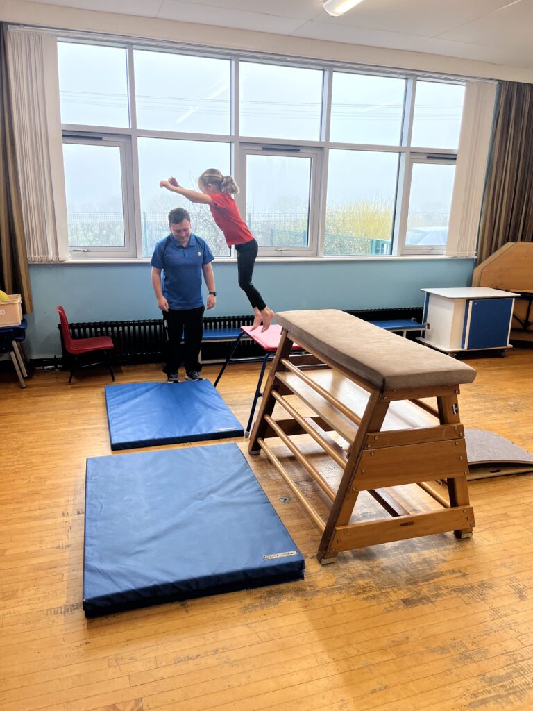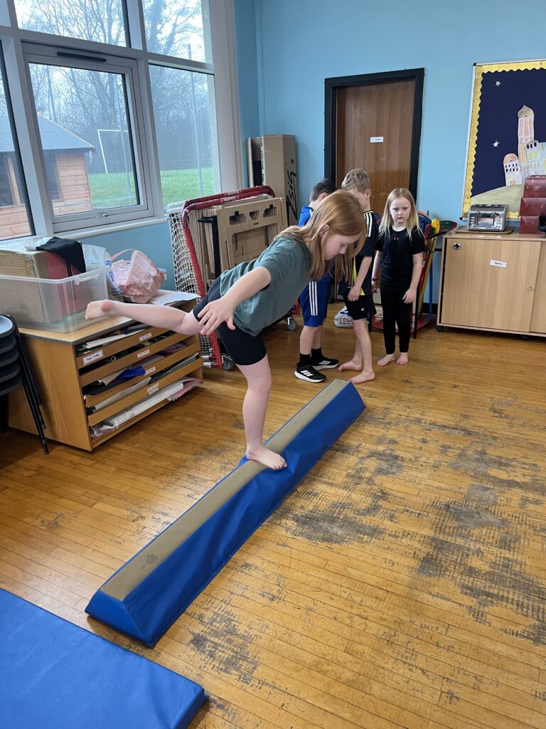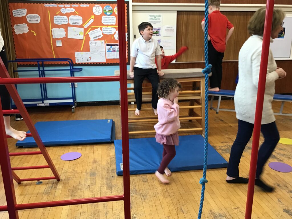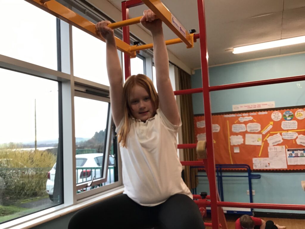 For our last gymnastics session with Ross we started with a stretching warm up, then we had the climbing frame out with a bar that you could swing over. We were also balancing and using the spring board. – Ollie