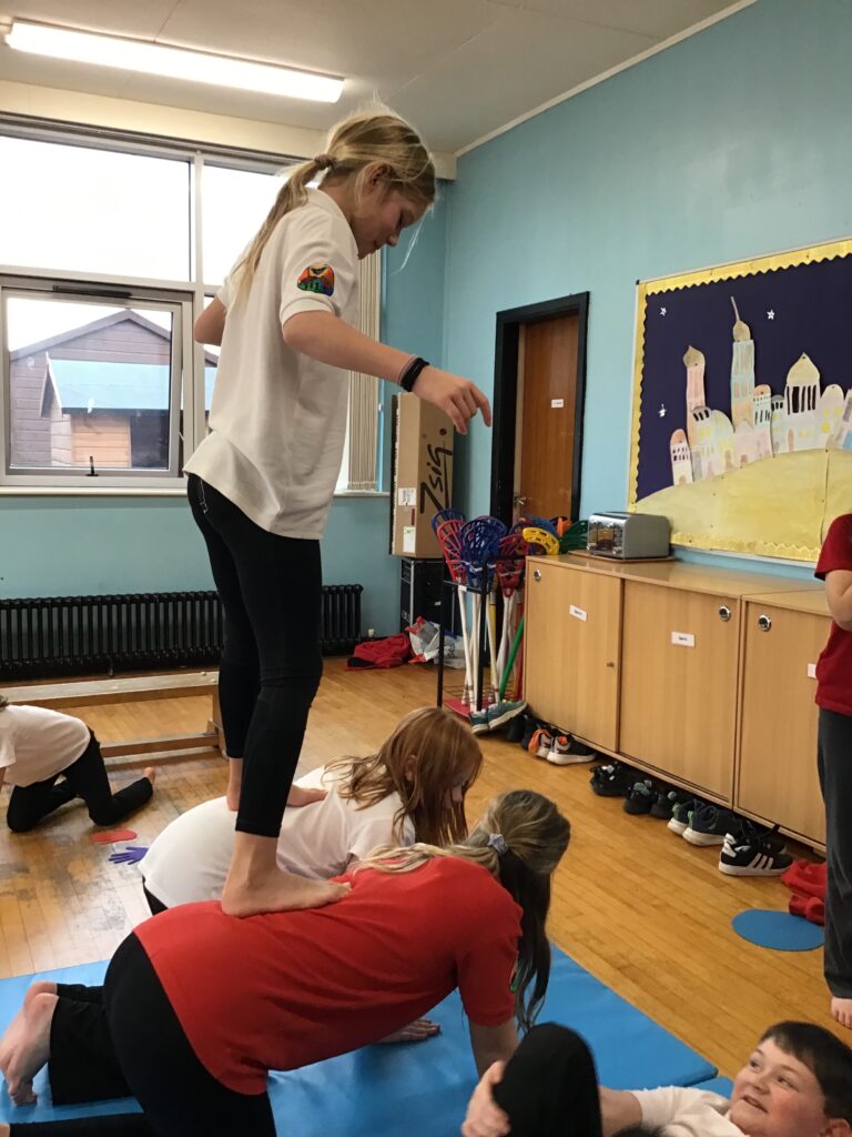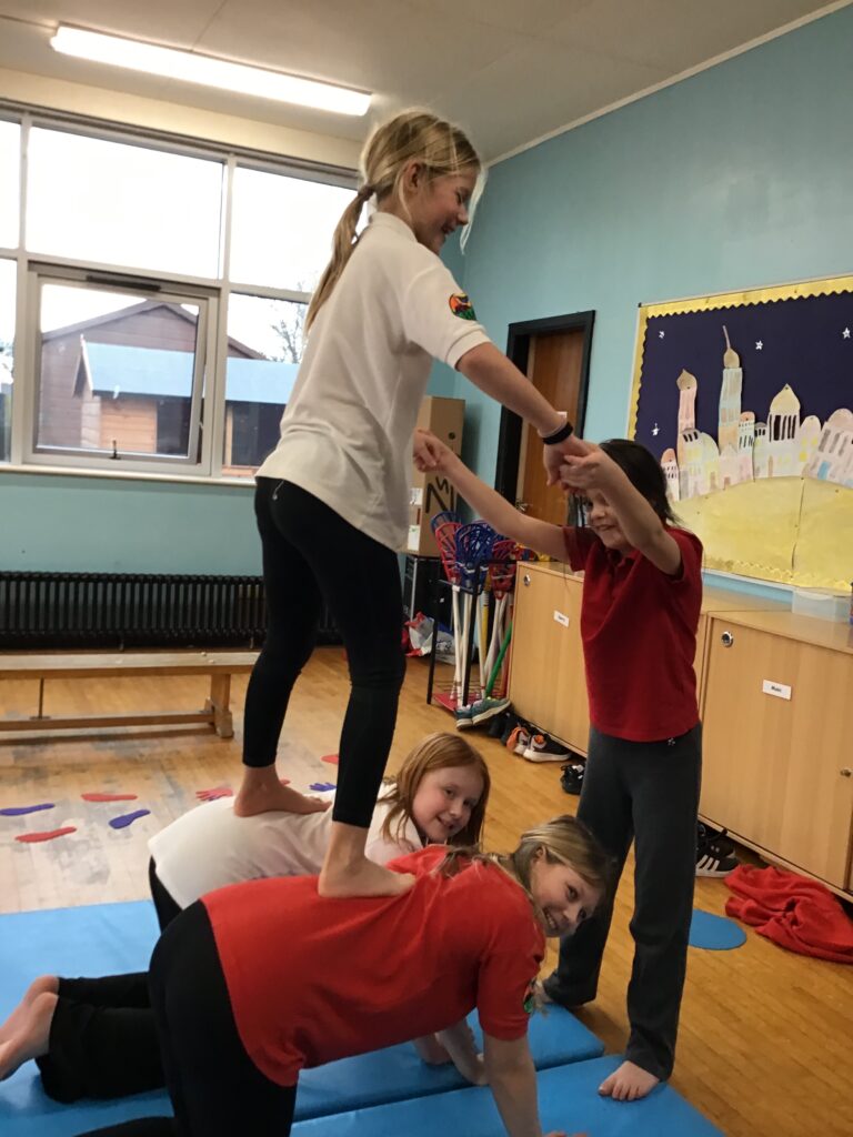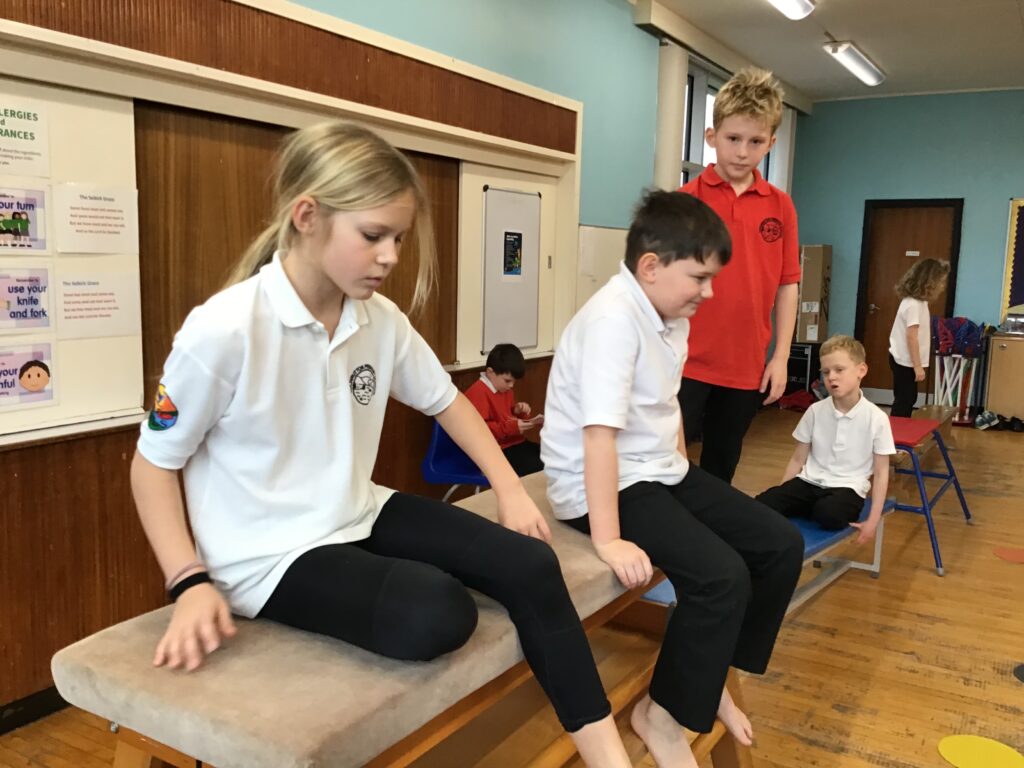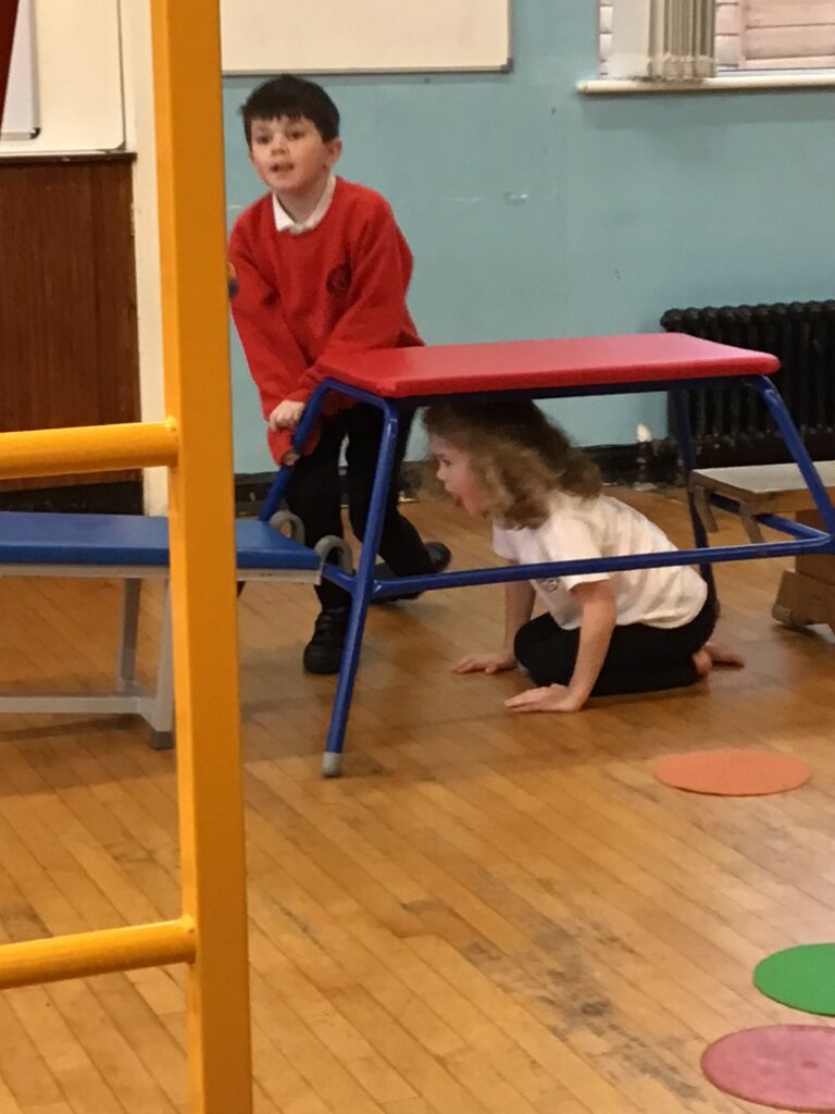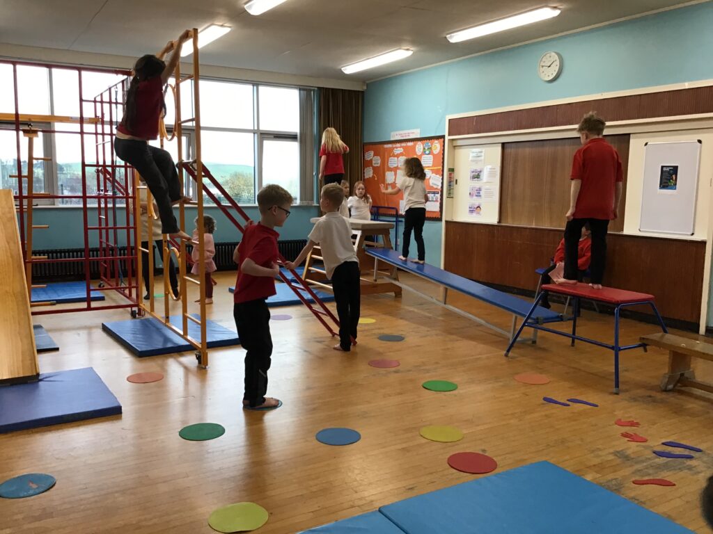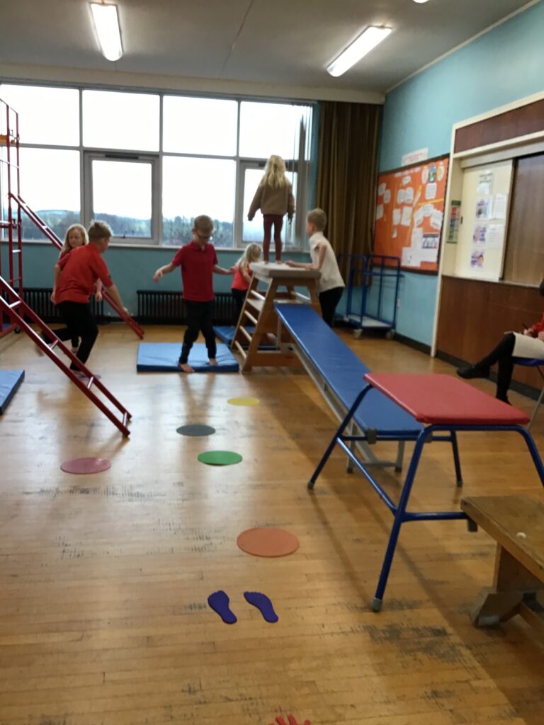 For our last gymnastics session with Ross we started with a stretching warm up, then we had the climbing frame out with a bar that you could swing over. We were also balancing and using the spring board. – Ollie