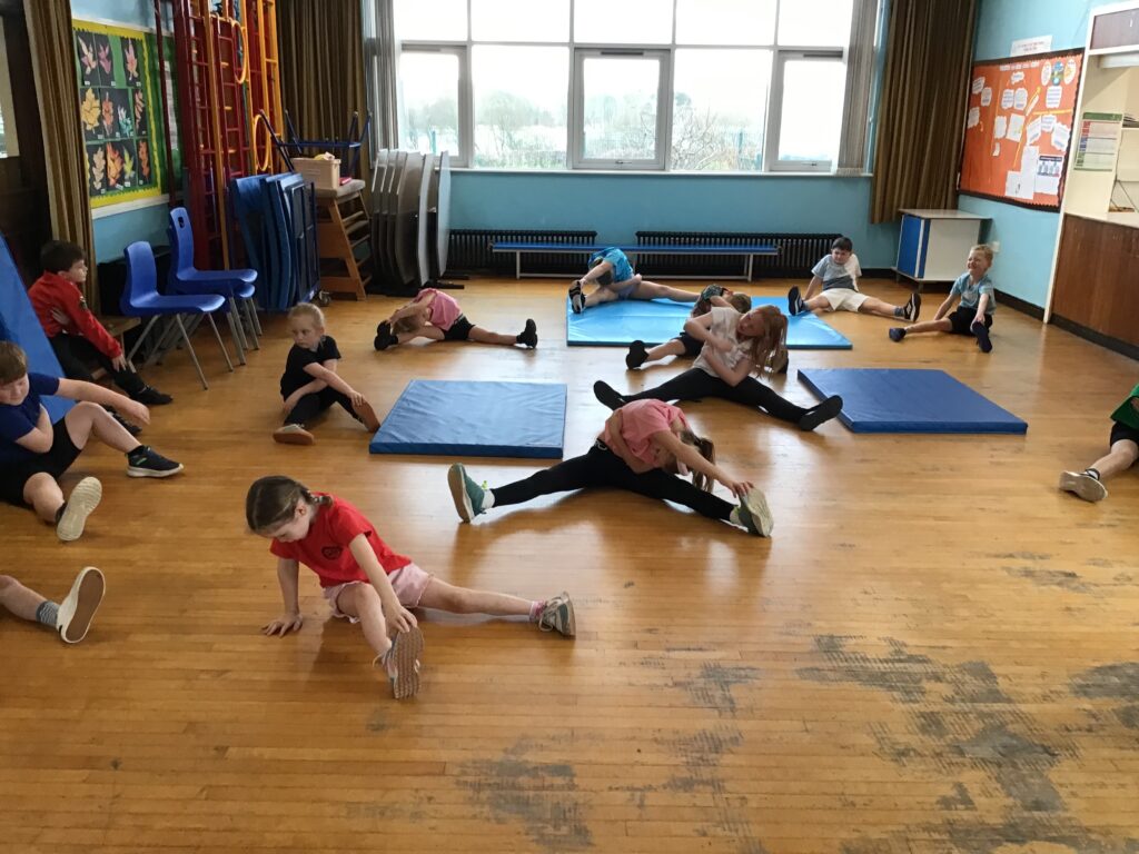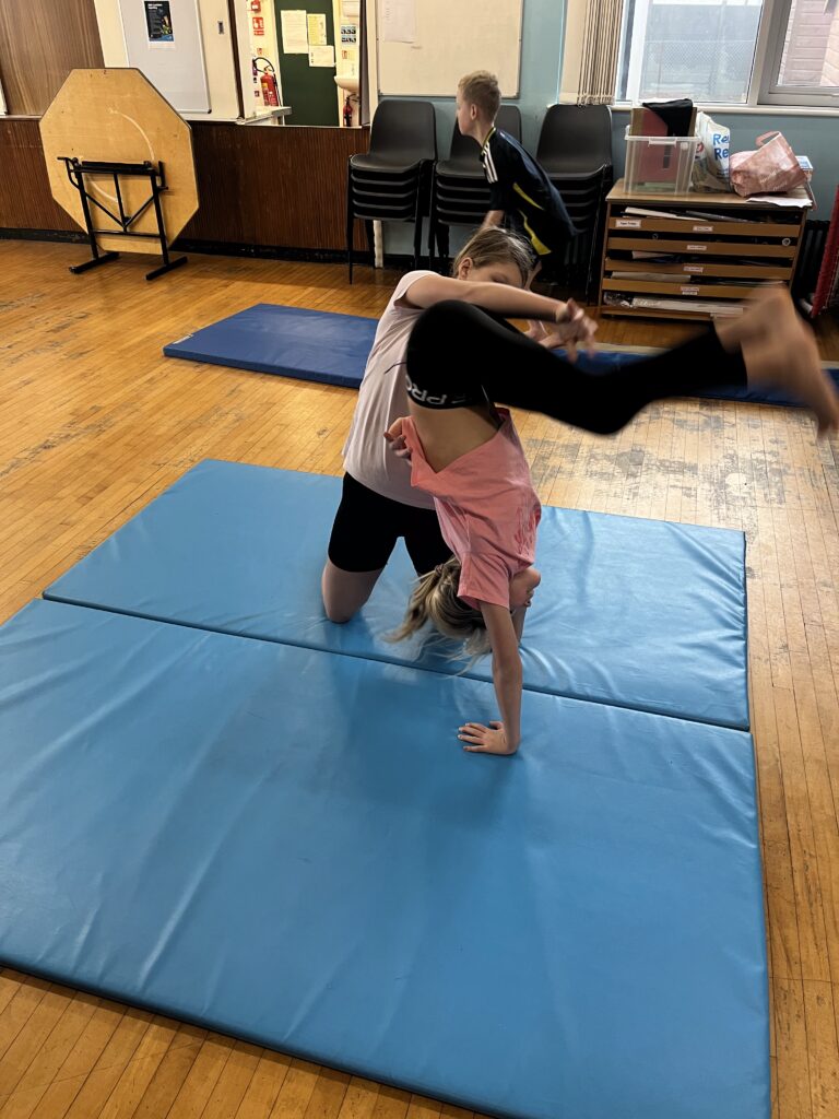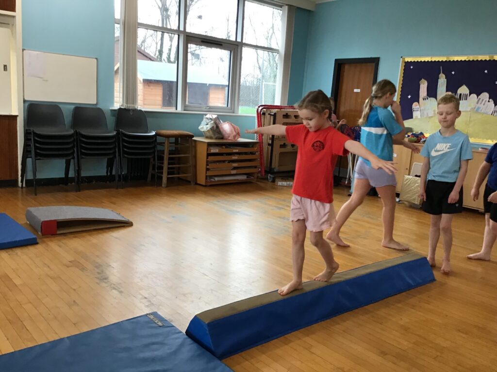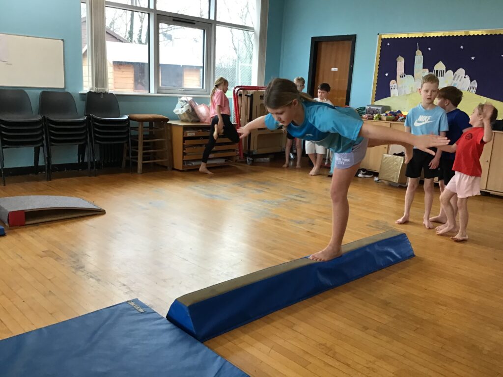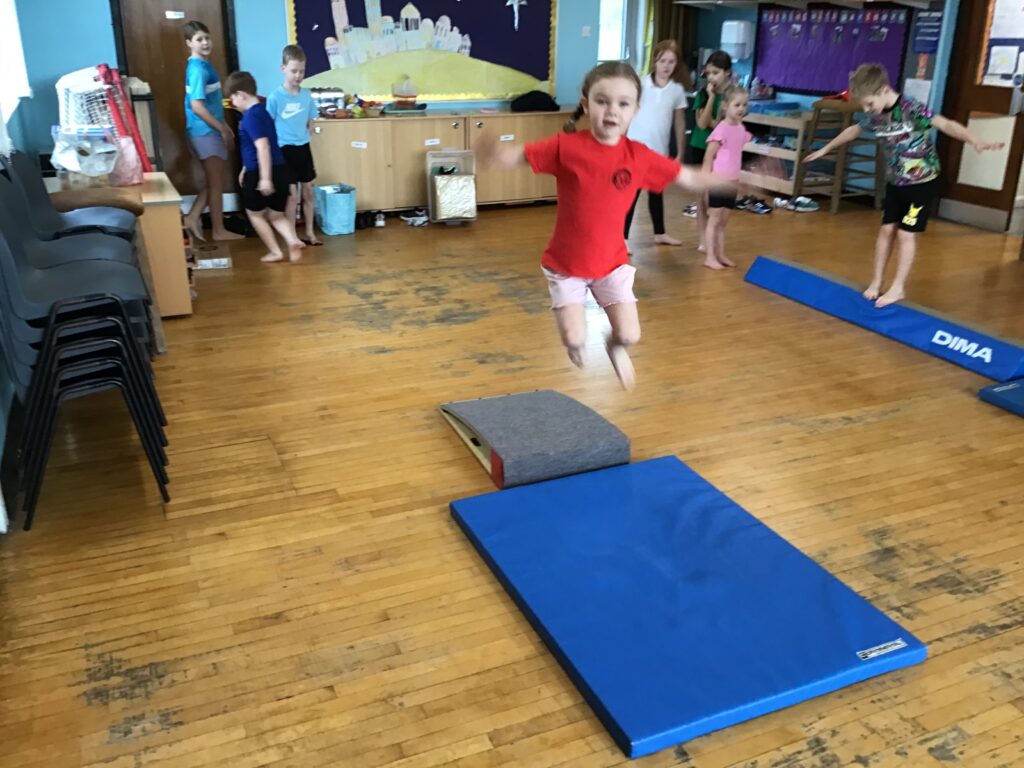 For gymnastics we were doing some balancing and jumping. We were learning how to land on our feet with the spring board. We had the horse out this week to go on and also the mats for different rolls. My favourite roll is the the handstand into a shoulder roll. – Kayden
