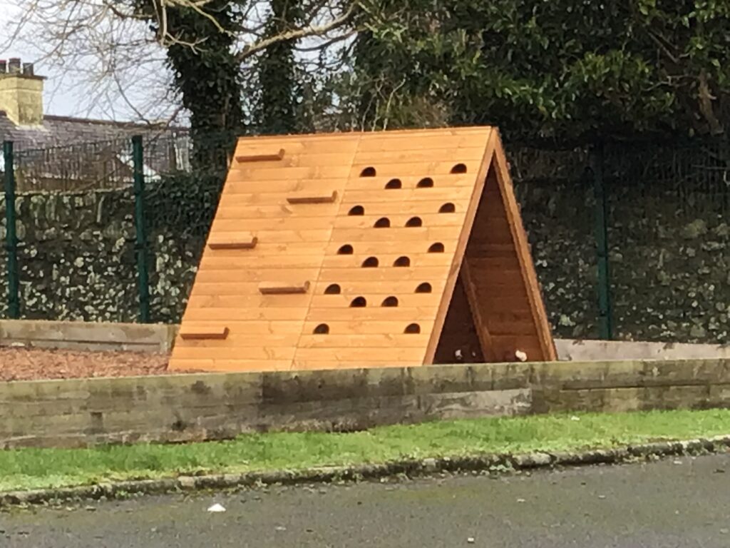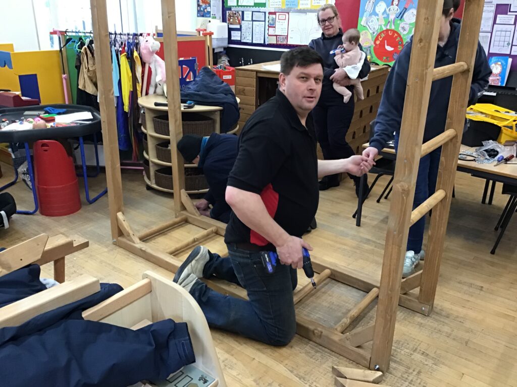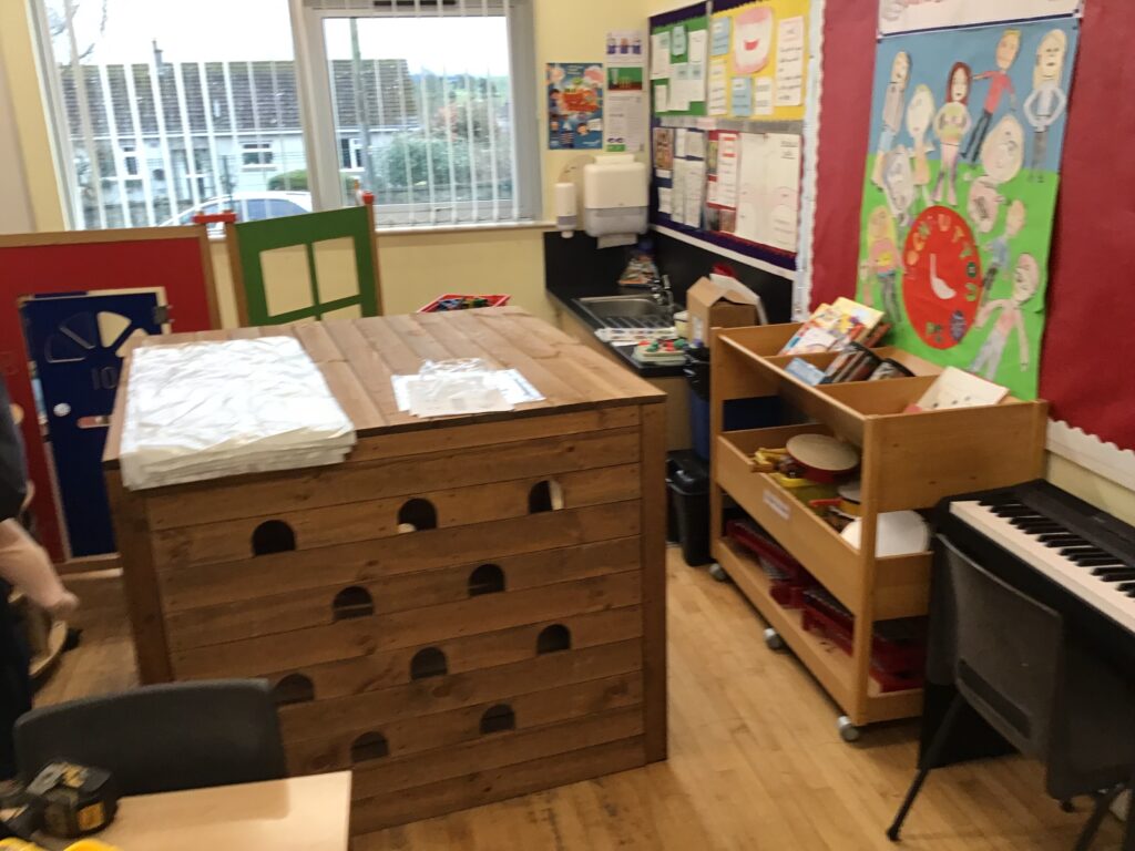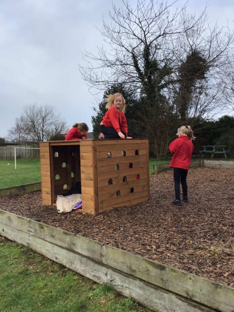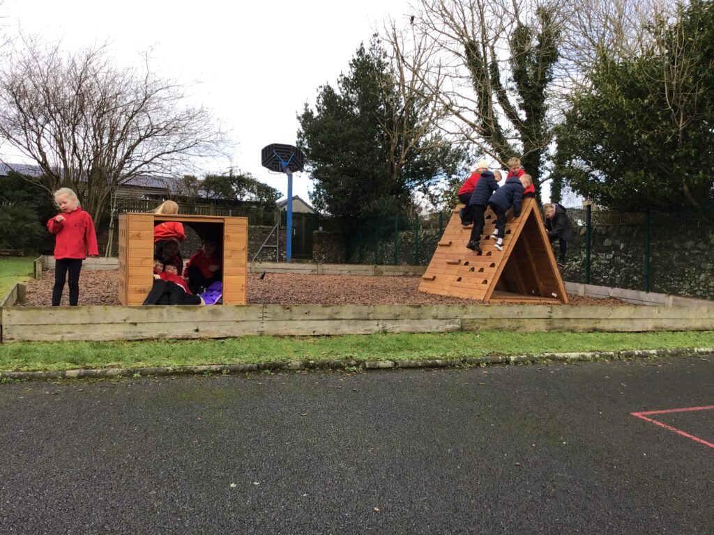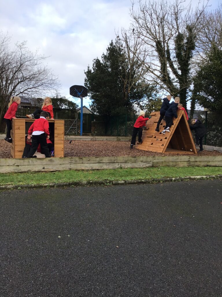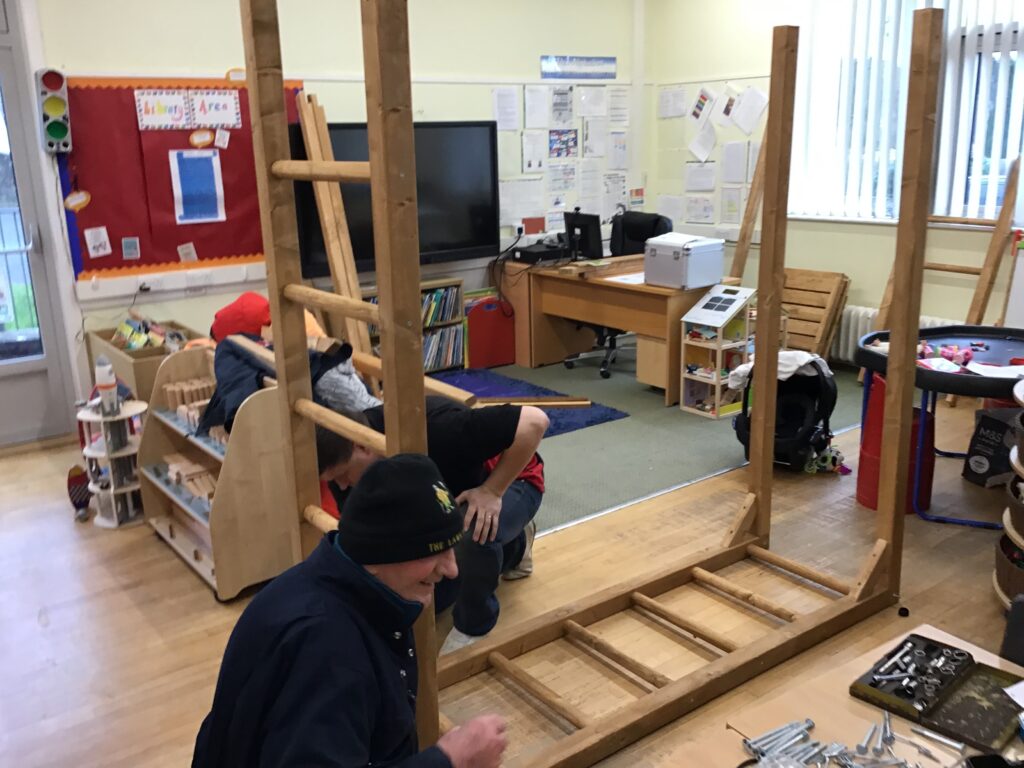 Some parents came in to help build our new climbing frame. There are monkey bars, a triangle pyramid that you can climb up and go inside and also a box where you can go inside and climb on top of it. I am enjoying playing with these! – Finley