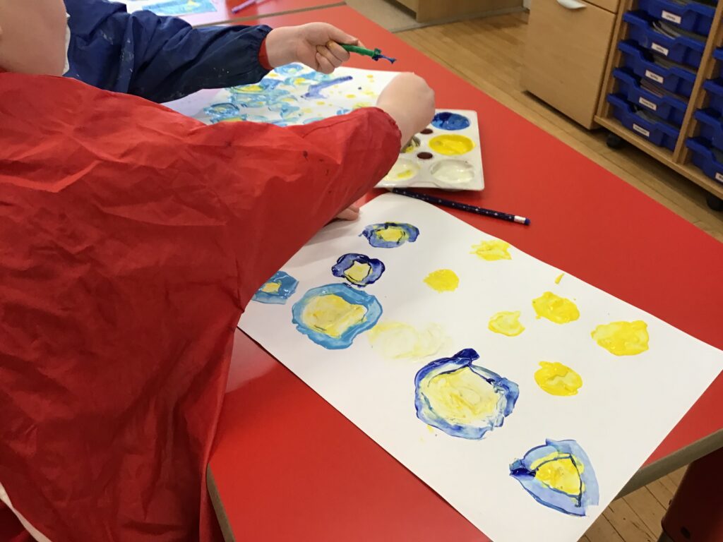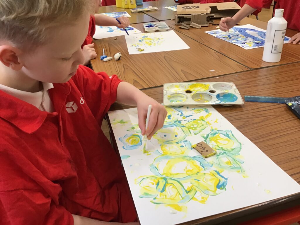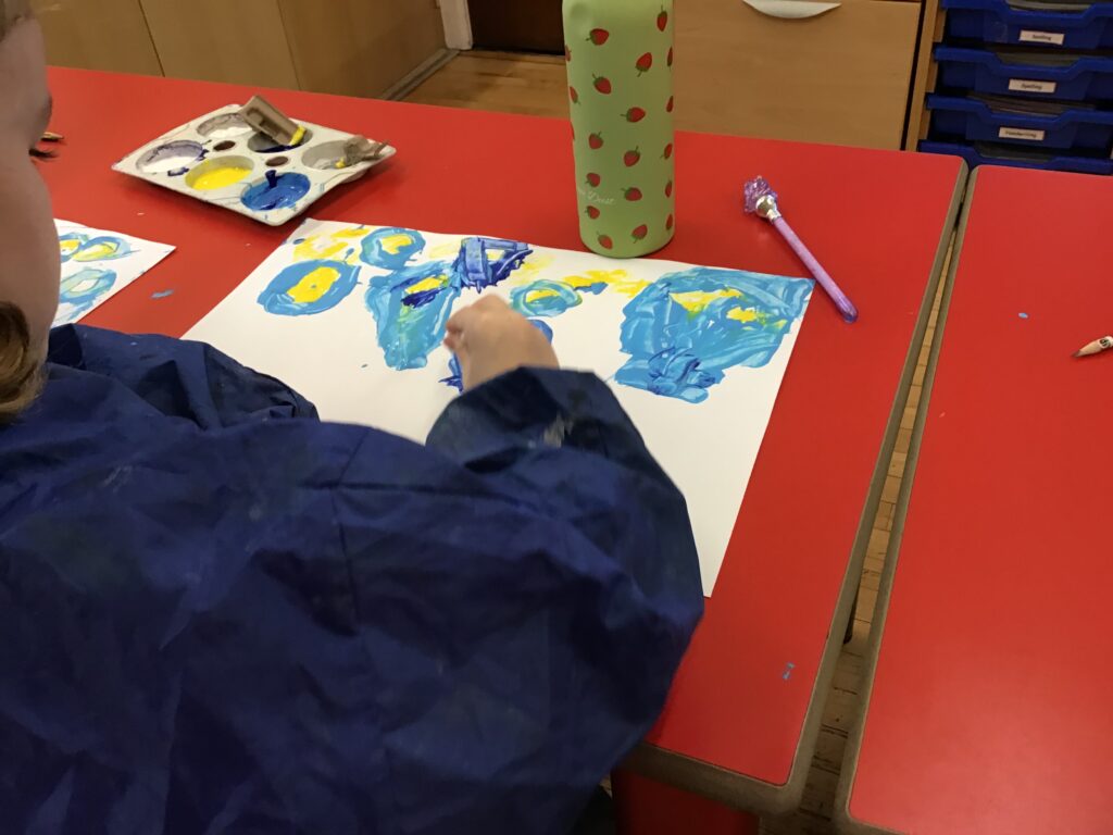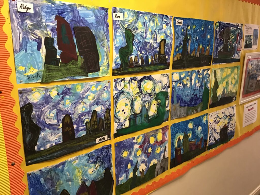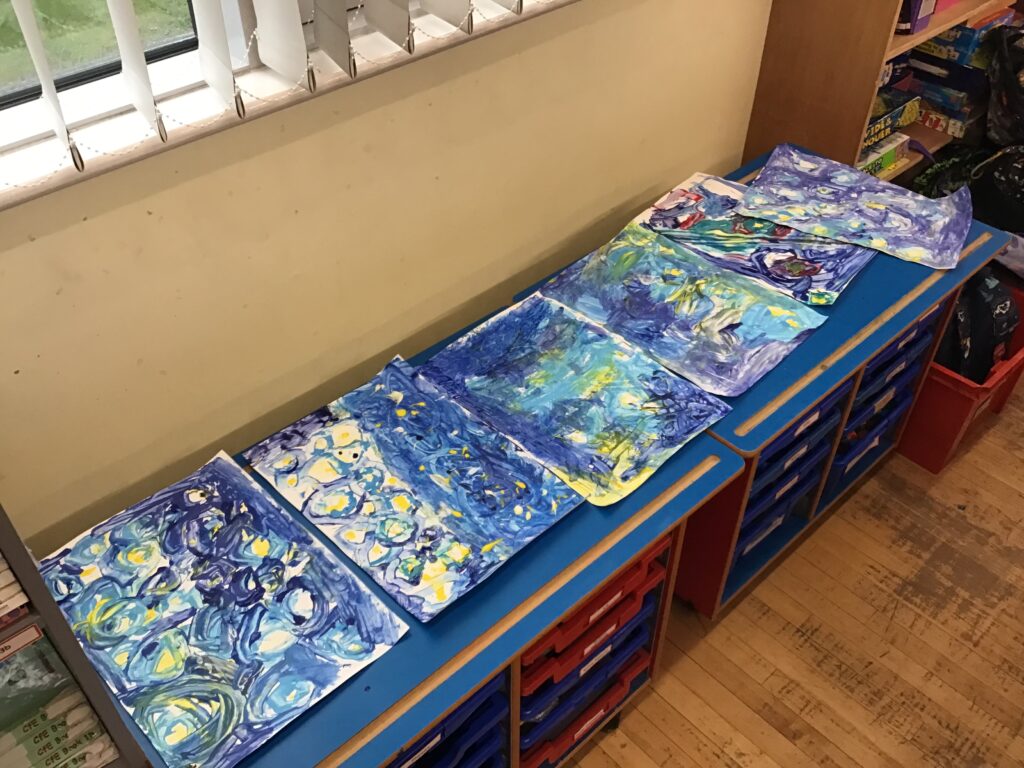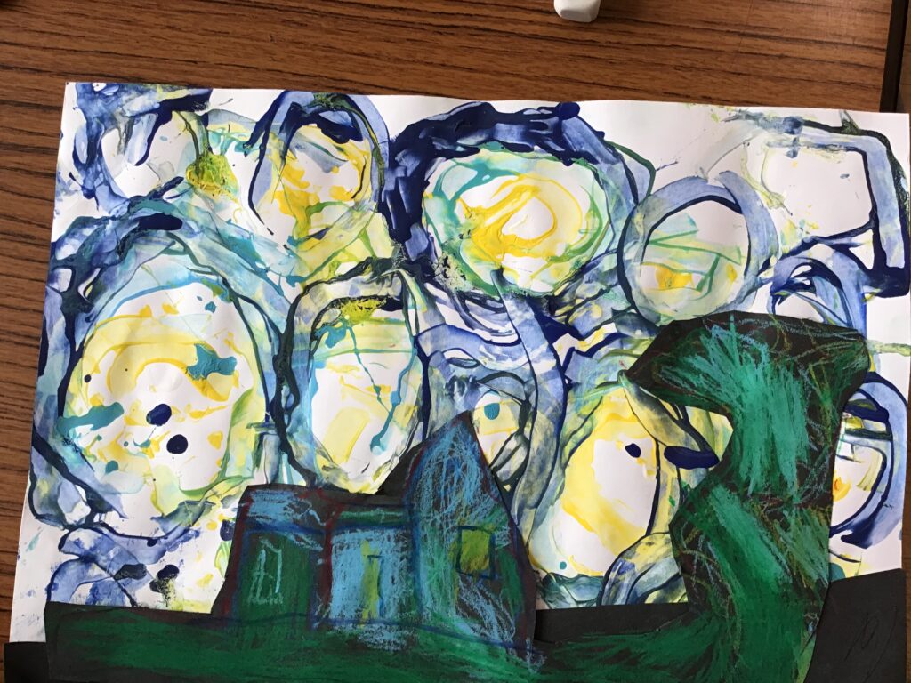 We were recreating Van Gogh paintings. We made different textures with the paint using glue spreaders and cardboard. We are going to add to them next week. – Aria
