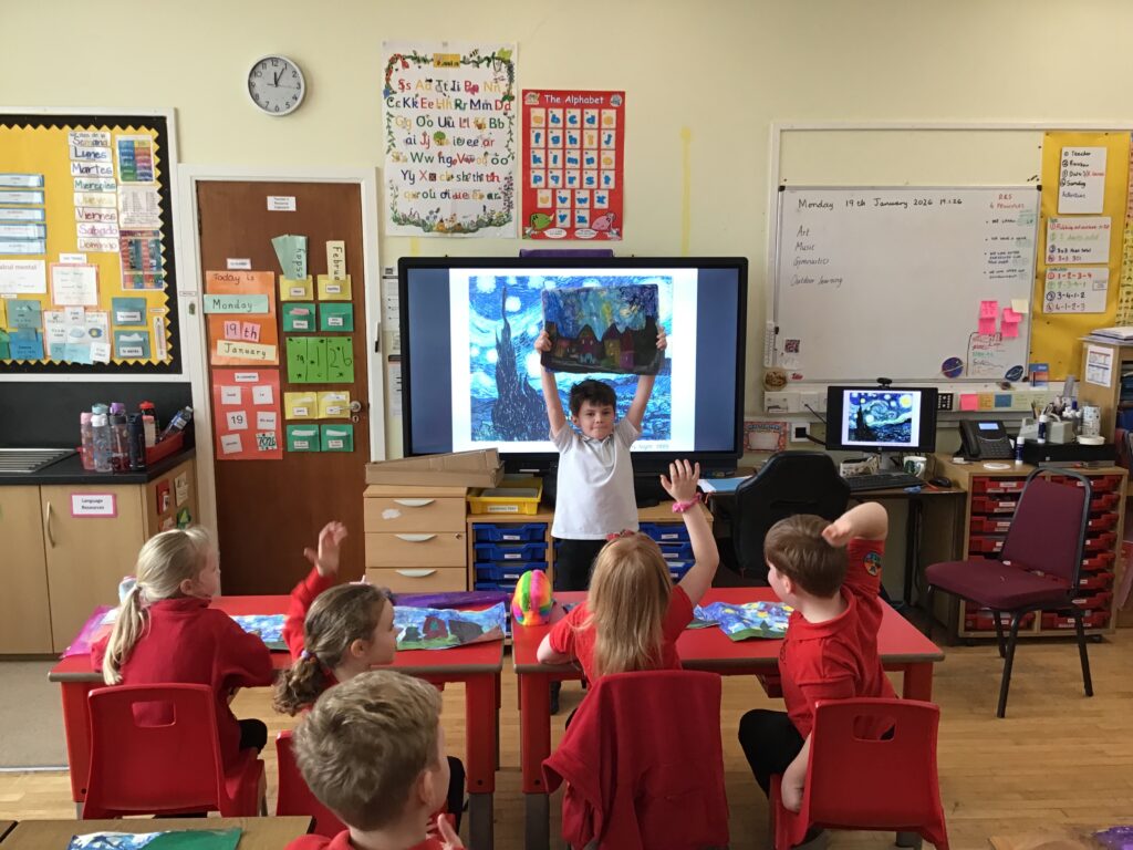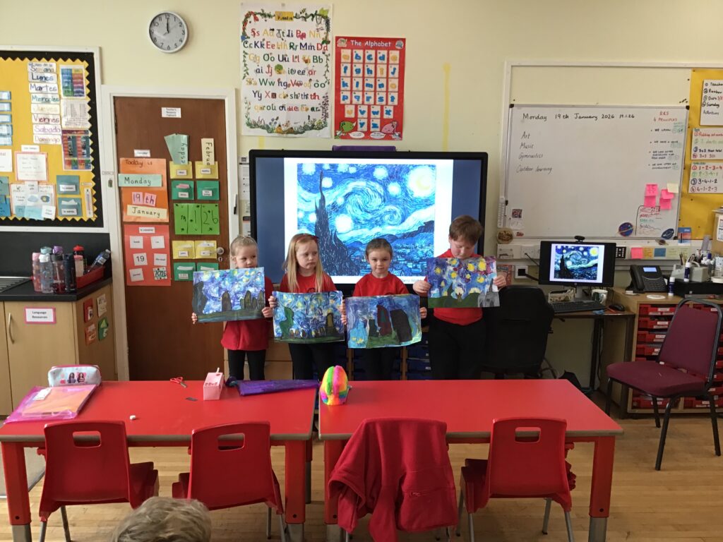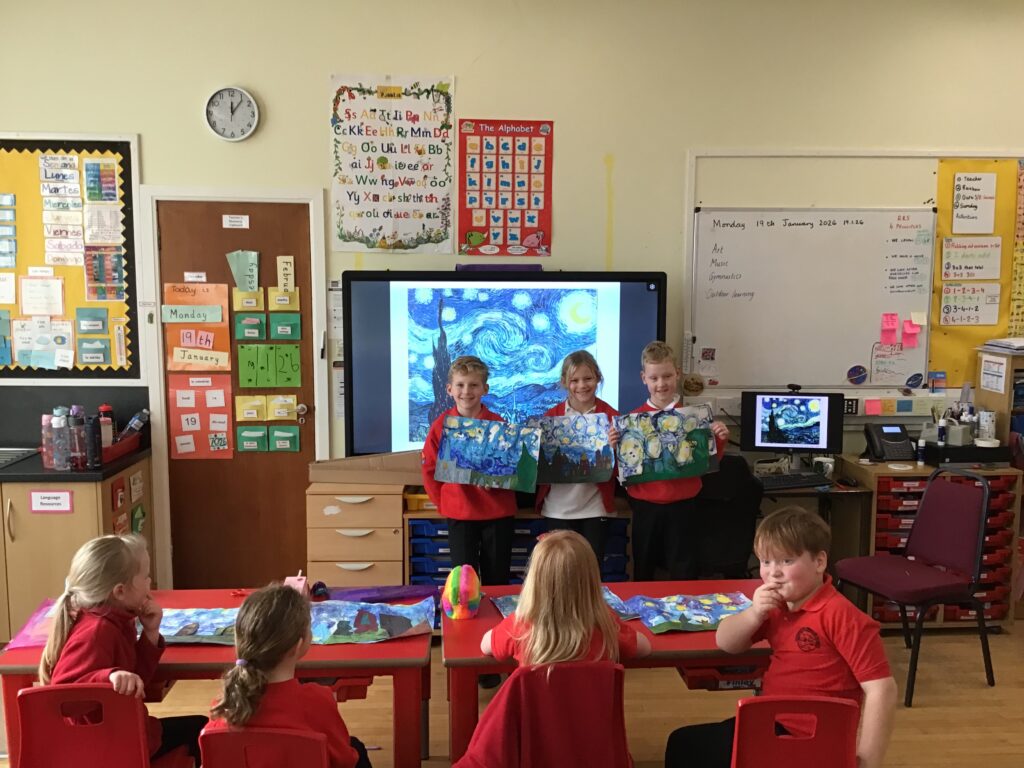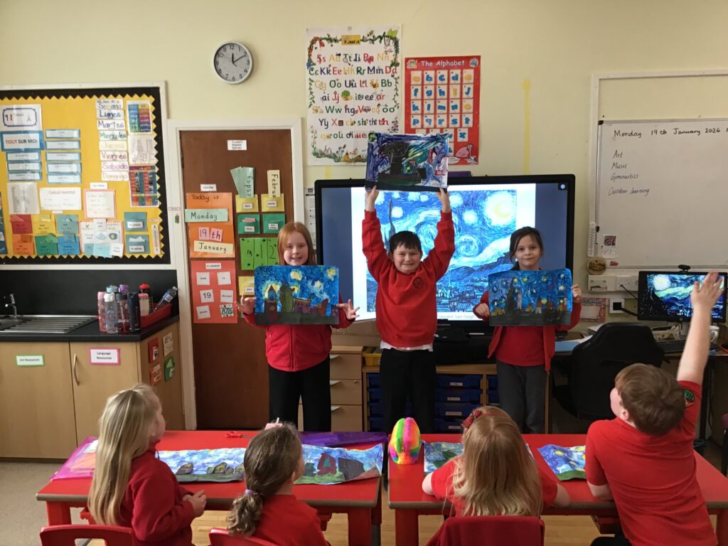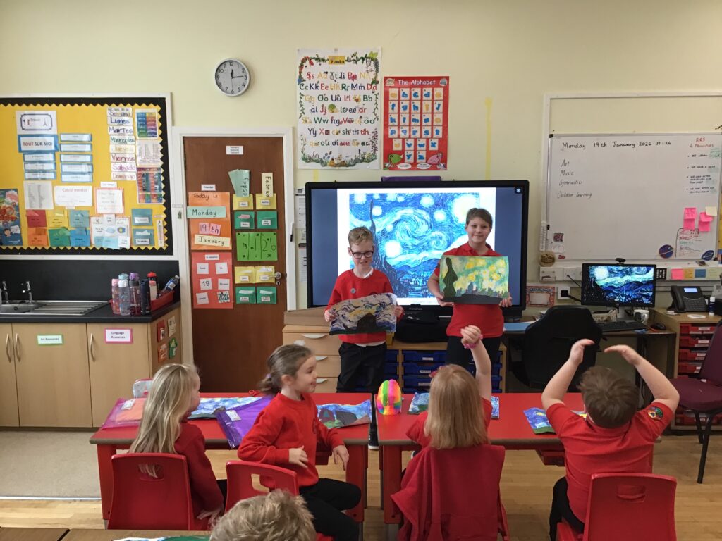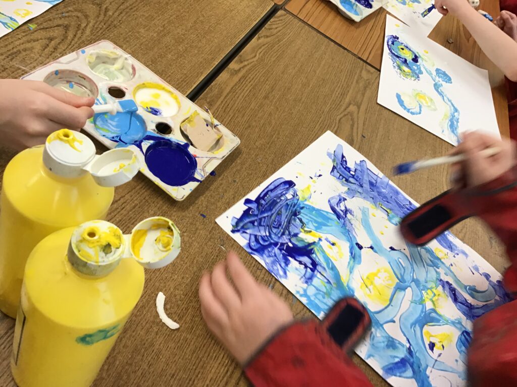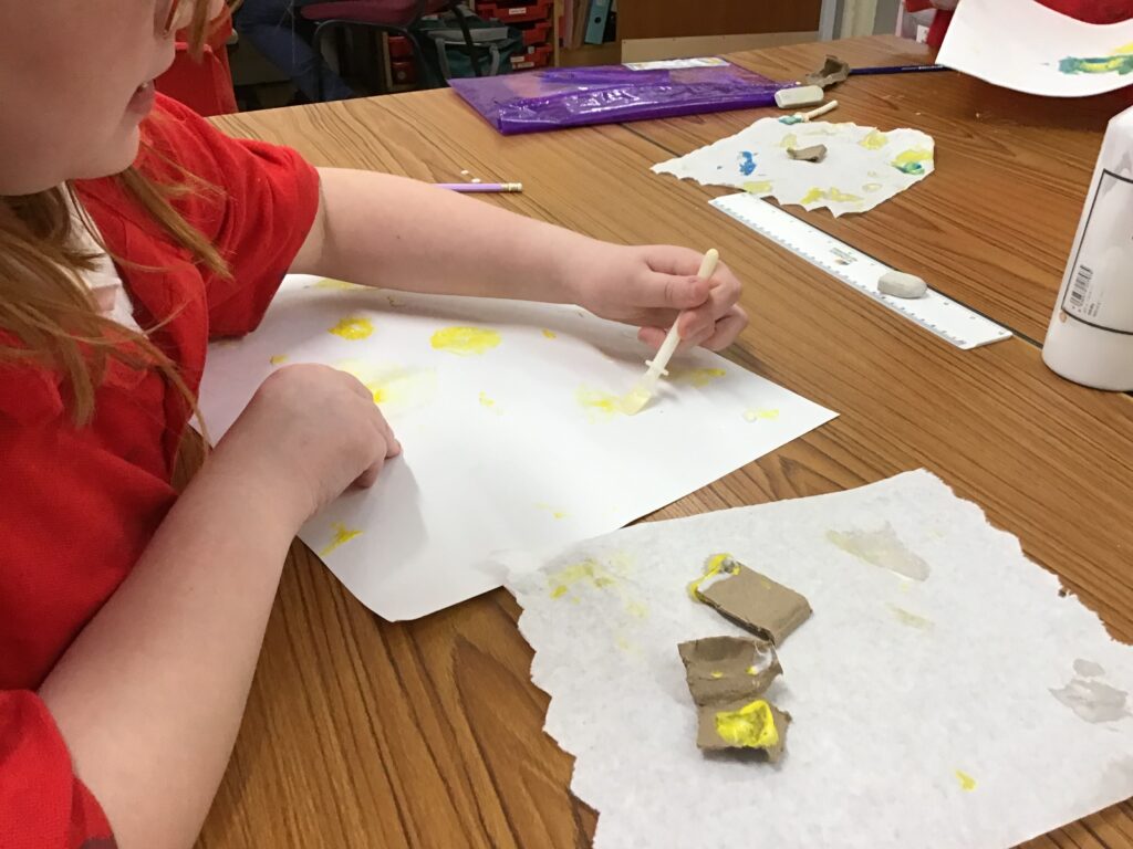 We were recreating Van Gogh paintings. We made different textures with the paint using glue spreaders and cardboard. We are going to add to them next week. – Aria