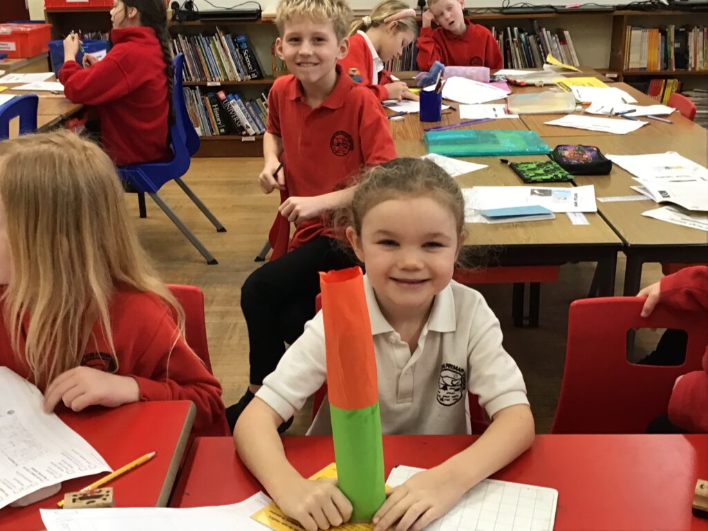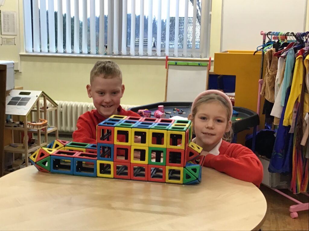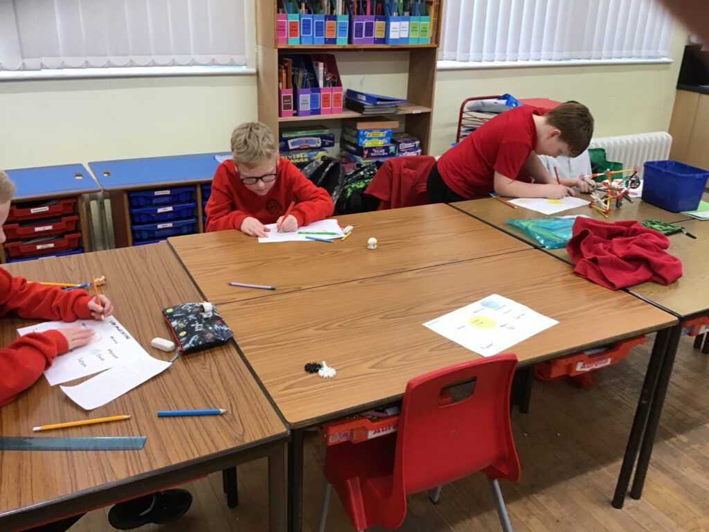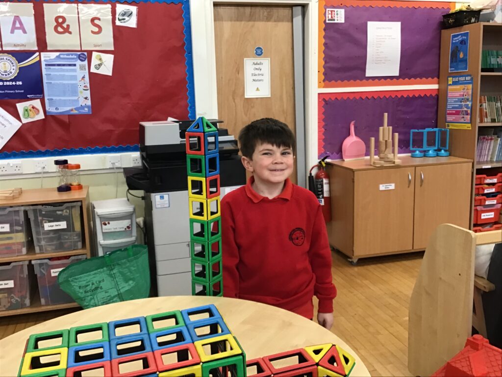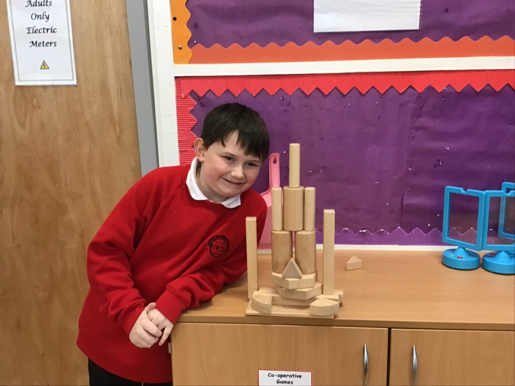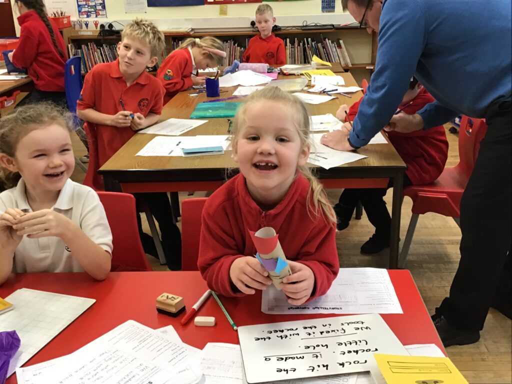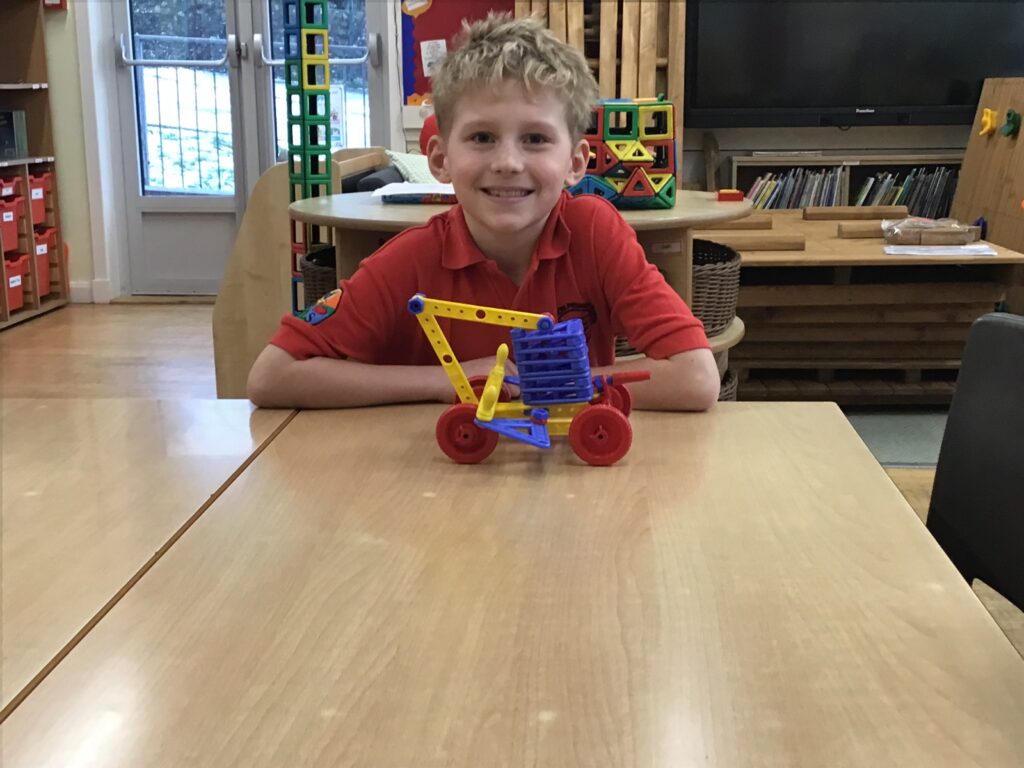 We were making rockets out of different things from the class. I made my one out of magnetic shapes. We then wrote a story of an adventure with the rocket, my one went to the dark side of the moon! – Connor