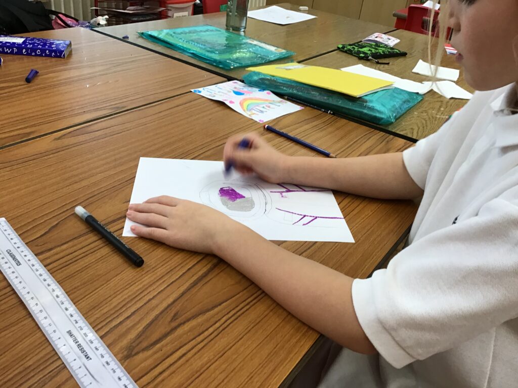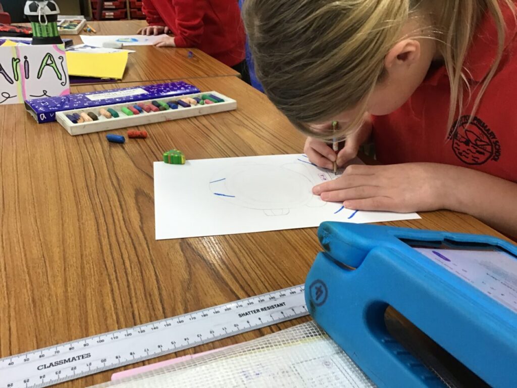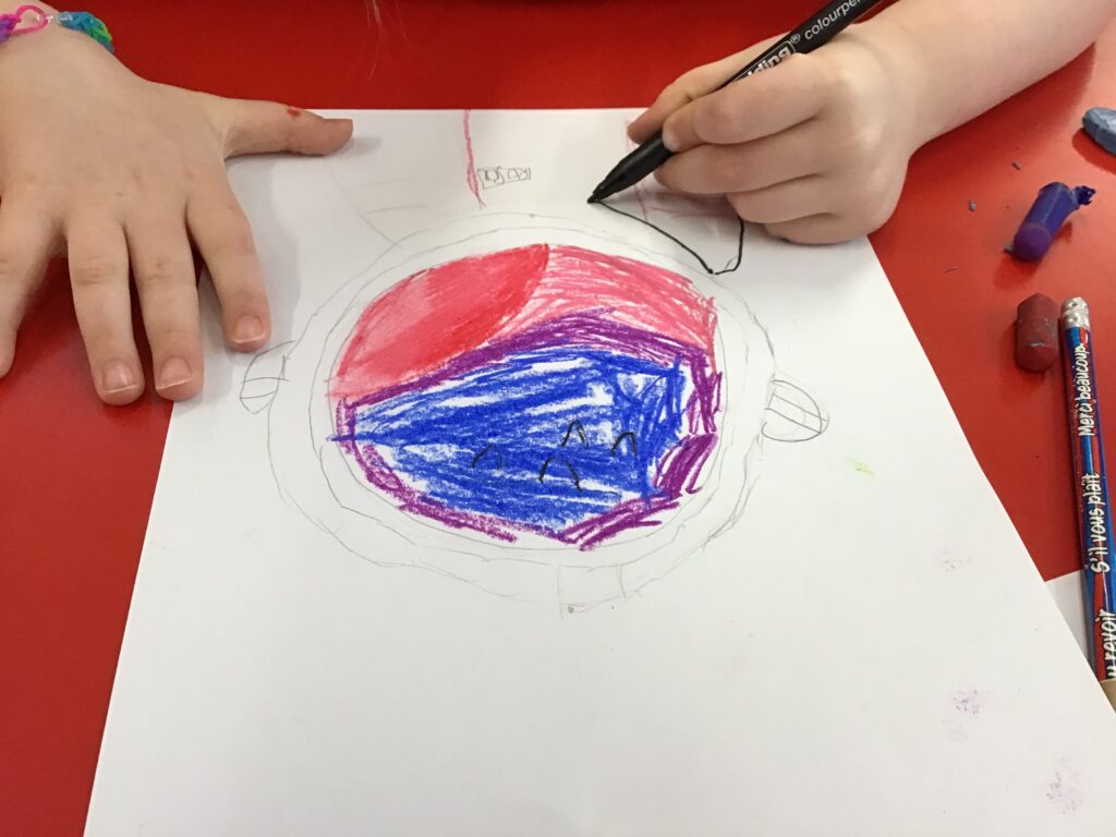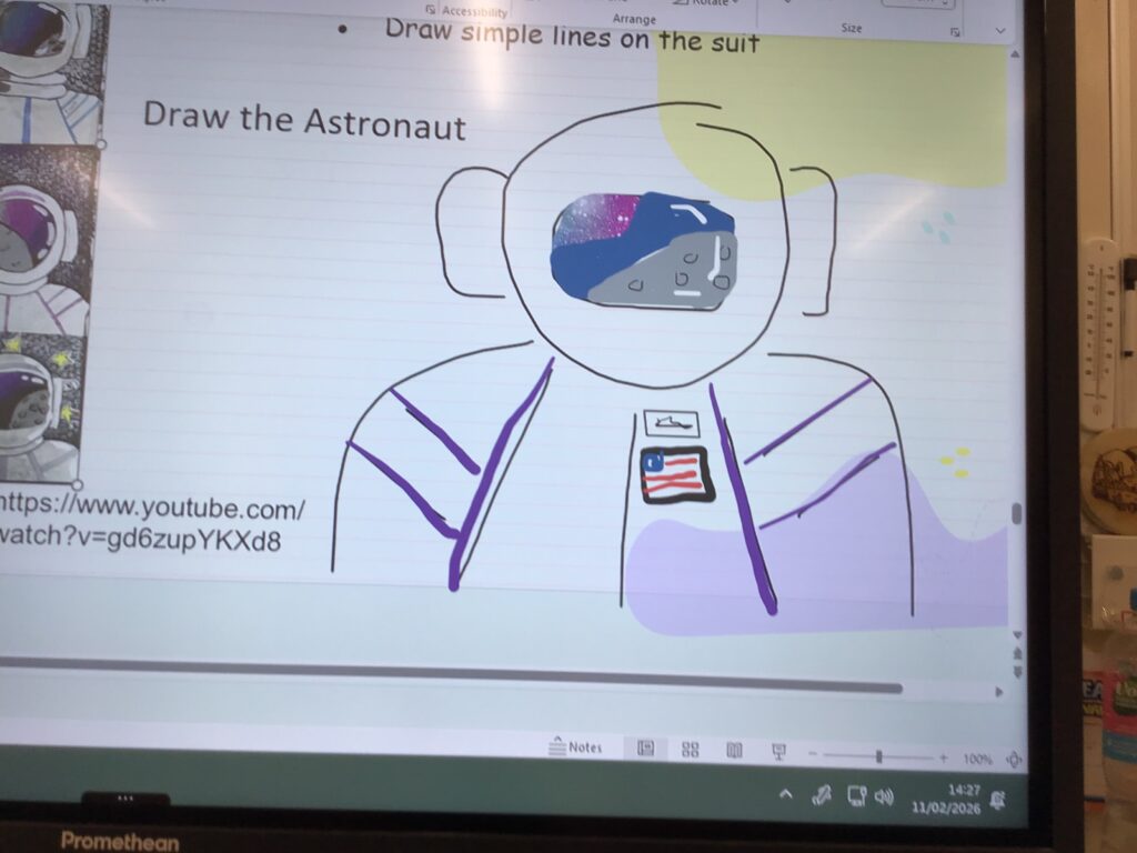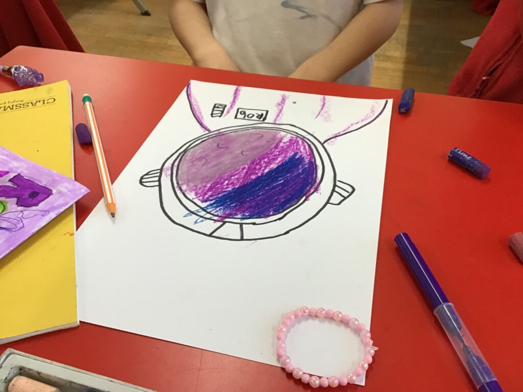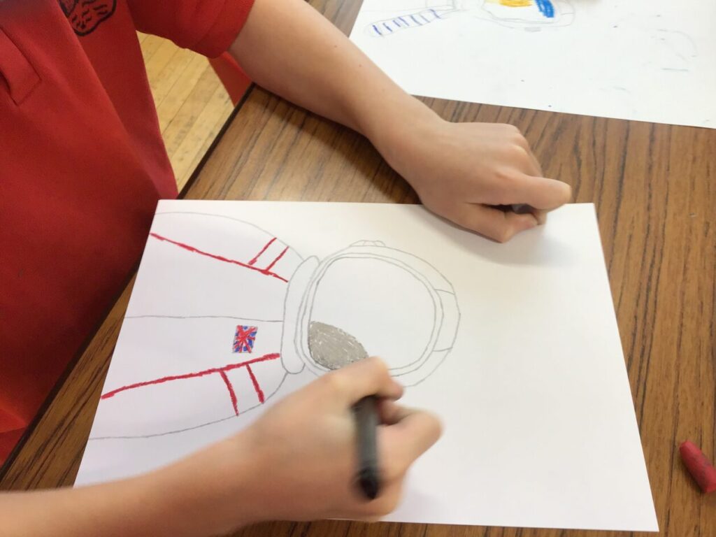 We were drawing and learning about astronauts. We drew the astronaut and added detail. We then coloured the visor in and added a flag and our name onto the suit. – Aurelia